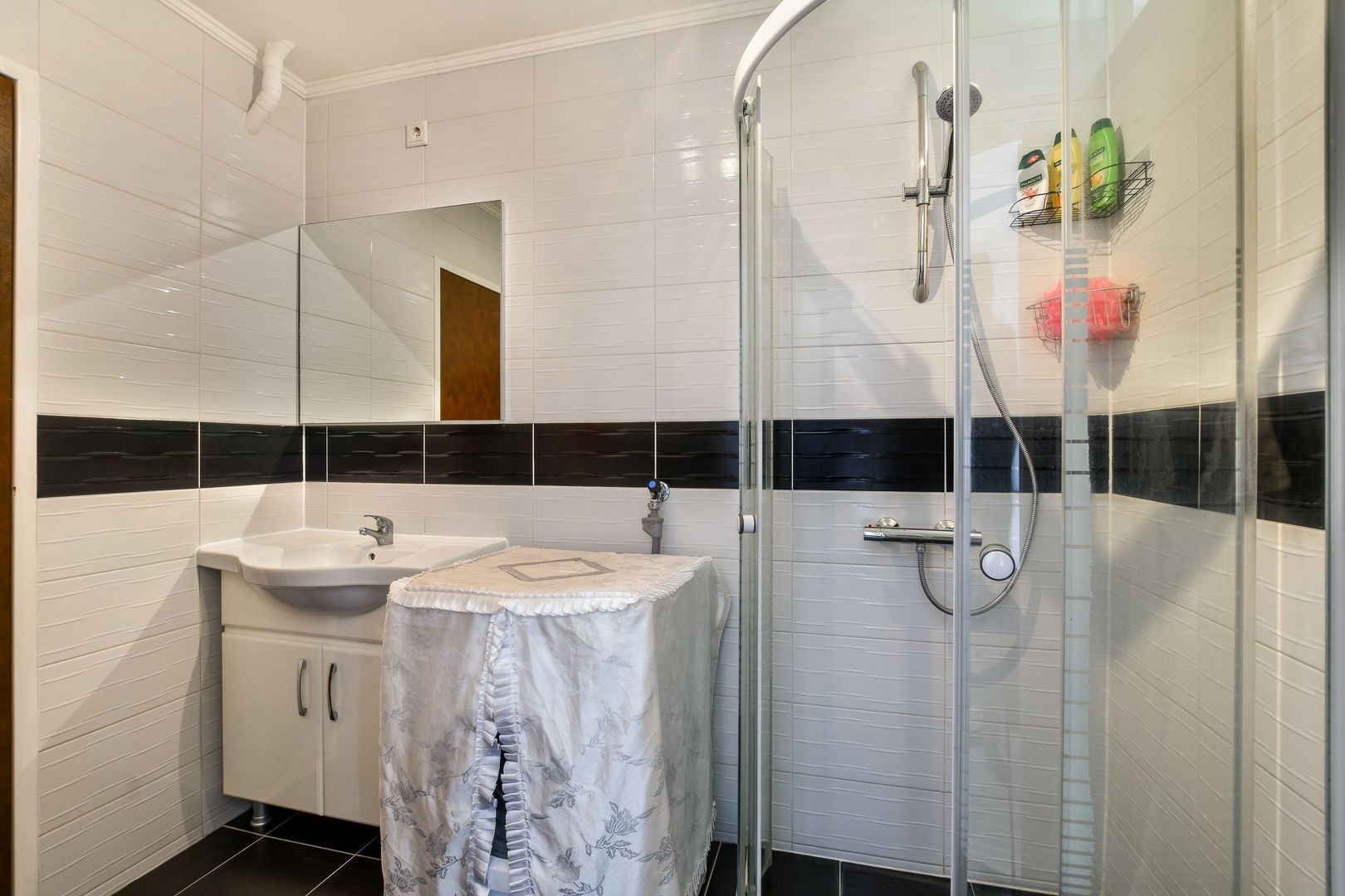 Moderne wit en antraciet betegelde badkamer met grote douchecabine, thermostaatkraan, wastafelmeubel, aansluiting wasmachine, plafond met ingebouwde verlichting en toegang naar aparte toiletruimte. De badkamer is ook via de hoofdslaapkamer bereikbaar.