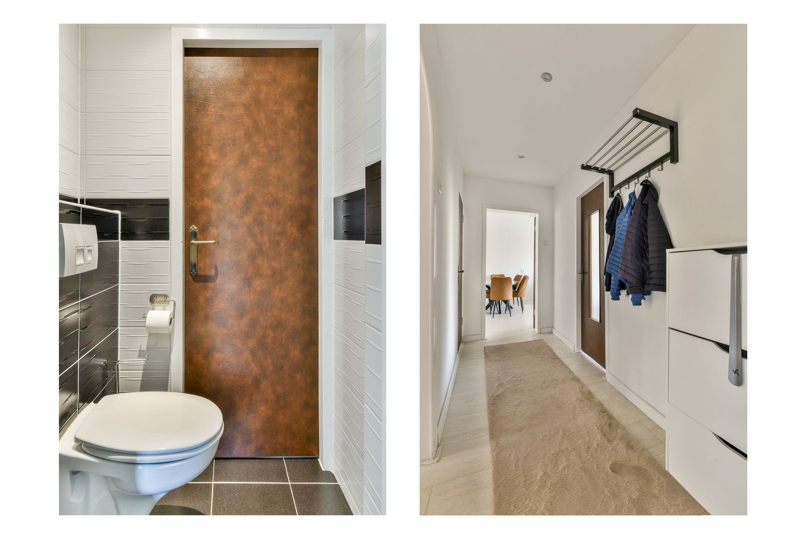 Entree, ruime hal met laminaatvloer en plafond met ingebouwde verlichting, inbouwkast en toegang naar moderne, wit met antraciet betegelde toiletruimte met zwevend toilet.