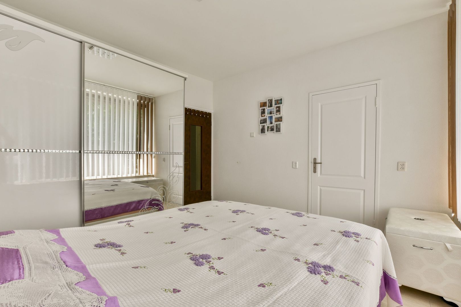 Slaapkamer van 11 m2 en van 9 m2, beide met toegang naar royaal tweede balkon van 8 m2, heerlijk op het zonnige zuidwesten gelegen, betegeld en met zonwering en aluminium hekwerk.