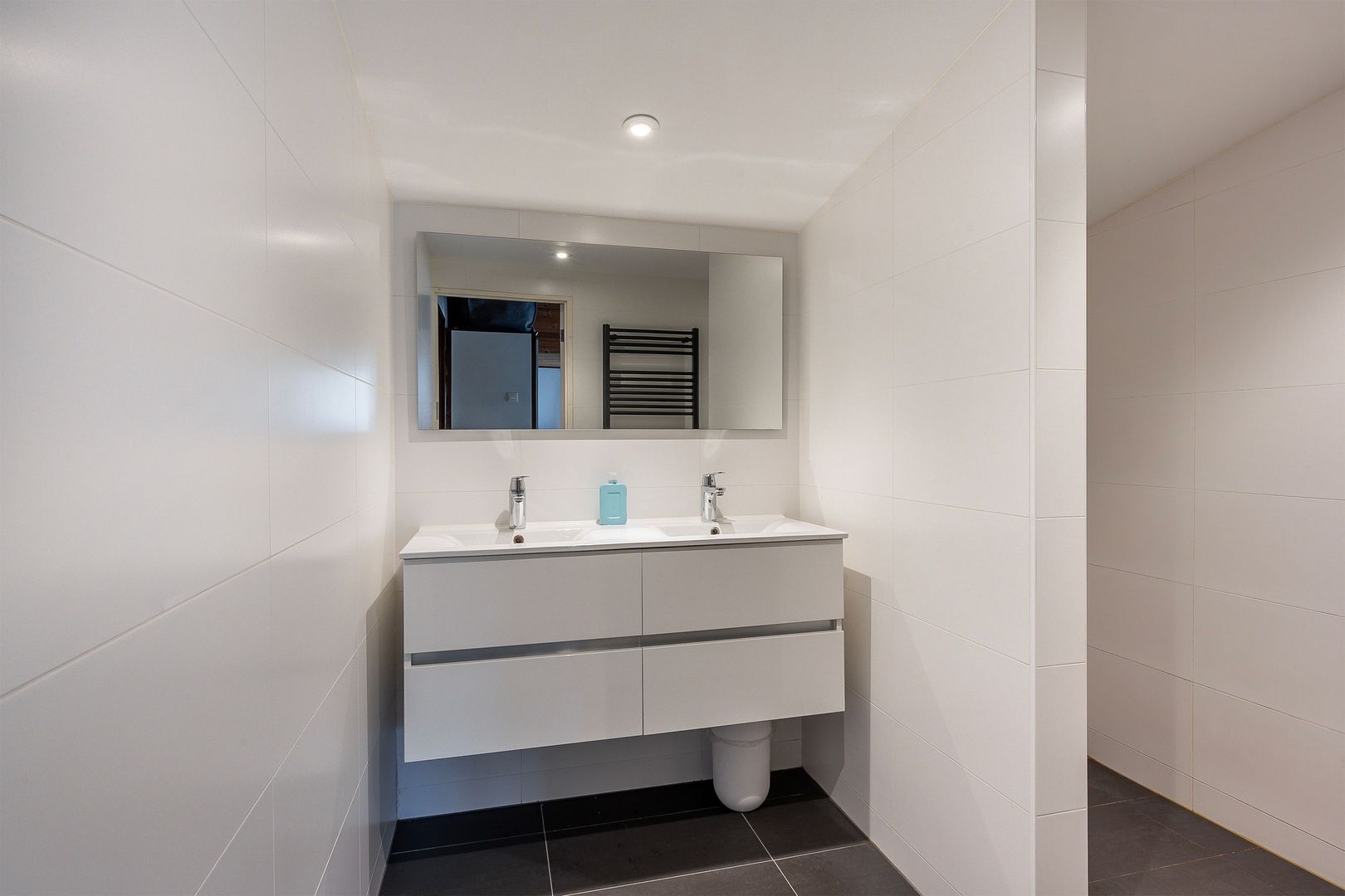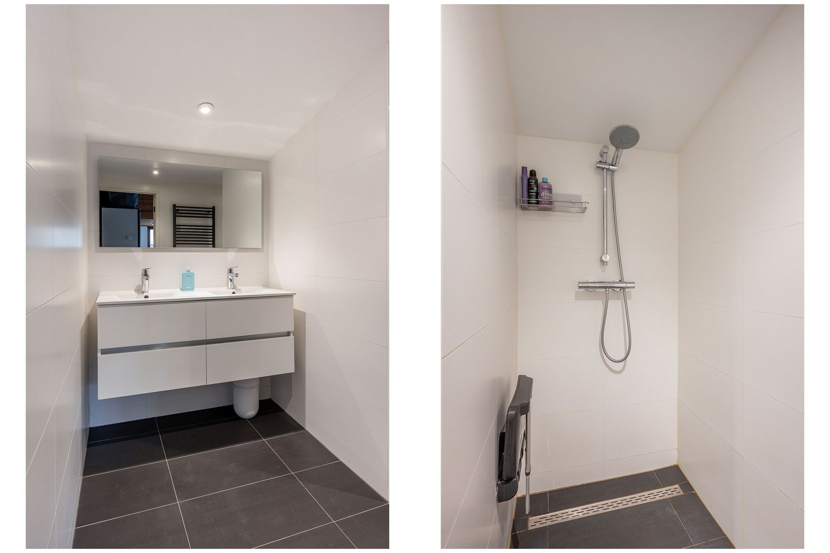 Moderne badkamer met inloopdouche en dubbele wastafel. Het toilet is separaat van de badkamer.