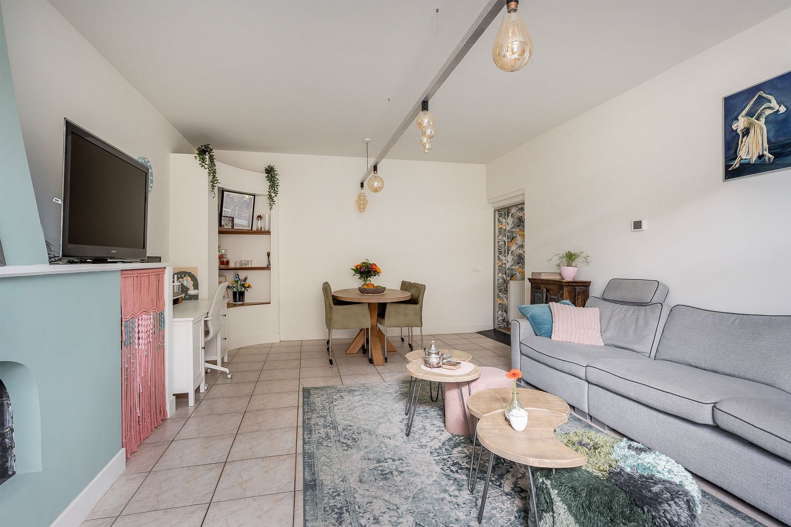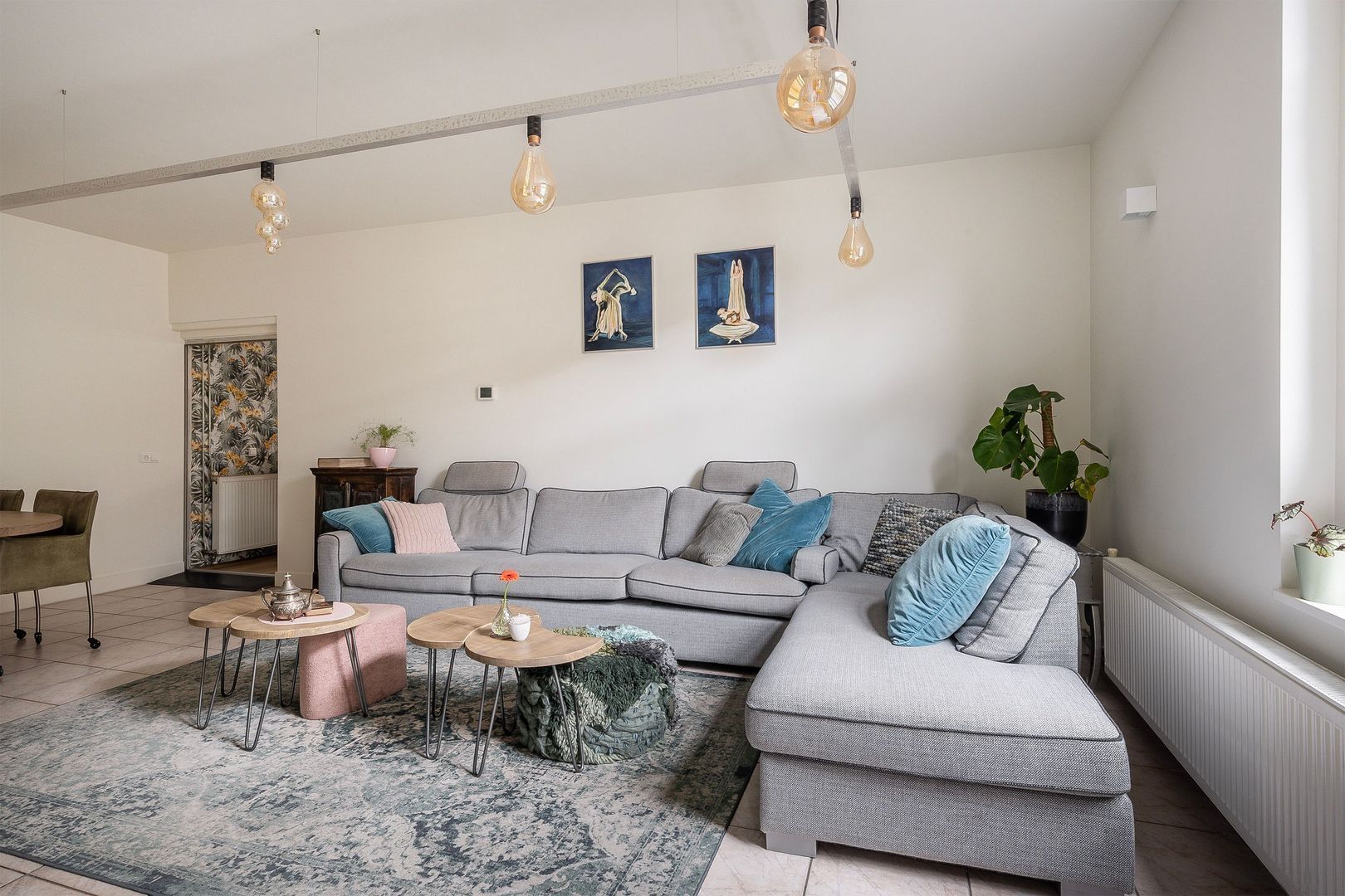 Ruime woonkamer met hoge plafonds wat een extra ruimtelijk effect geeft. De woonkamer is voorzien van gestuukte wanden en een gestuukt plafond. De vloer is voorzien van plavuizen.