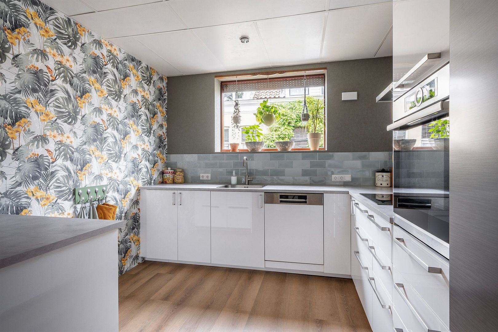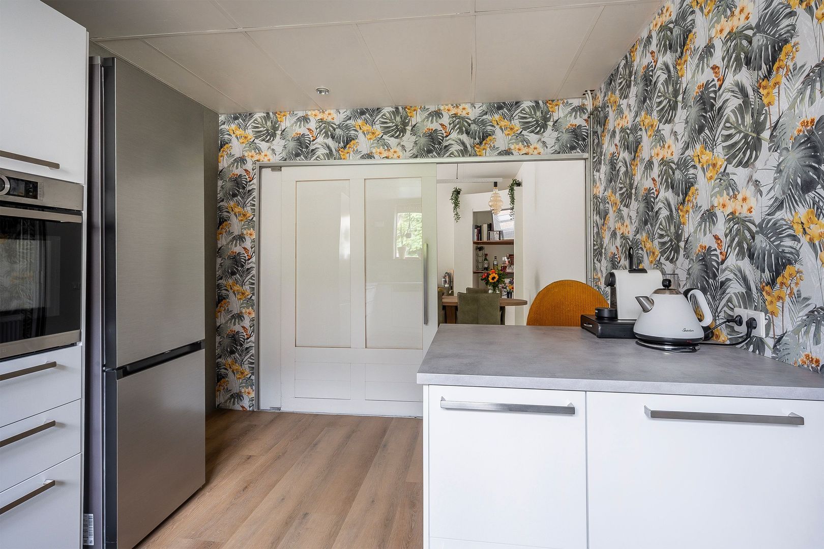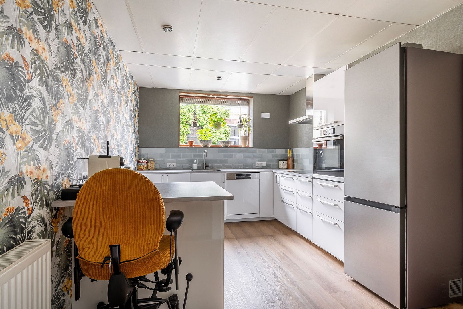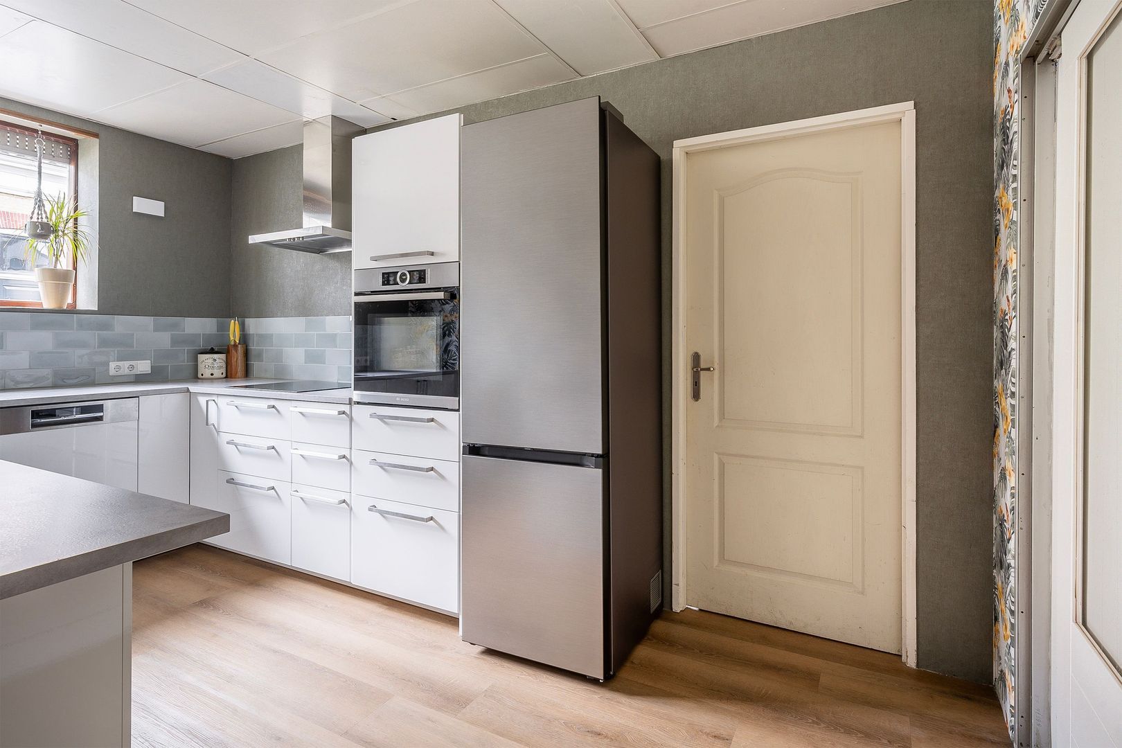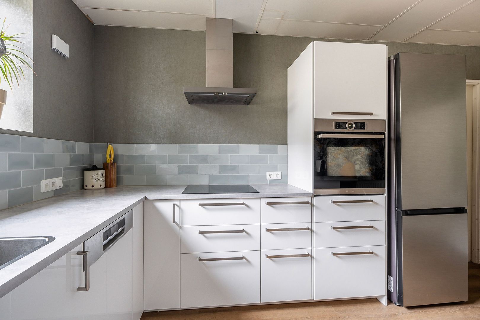 Via de woonkamer betreedt u de sfeervolle, luxe keuken welke in 2022 is geplaatst. Er is gekozen voor een keukenblok in hoekopstelling met een los schiereiland welke tevens als bar fungeert. De keuken is voorzien van hoogglans witte fronten, een lichtgrijs werkblad en de navolgende inbouwapparatuur; vaatwasser, close-in boiler, oven, inductie kookplaat en een afzuigkap.
