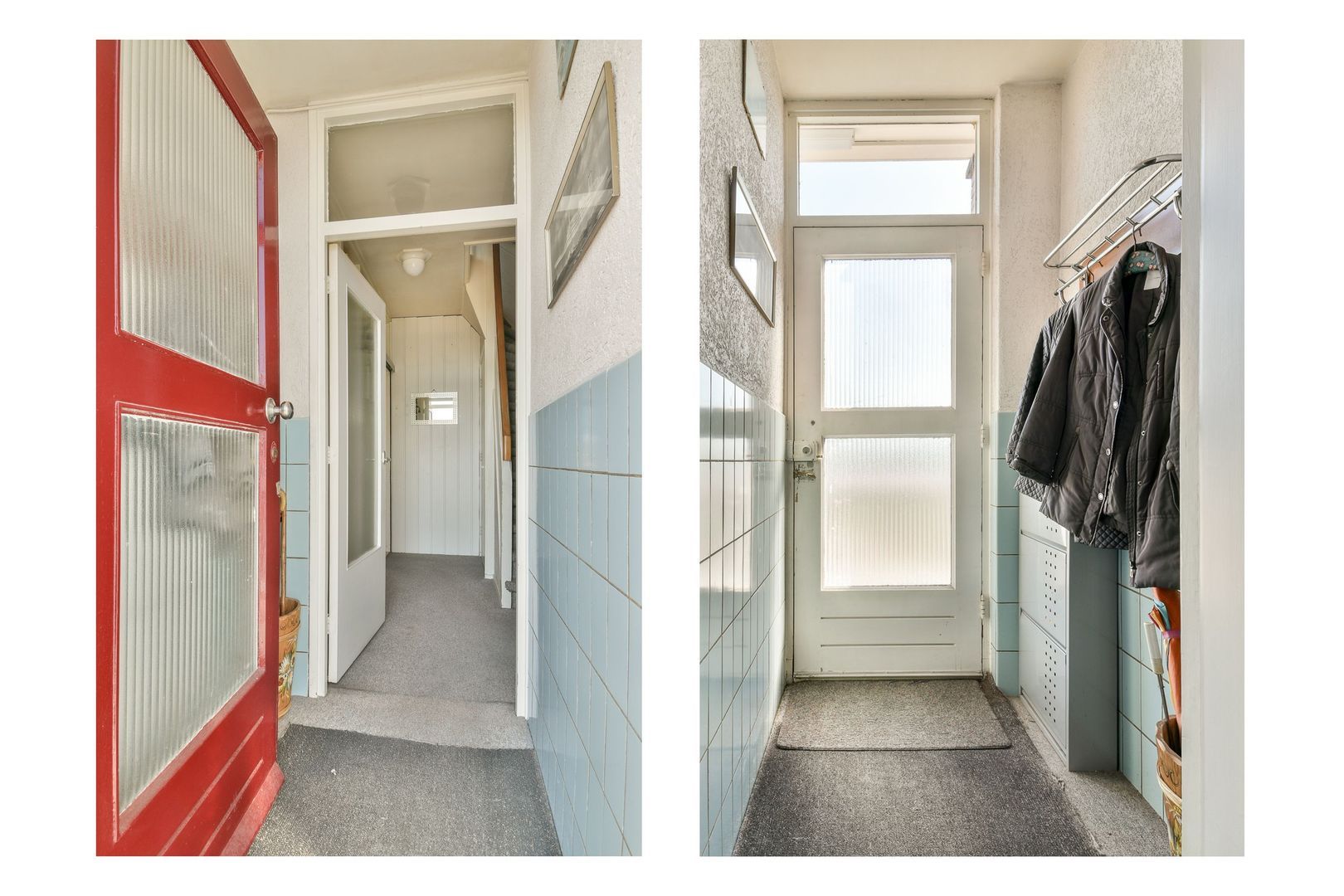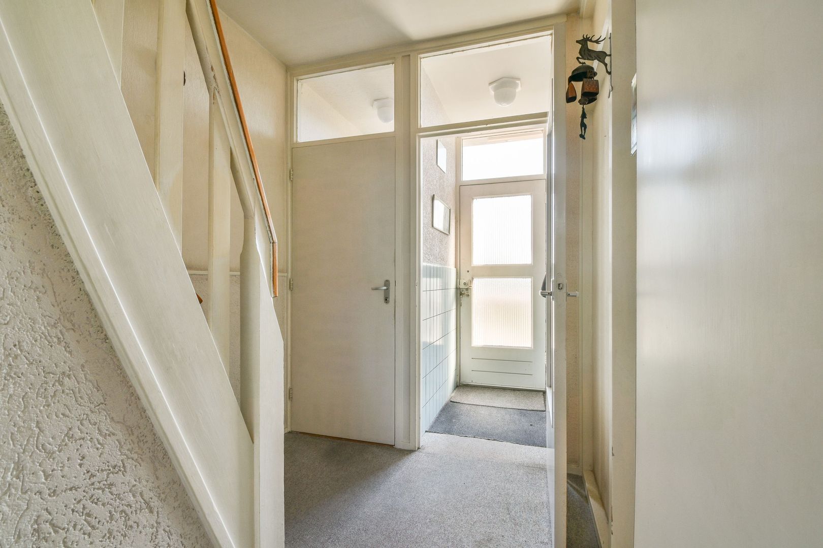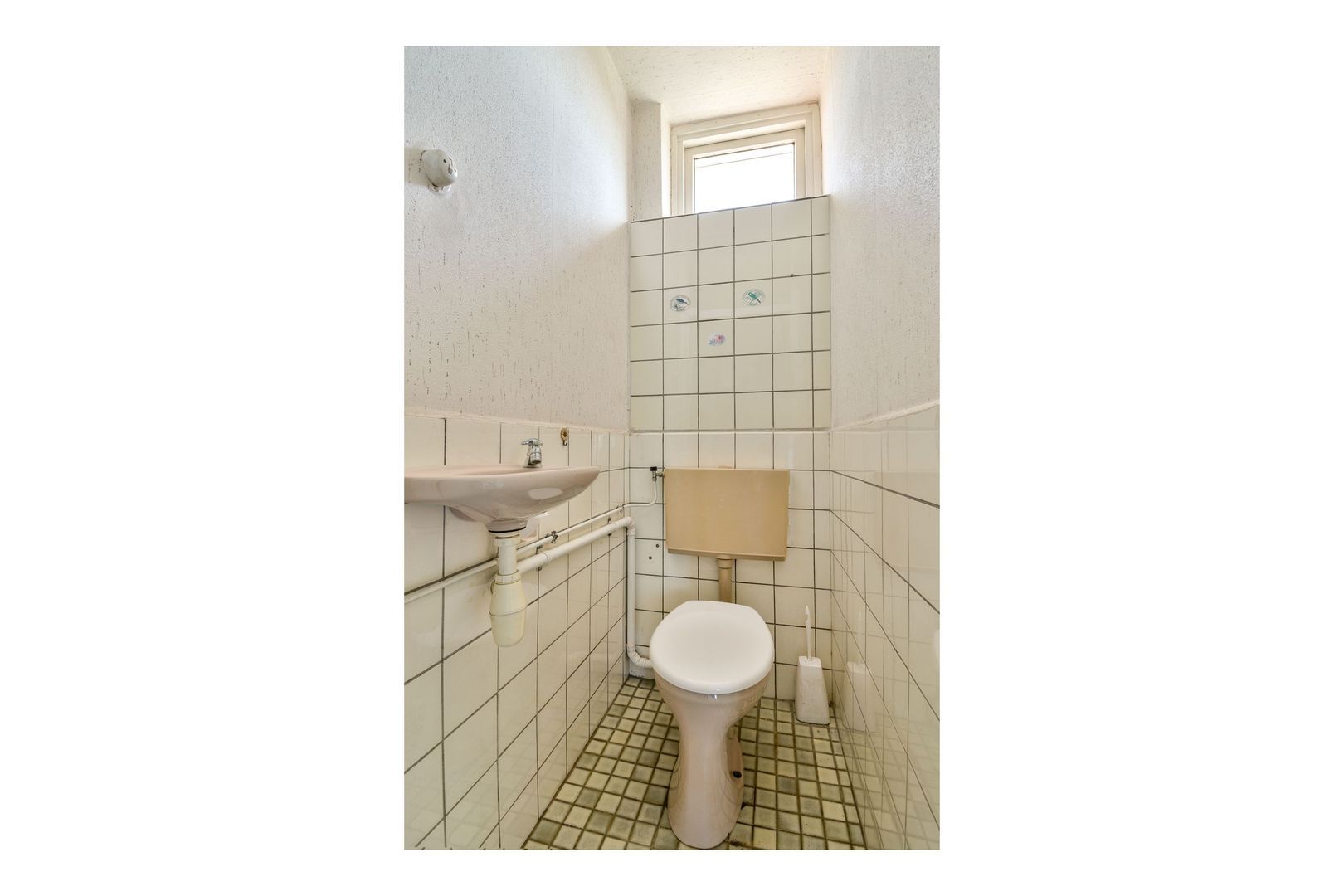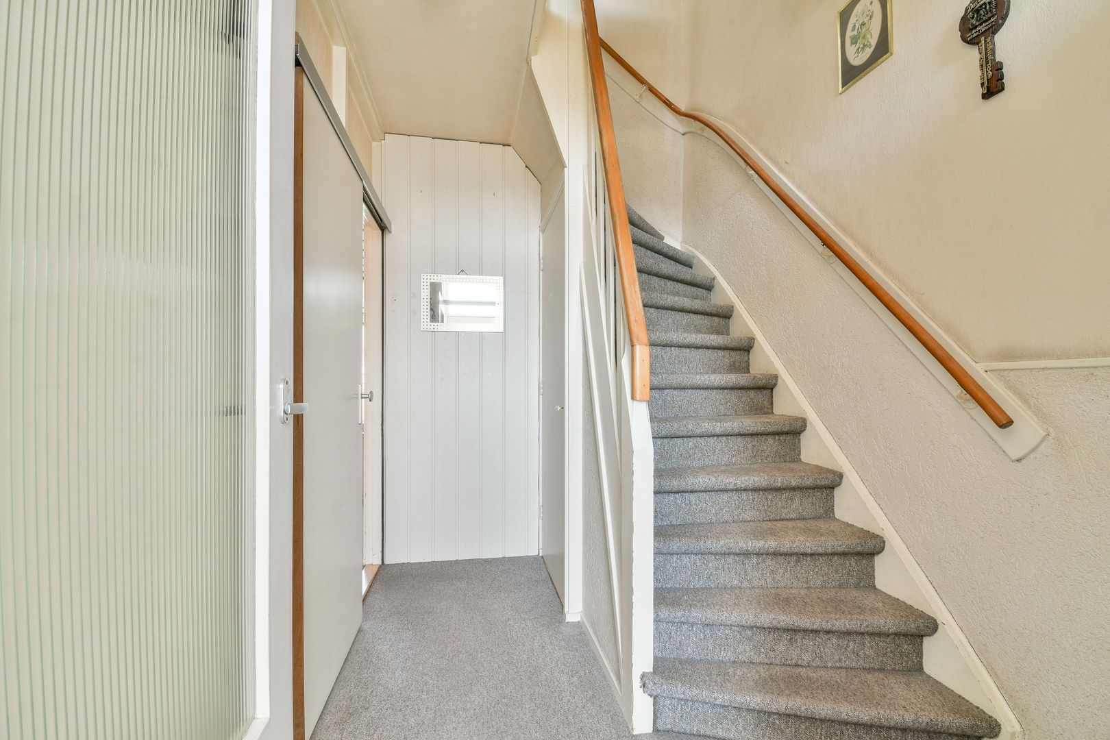 Entree woning, tochtportaal. Hal met trapopgang naar slaapverdieping, trapkast en gedeeltelijk betegeld toilet met fontein. Woonkamer met open keuken en een totale oppervlakte van ca. 30 m2. In de woonkamer is een vaste kast en aan de keuken grenst de meterkast. Vanuit de woonkamer is er toegang tot het zonnige op het westen gelegen balkon van ca. 7 m2.