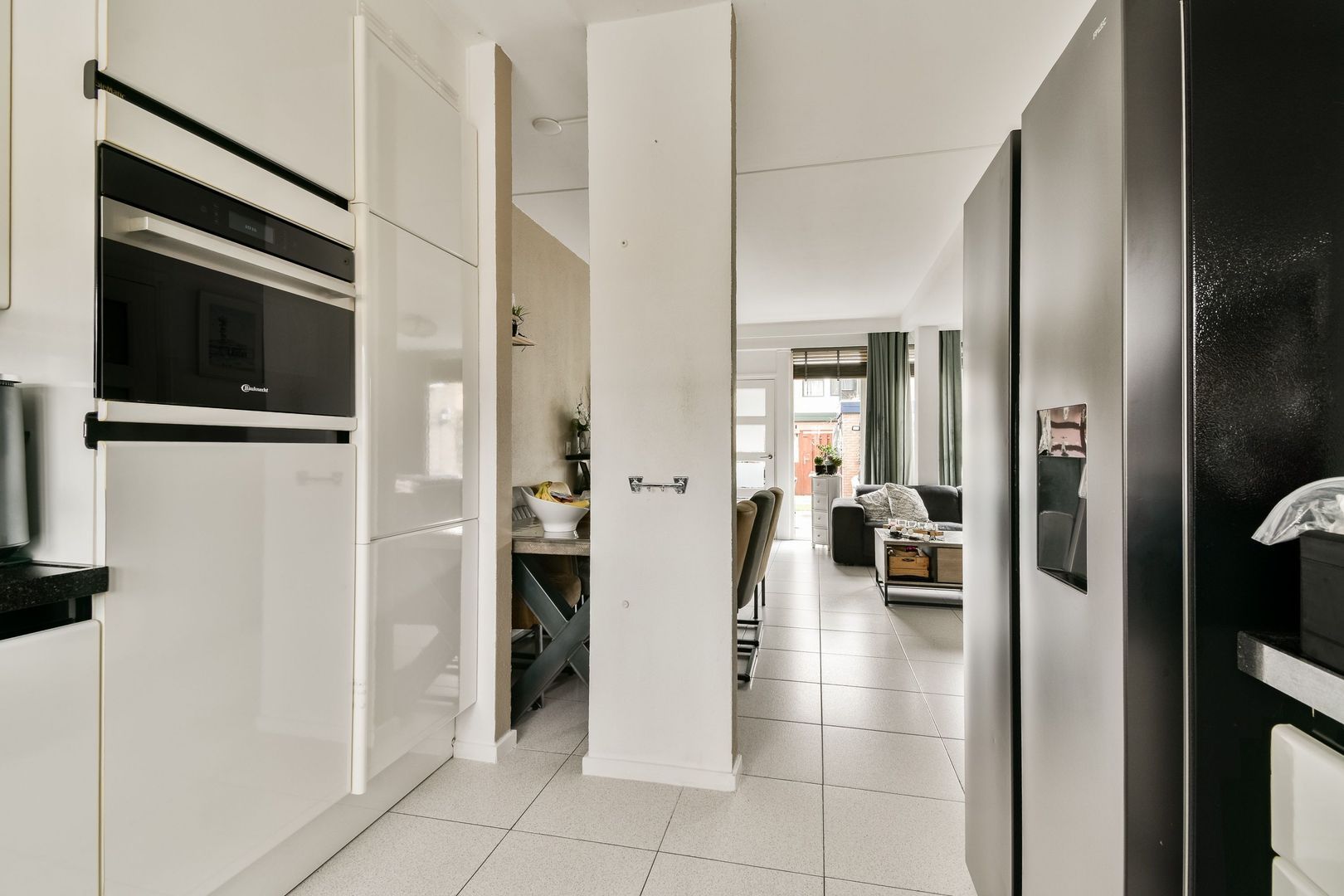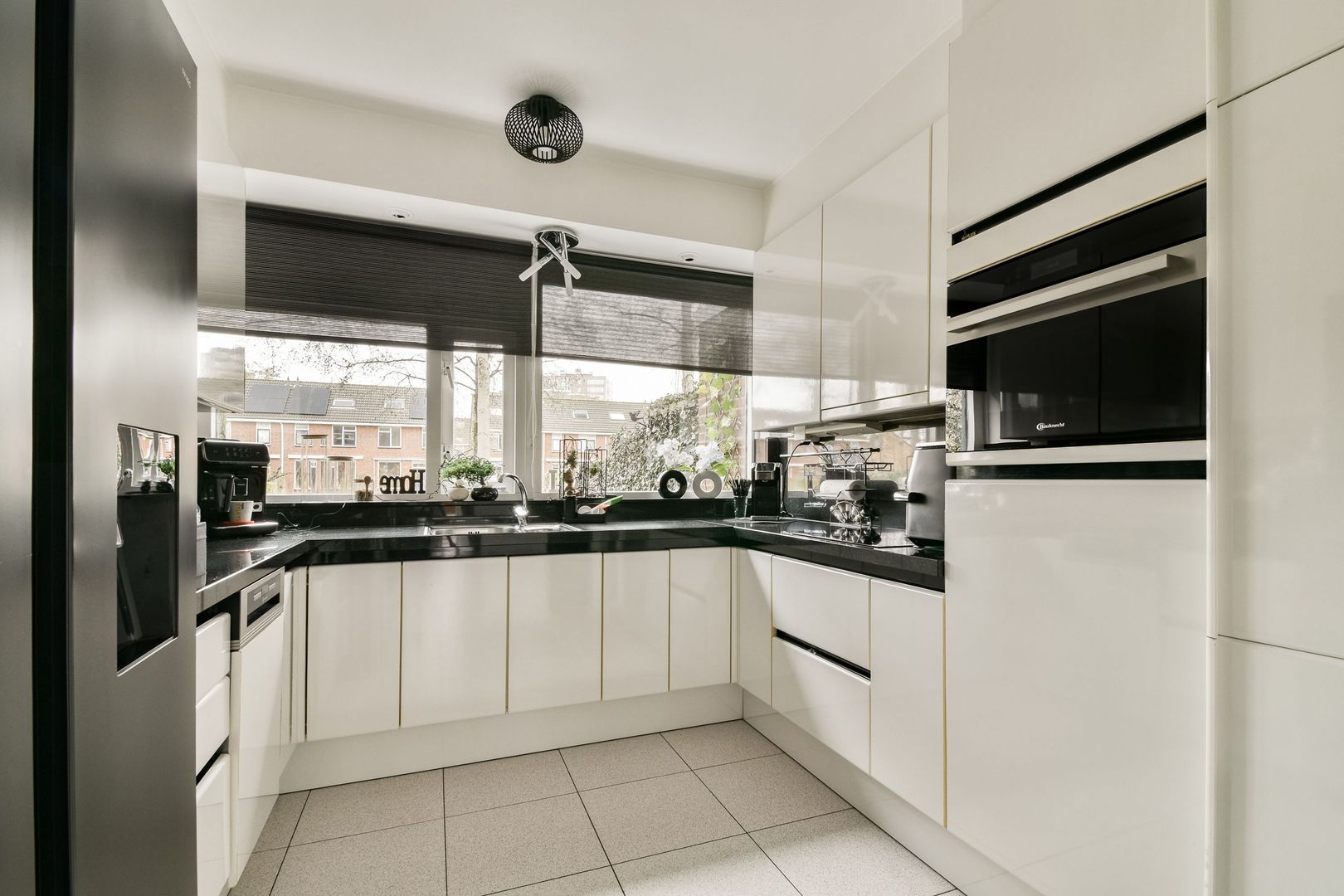 Ruime woonkamer van 34 m2, betegelde vloer met vloerverwarming, structuur wandafwerking, kunststof pui aan tuinzijde en portaal naar de tuin met bergkast. De moderne U-vormige keuken is aan de voorzijde van de woning en heeft uitzicht op groen en water. De keuken is uitgevoerd met hoogglans fronts en granieten aanrechtblad en achterwand heeft veel kastruimte en beschikt over de volgende inbouwapparatuur: heteluchtoven, combi-oven, 4-pits keramische kookplaat, afzuigkap, koelvrieskast en vaatwasser.