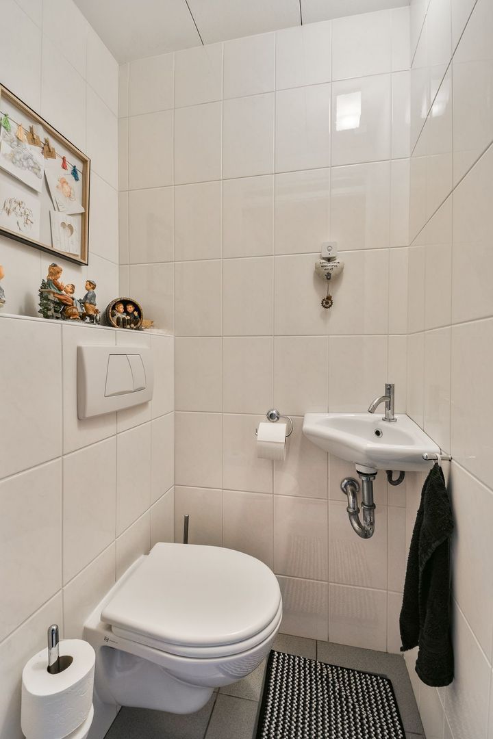 Entree, hal met betegelde vloer die doorloopt naar woonkamer, keuken, meterkast en antraciet/wit betegelde toiletruimte met zwevend toilet en fonteintje, bergruimte onder de trap.