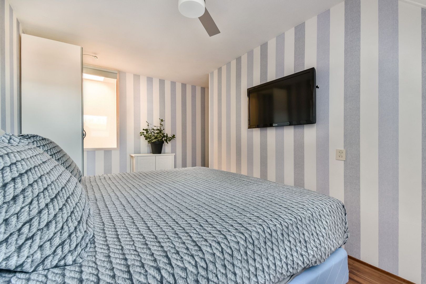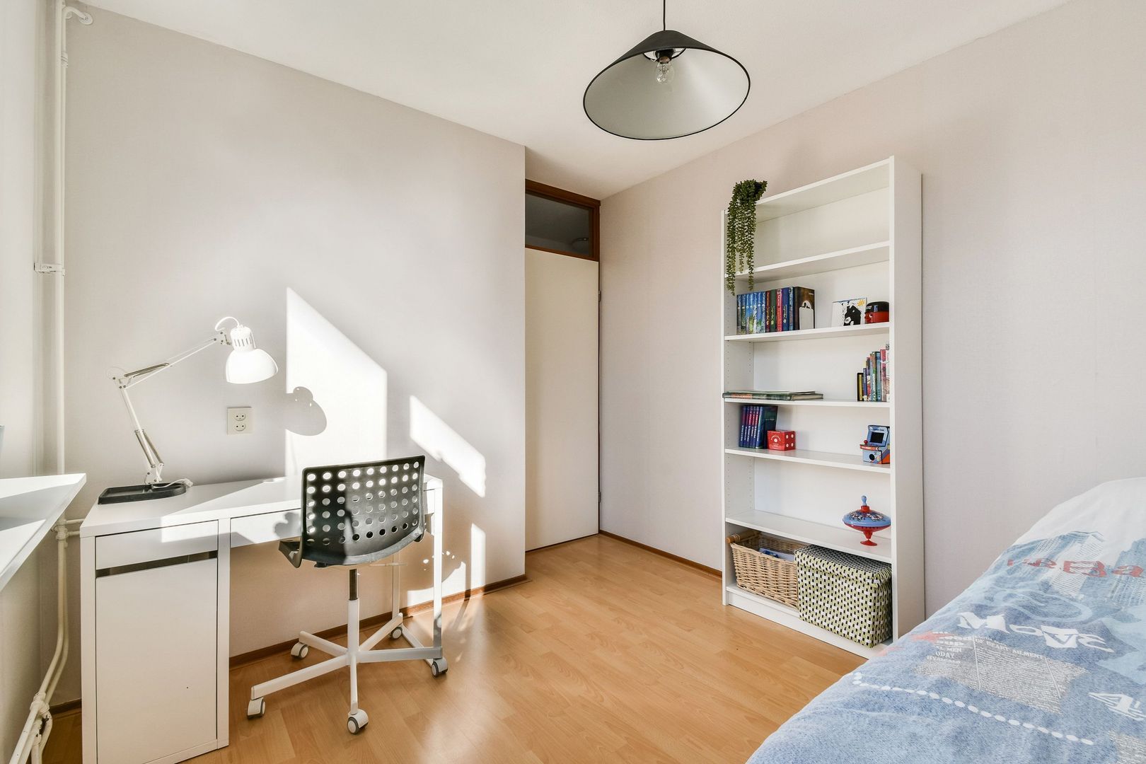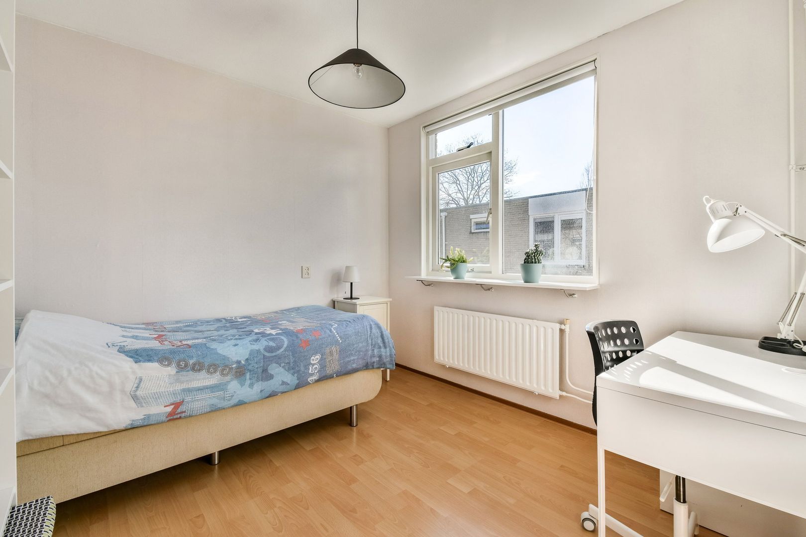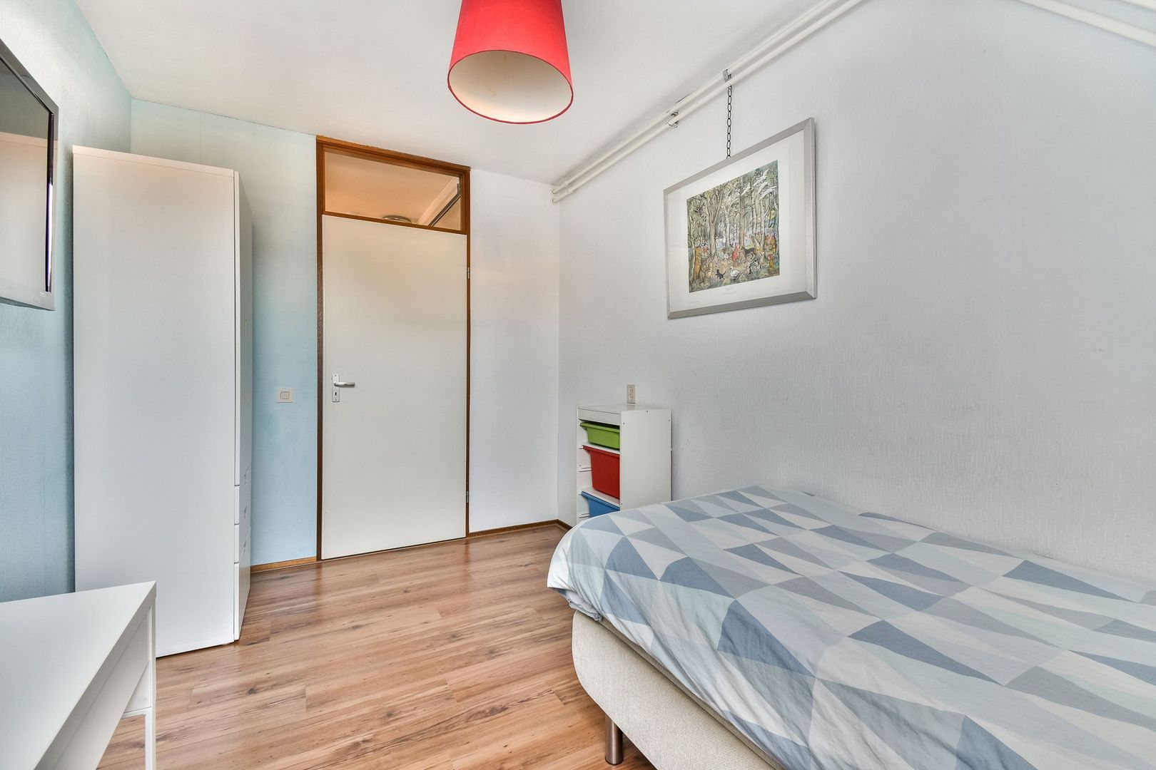 Voorslaapkamer van 9 m2 met laminaatvloer.