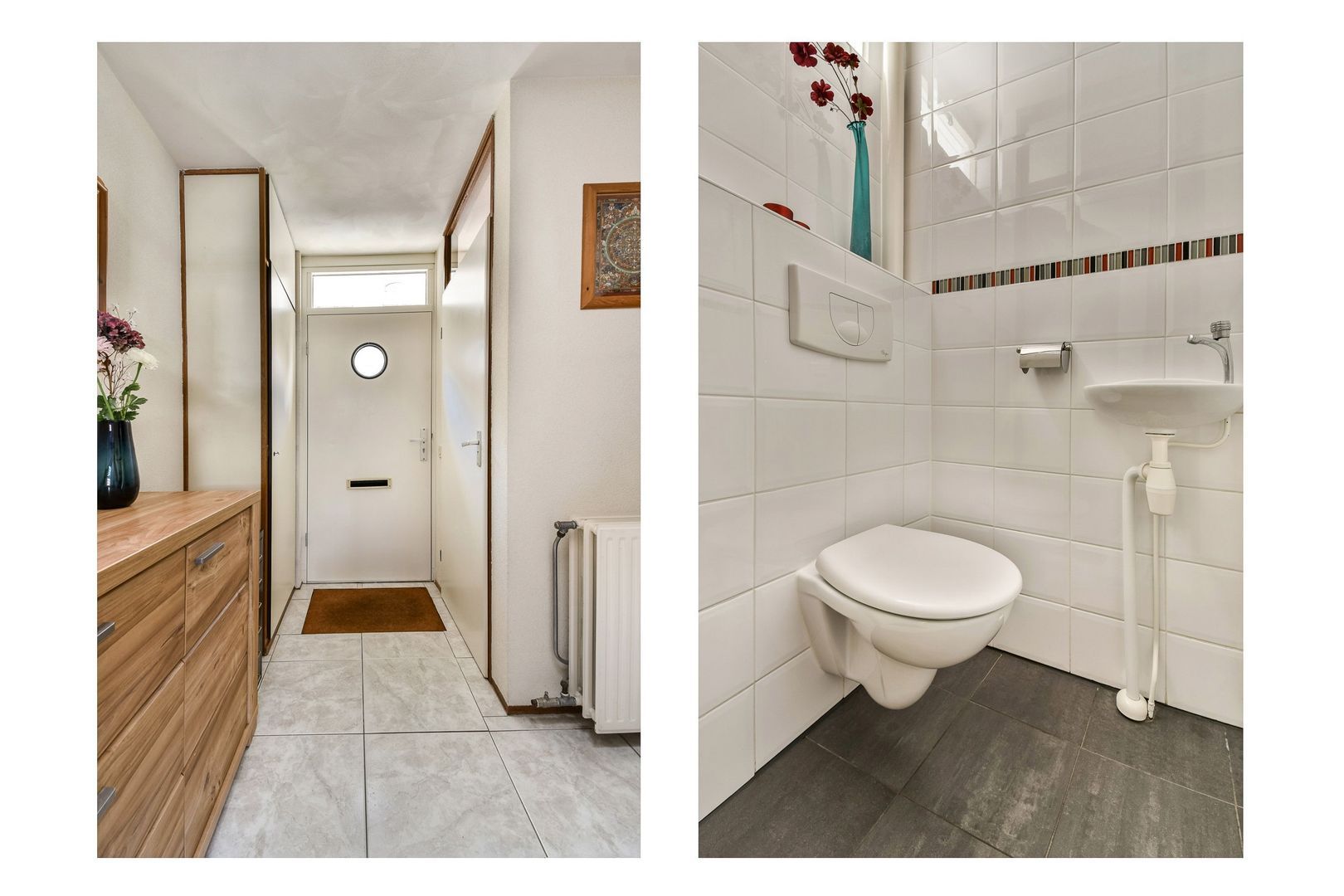 Entree, ruime hal met plavuizenvloer, vide met dakkoepel, meterkast en modern hangend toilet met fonteintje.