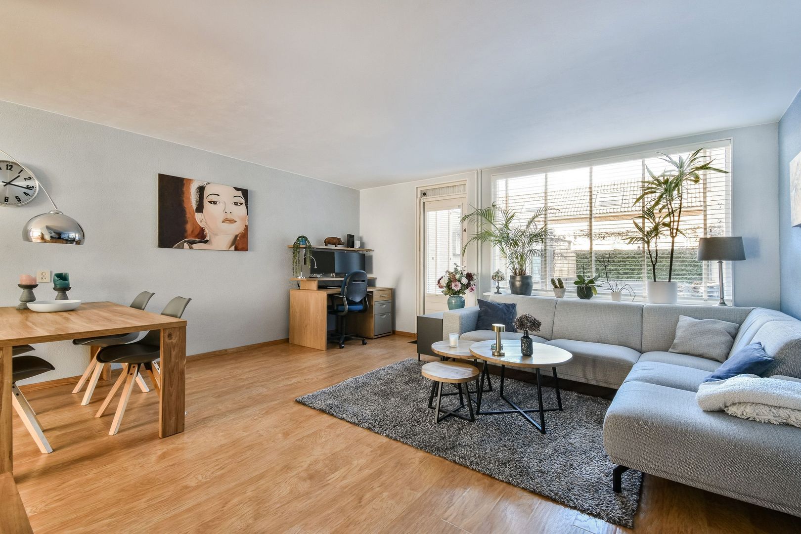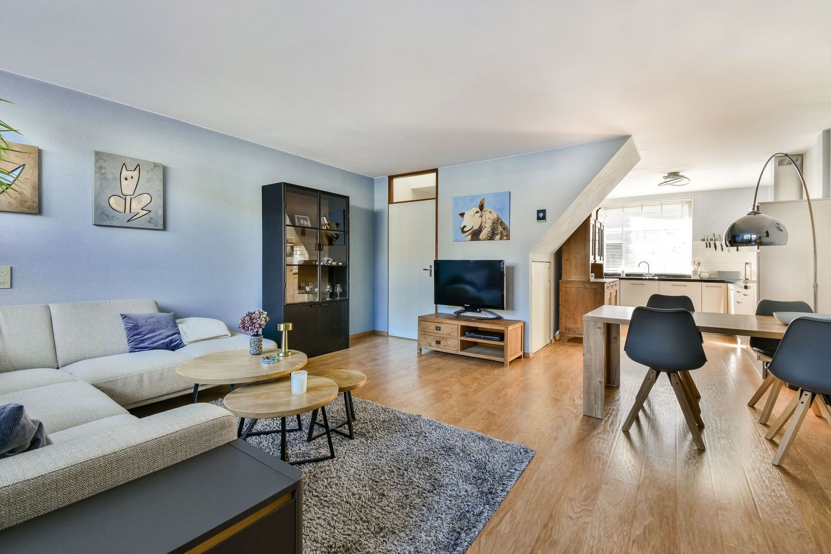 Lichte, sfeervolle en tuingerichte woonkamer met open keuken van totaal 35 m2 met spachtelputz wandafwerking, gestukt plafond, mooie laminaatvloer met eikenhouten print en een handige bergkast onder de trap.