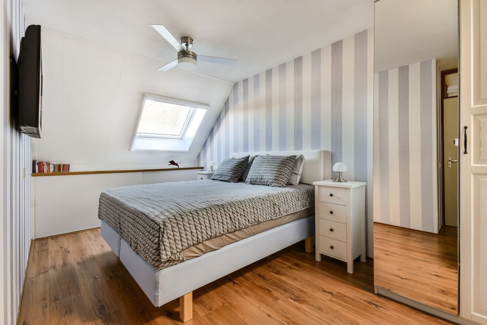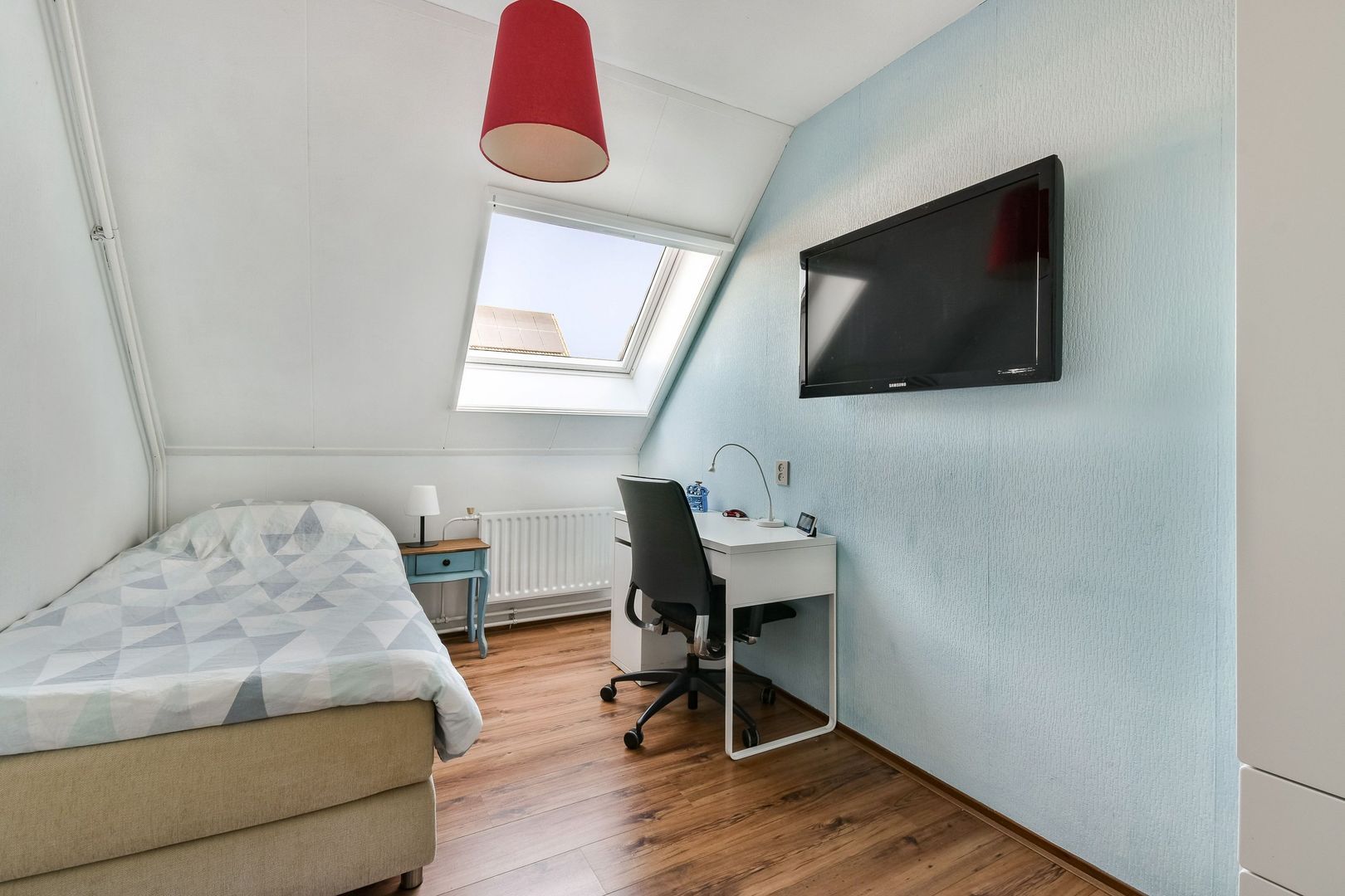 Achterslaapkamer van ca. 8 m2 met nieuw kunststof dakraam en laminaatvloer.