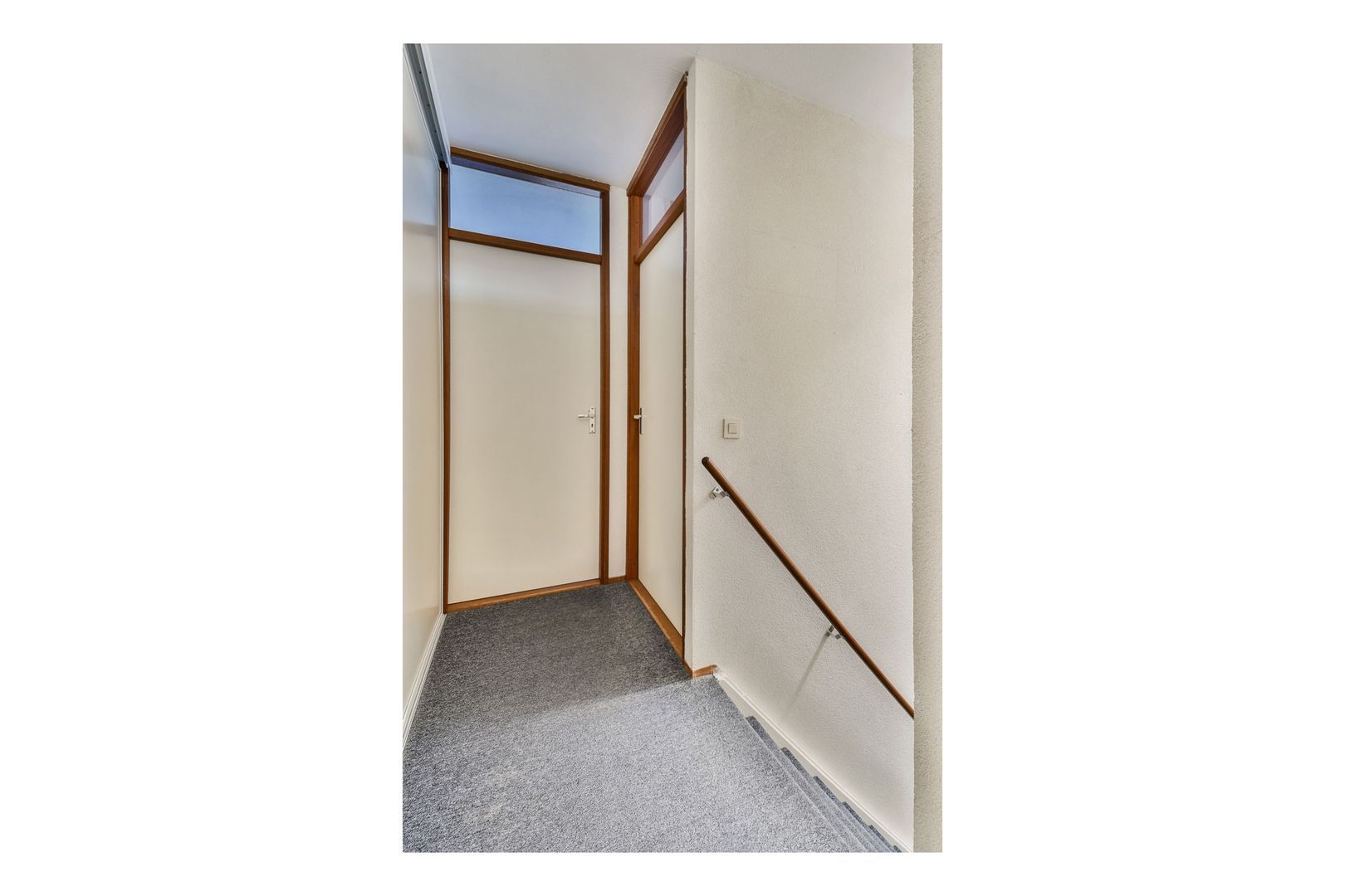 Royale overloop met kastenwand met CV-opstelling en aansluiting voor de wasmachine. Vide met dakkoepel.