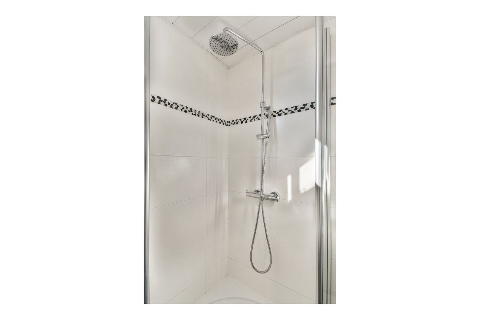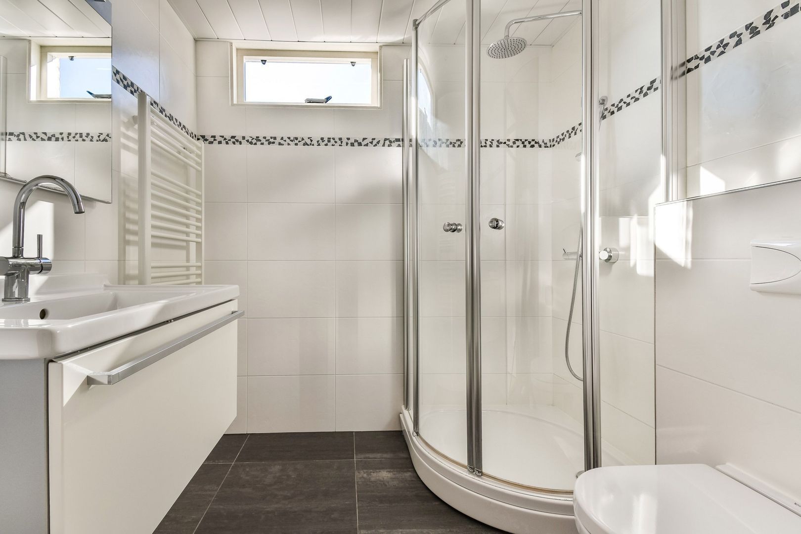 Luxe, volledig betegelde badkamer met witte wandtegel en antraciet vloertegel, douchecabine met thermostaatkraan, designradiator, breed wastafelmeubel, hangend 2e toilet en systeemplafond met inbouwverlichting en raam voor daglicht.