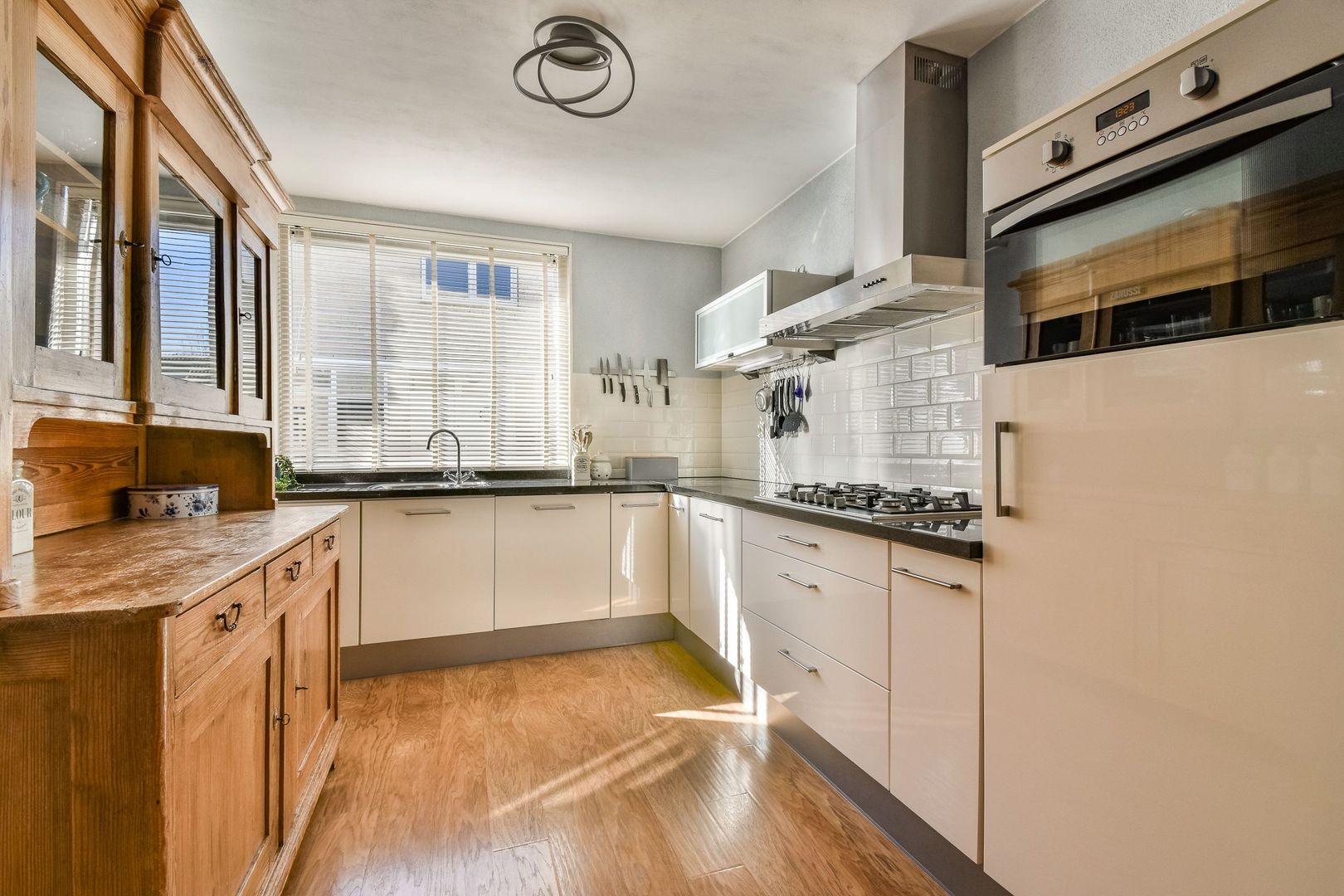 Moderne hoekkeuken met hoogglans roomwitte fronts en granieten aanrechtblad, betegelde achterwand, veel kastruimte, waaronder een carrouselkast en apothekerskast, en de volgende apparatuur: 5-pits gaskookplaat, RVS afzuigkap, koelkast, vaatwasser en combi-oven.