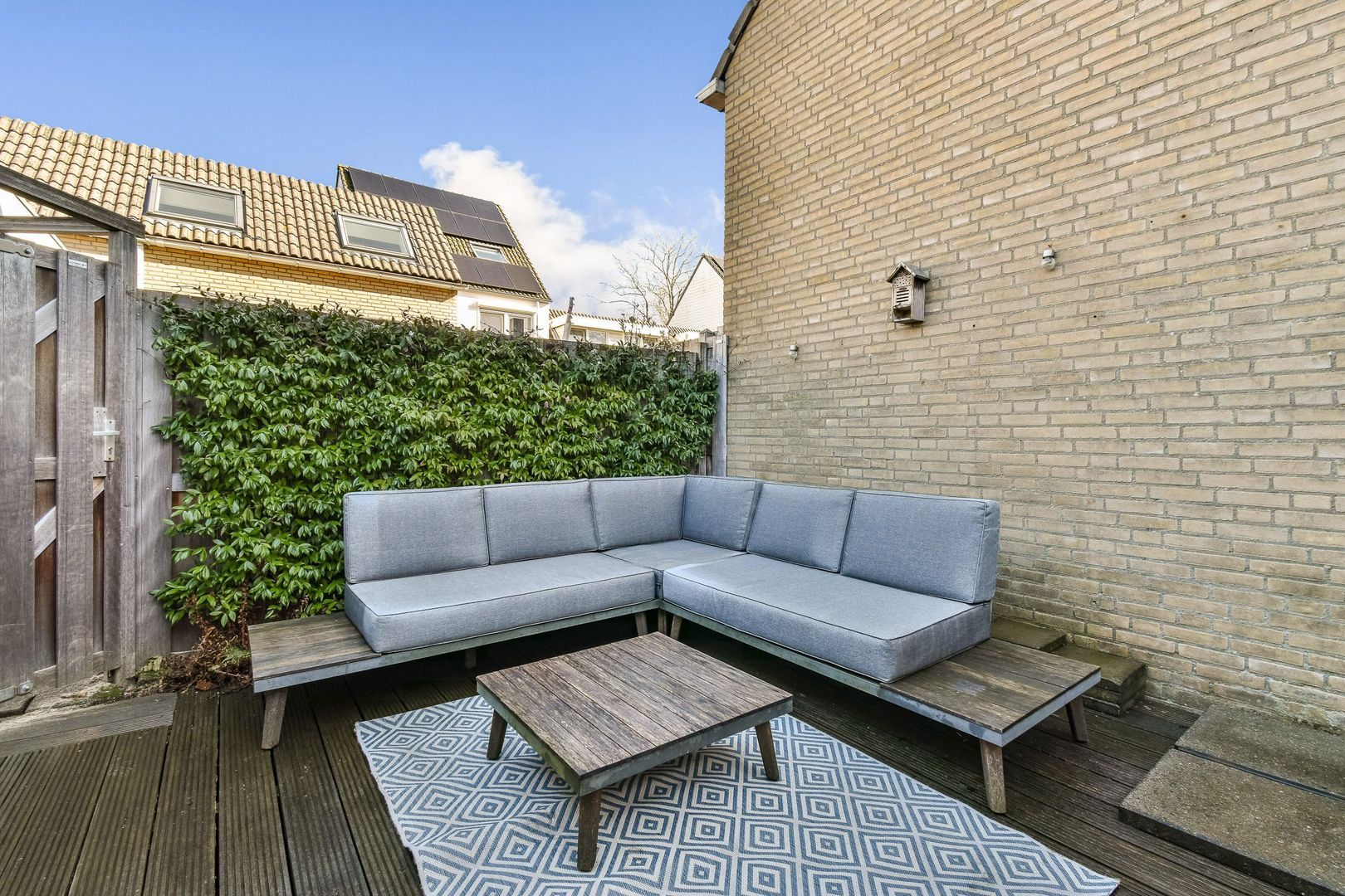 De woning heeft een mooi aangelegde achtertuin van 8 m diep en 4,5 m breed, gelegen op het oosten en voorzien van betegeling, houten vlonders en beplanting. Tevens is er een stenen berging van ca. 7 m2, voorzien van elektra en werkbank. Achterom via een gemeenschappelijke steeg; de woning ligt aan het einde van de steeg. Verzorgde voortuin met markies.