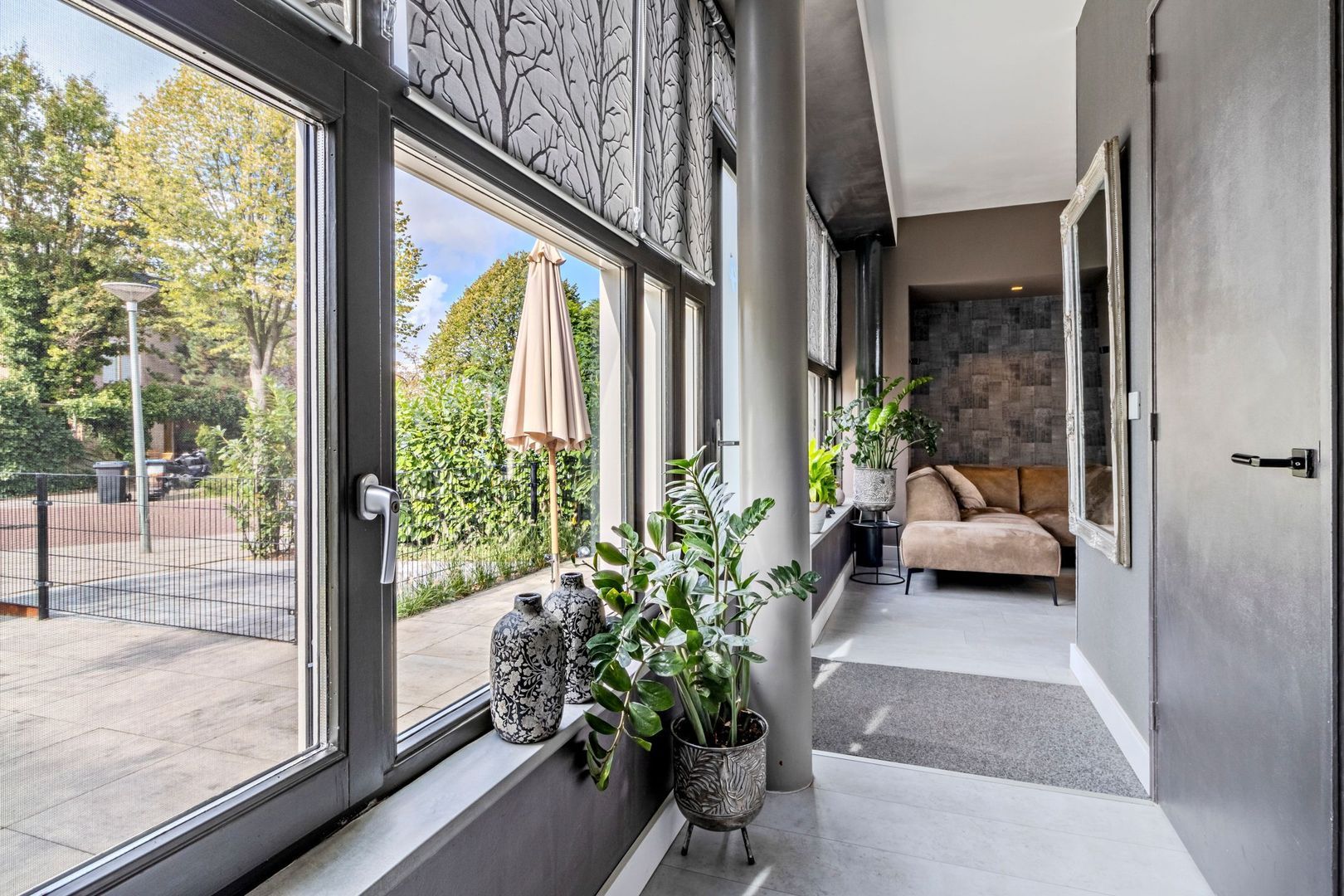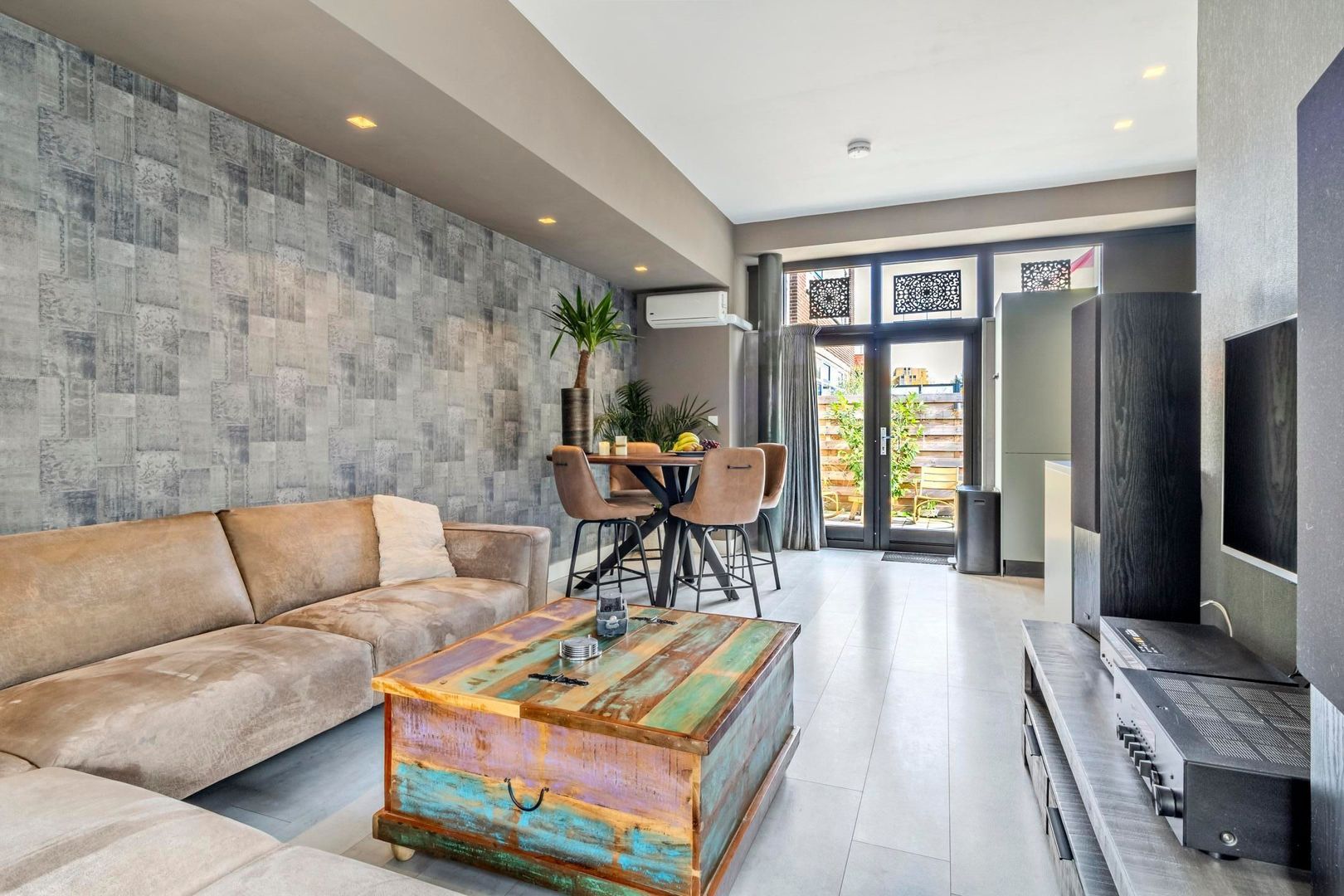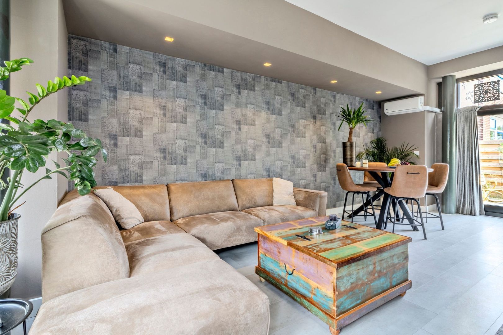 Entree van de woning via de recent aangelegde zonnige voortuin. Entree woning met meterkast. Ruime woonkamer met open keuken van in totaal ca. 27 m2 met veel daglichttoetreding en grotendeels een plafondhoogte van bijna 3 meter. Gedeeltelijk zijn inbouwspots aanwezig en er is airconditioning. Openslaande deuren geven toegang tot de achtertuin. De open keuken is uitgevoerd met een luxe U-vormig keukenblok uit 2020 met koelkast, vriezer, inductie kookplaat, afzuigkap, combi magnetron en vaatwasser.