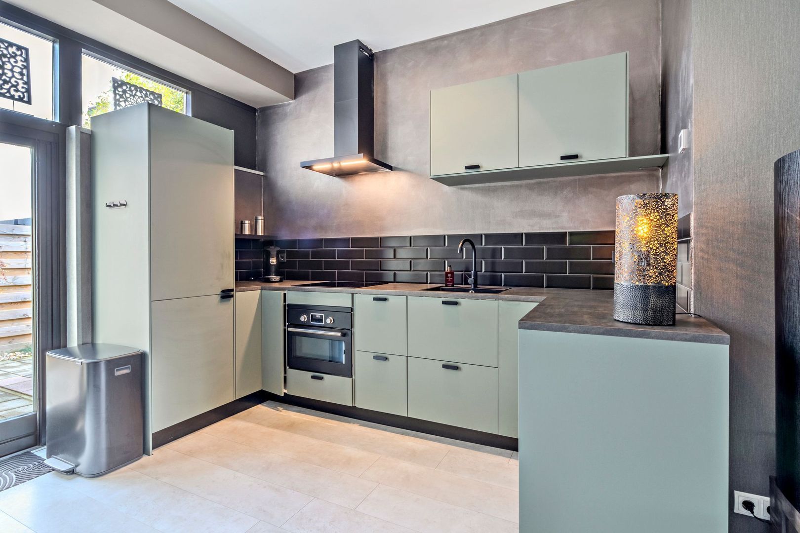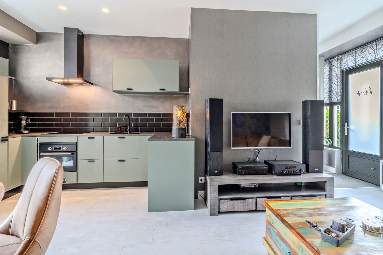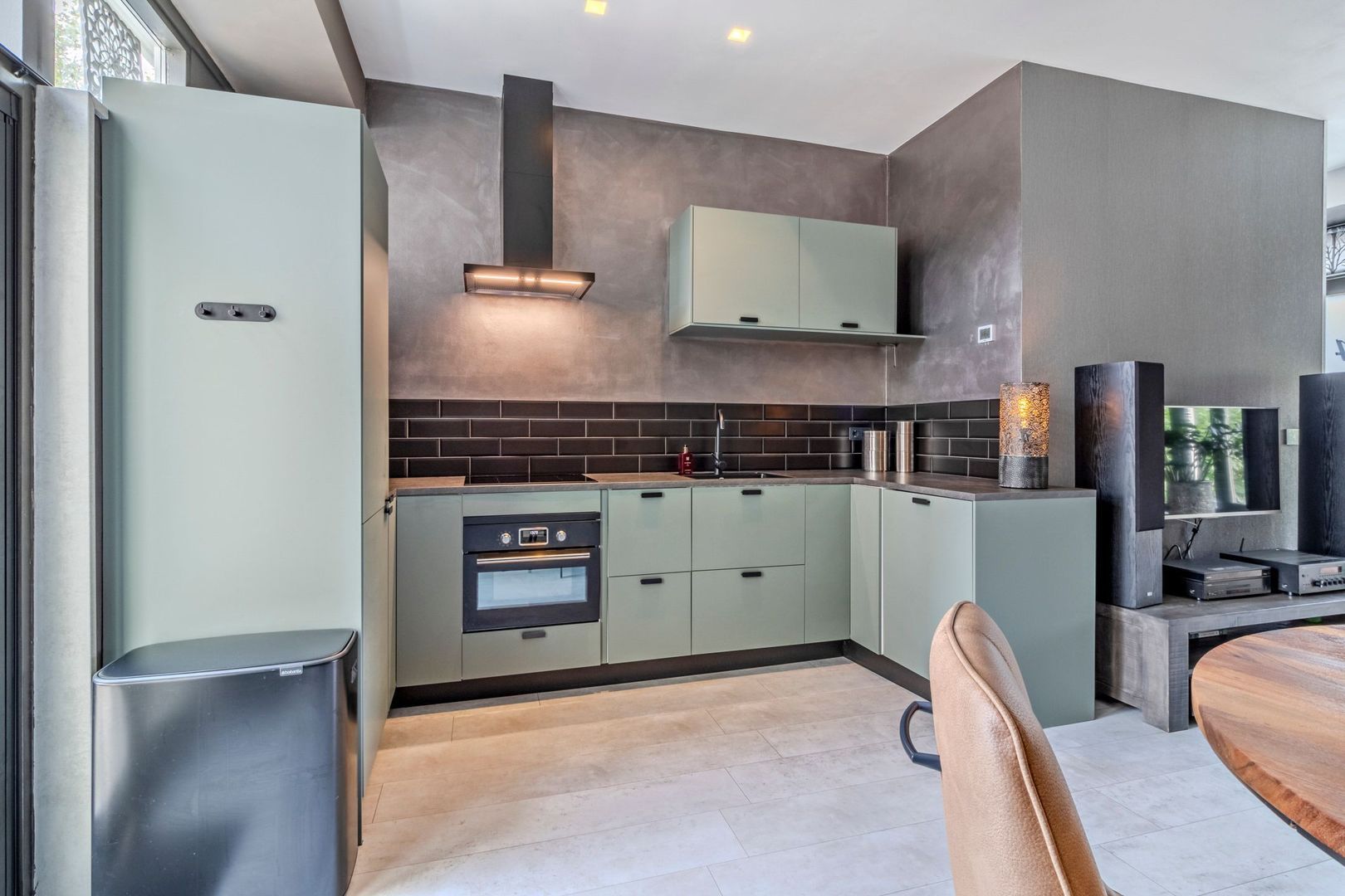 Entree van de woning via de recent aangelegde zonnige voortuin. Entree woning met meterkast. Ruime woonkamer met open keuken van in totaal ca. 27 m2 met veel daglichttoetreding en grotendeels een plafondhoogte van bijna 3 meter. Gedeeltelijk zijn inbouwspots aanwezig en er is airconditioning. Openslaande deuren geven toegang tot de achtertuin. De open keuken is uitgevoerd met een luxe U-vormig keukenblok uit 2020 met koelkast, vriezer, inductie kookplaat, afzuigkap, combi magnetron en vaatwasser.