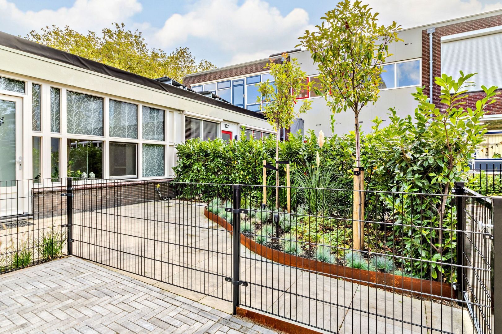 Deze woning heeft eigenlijk twee hoofdtuinen. De zonnige op het westen gelegen voortuin is ca. 8,50 meter breed en bijna 7 meter diep. De voortuin is recent mooi aangelegd en er is een parkeerplaats op eigen terrein gerealiseerd. Om de tuin is een metalen hekwerk geplaatst.