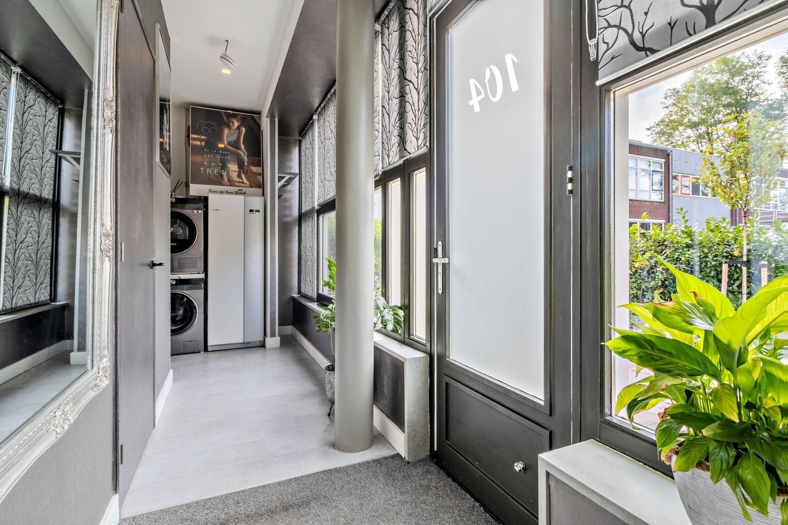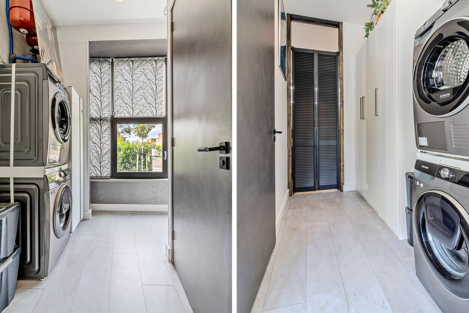 Vanuit de open hal is een doorloop naar de badkamer en slaapkamer. In deze hal bevindt zich ook de warmtepomp en zitten de wasmachine- en droger aansluitingen. Tevens is er nog ruimte om extra kasten te plaatsen.