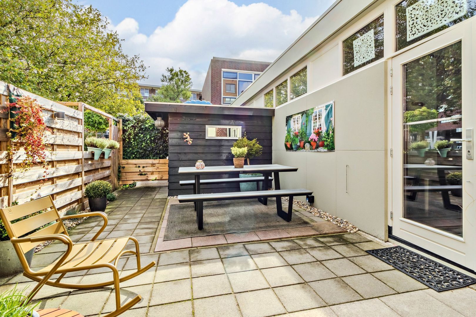 De achtertuin van bijna 8,5 meter breed en ruim 4 meter diep is grotendeels betegeld en heeft een houten berging van ca. 4,5 m2 en een achterom.