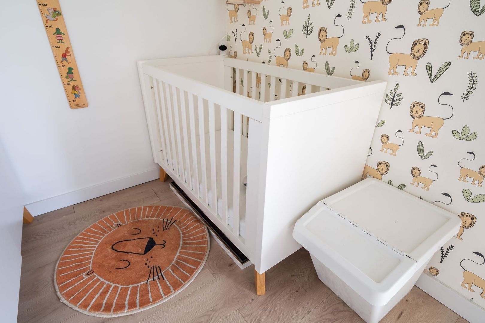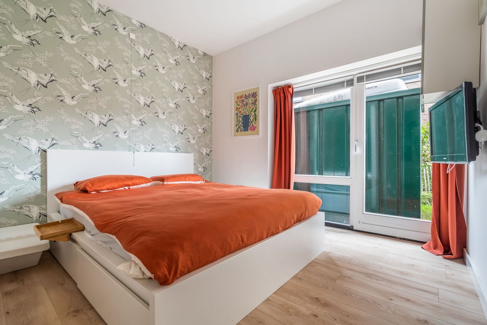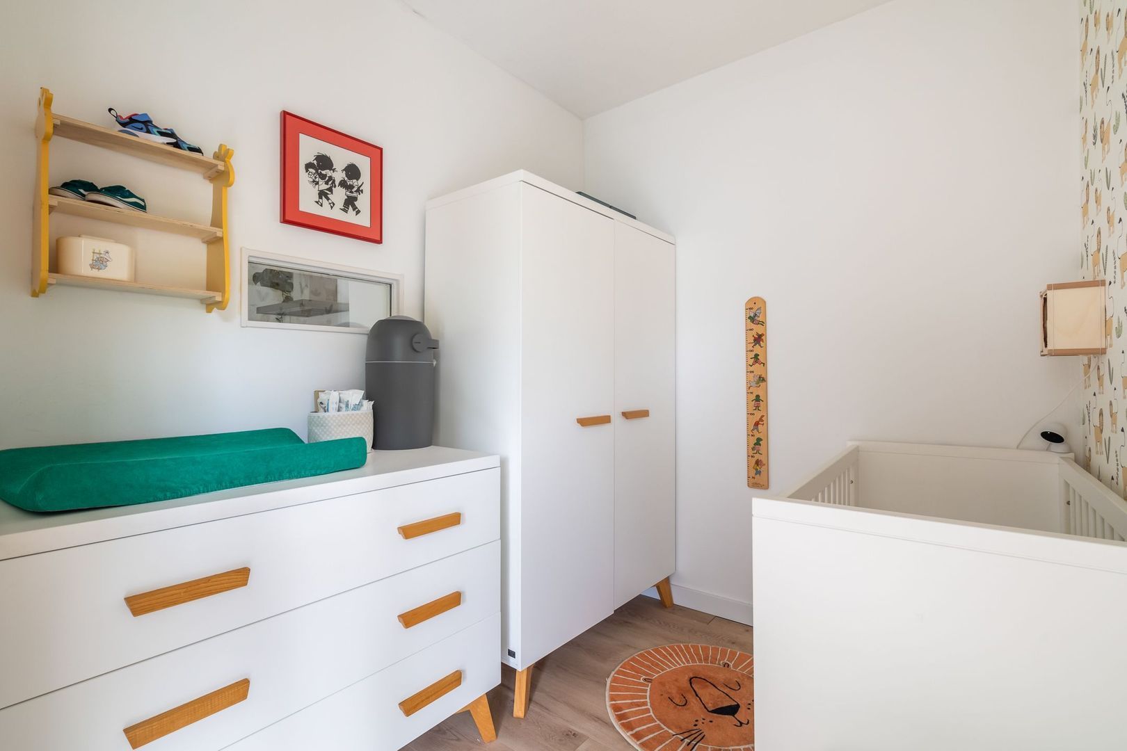 De kleine slaapkamer van 5 m2 is via de woonkamer toegankelijk, de hoofdslaapkamer van ca. 8,5 m2 is via de woonkeuken toegankelijk met aangrenzend de badkamer. In de badkamer is gekozen voor volledige betegeling, antraciet vloertegels, en witte wandtegels met aan de kopse kanten lichtgroen accent.