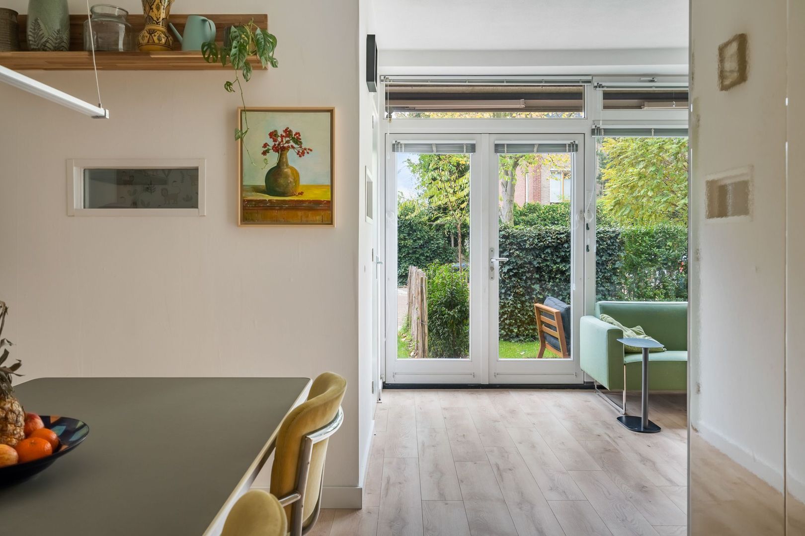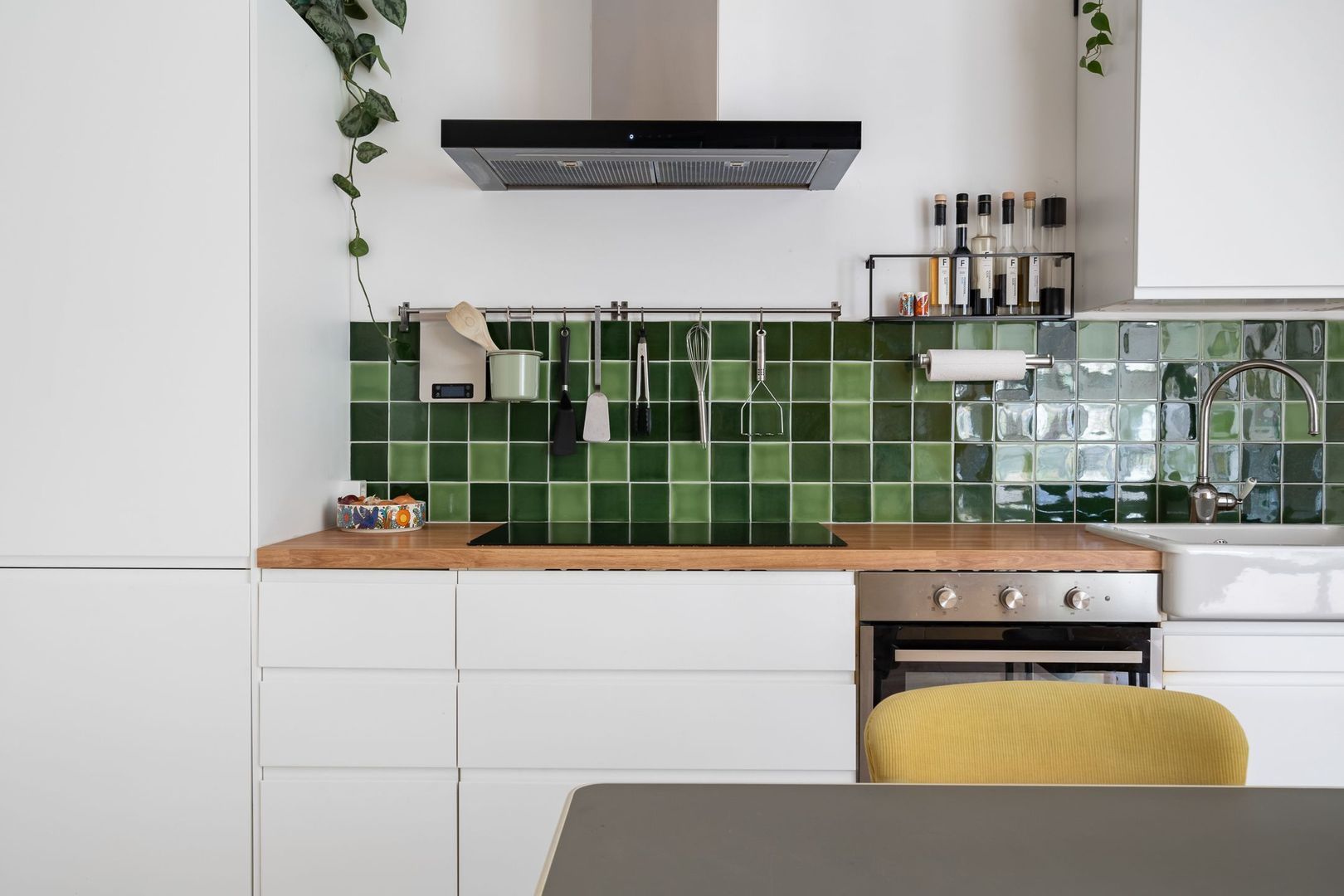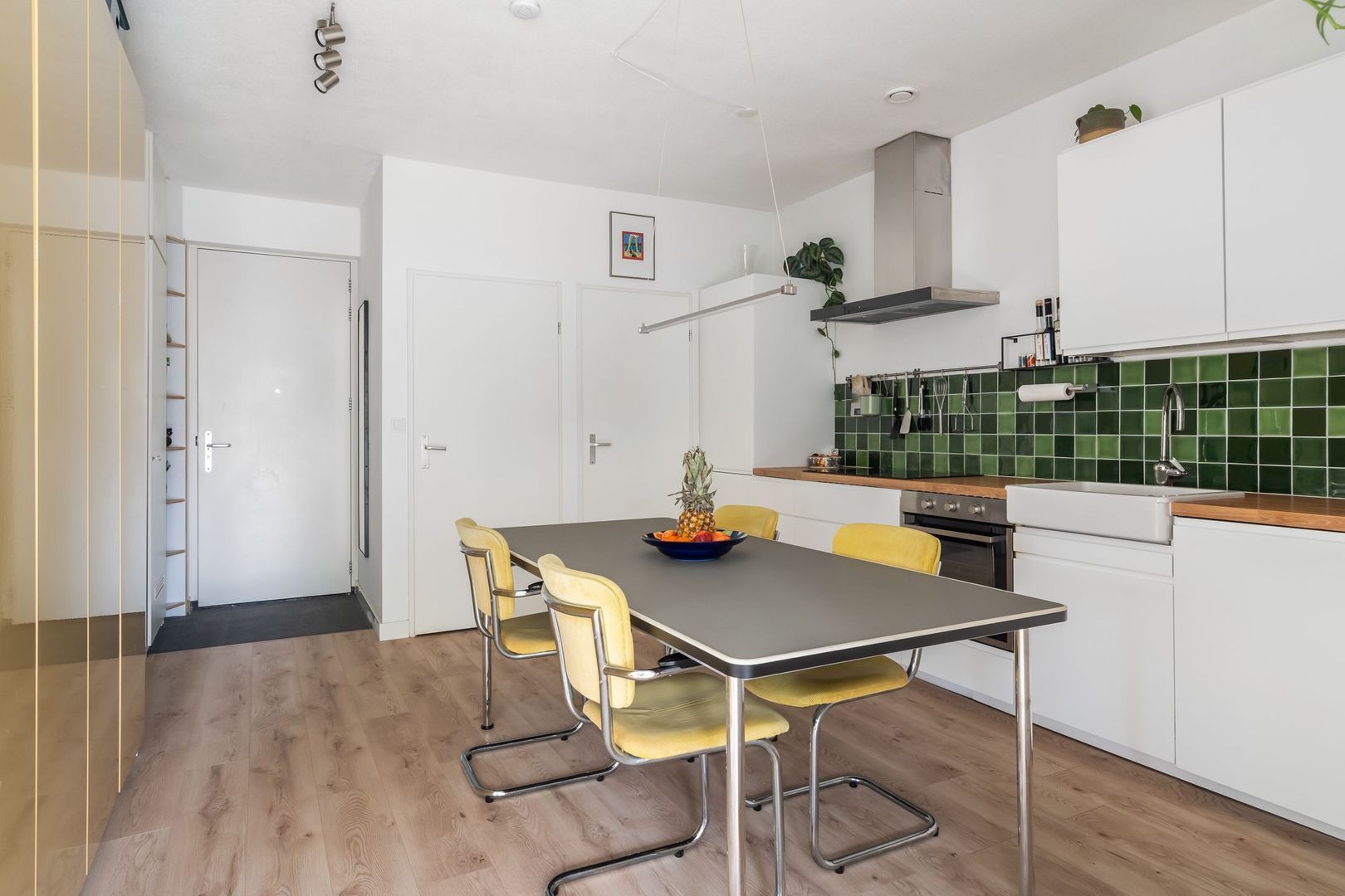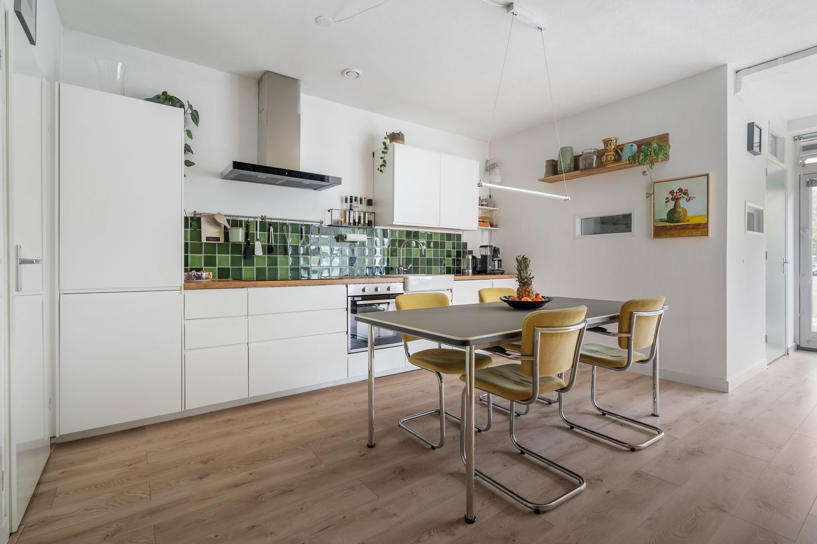 De keuken heeft een ruim keukenblok met witte fronten, houtlook werkblad en een fraai betegelde achterwand. De keuken is voorzien van de navolgende inbouwapparatuur; vaatwasser, koel-/vriescombinatie, oven, inductie kookplaat en een afzuigkap.