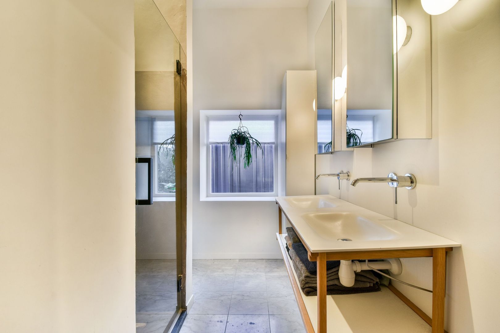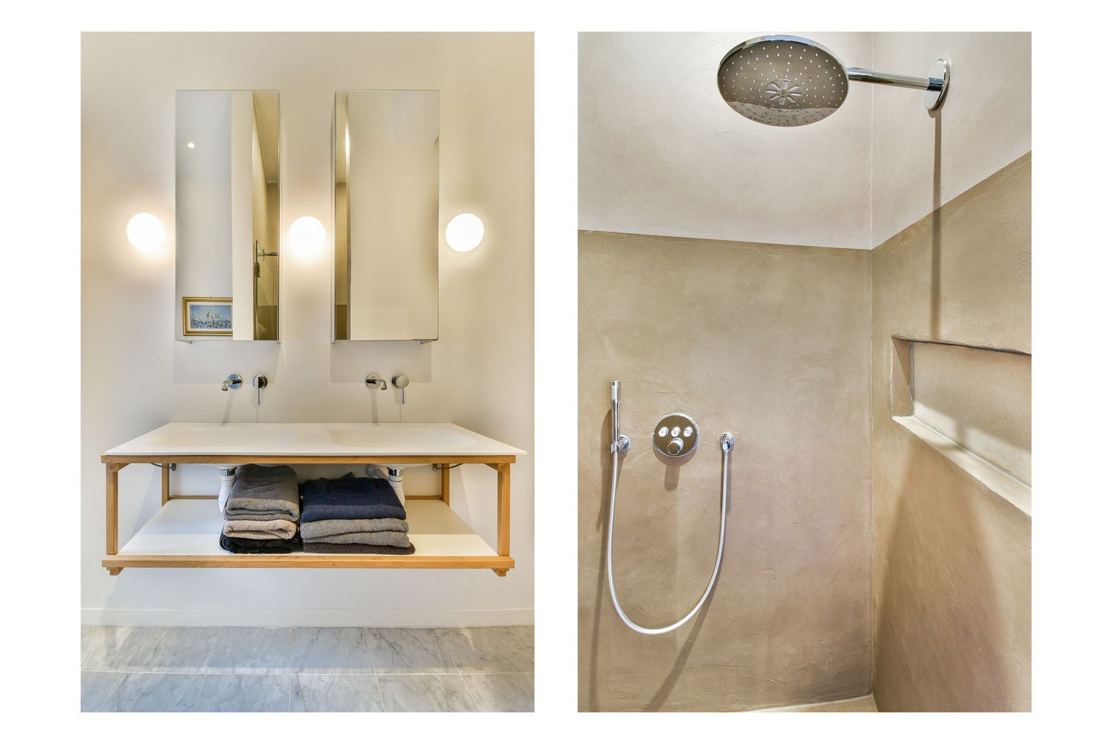 Tweede slaapkamer van ca. 7,5 m2 met hoge vaste kast. Badkamer met betegelde vloer en uitgevoerd in beton ciré. De badkamer is voorzien van een inloopdouche met onder andere een Grohe regendouche en er zijn twee wastafels. Ook een Villeroy & Boch hangend toilet is aanwezig in de badkamer.
