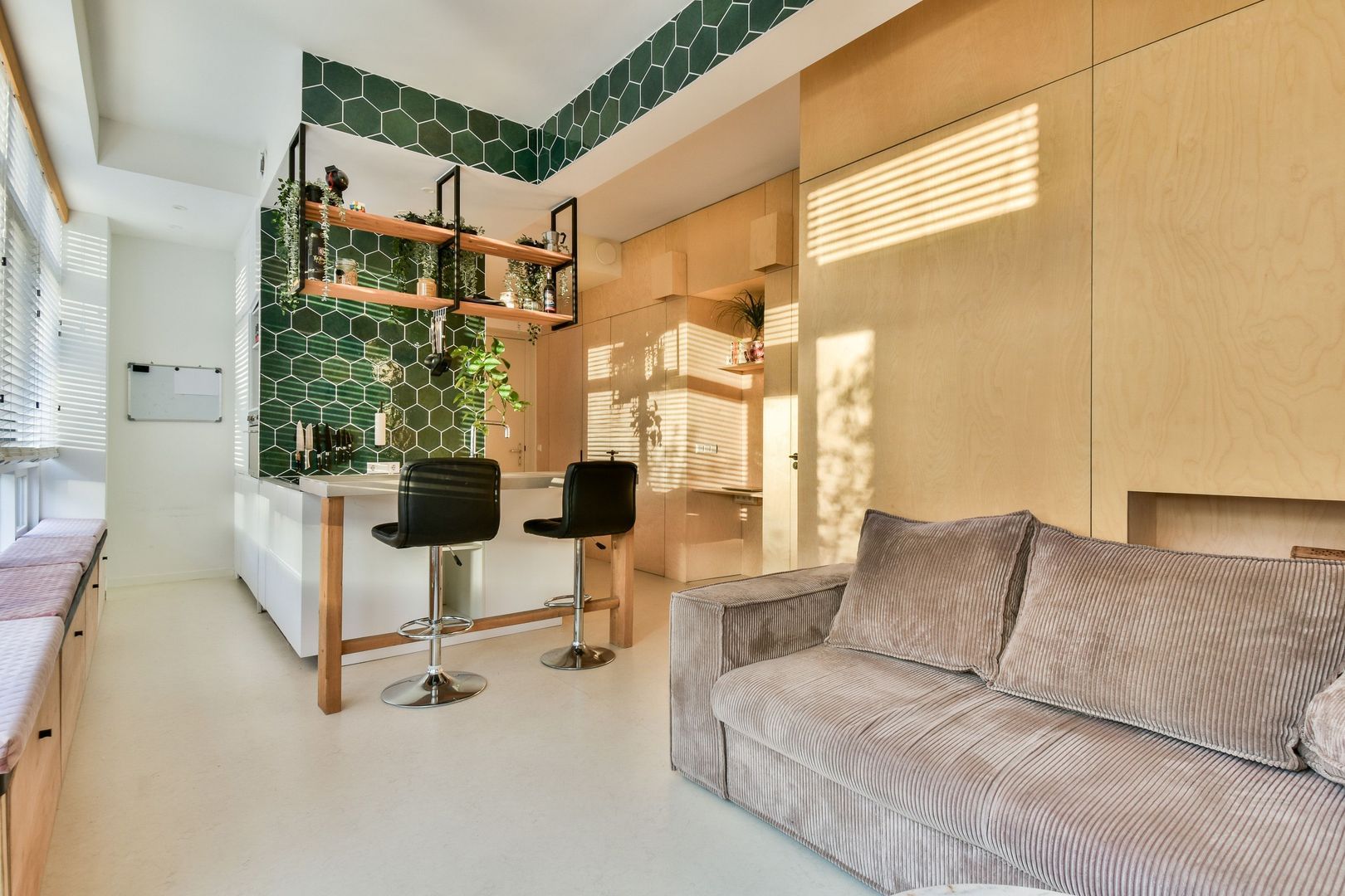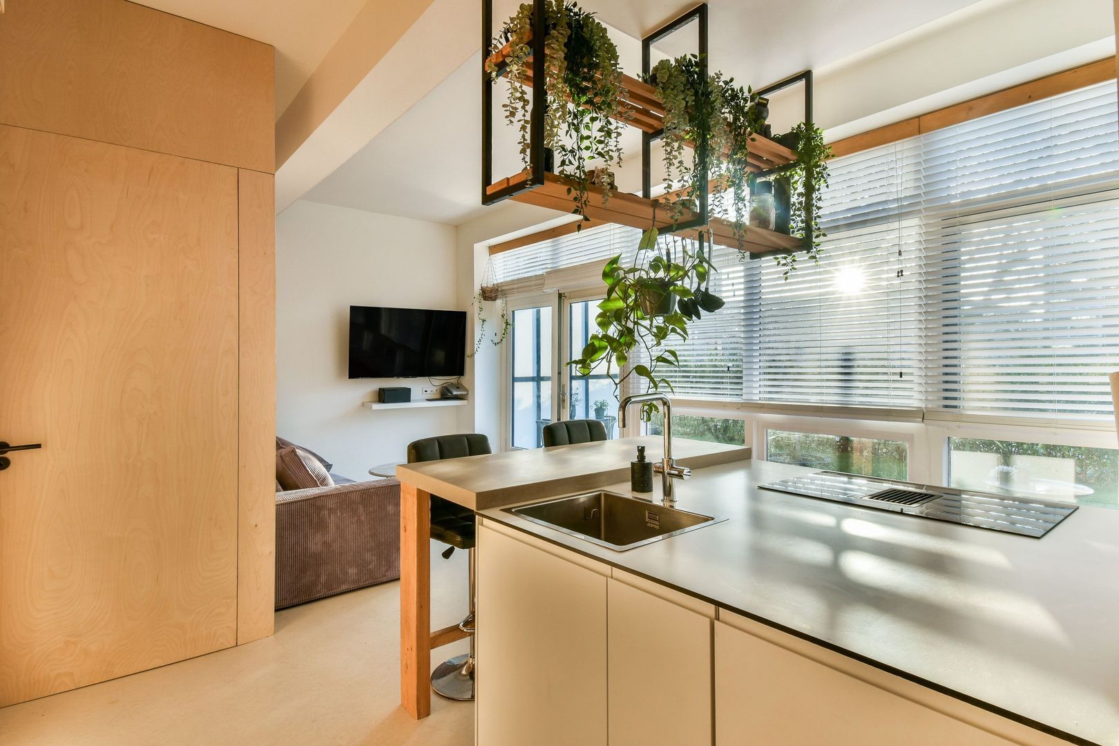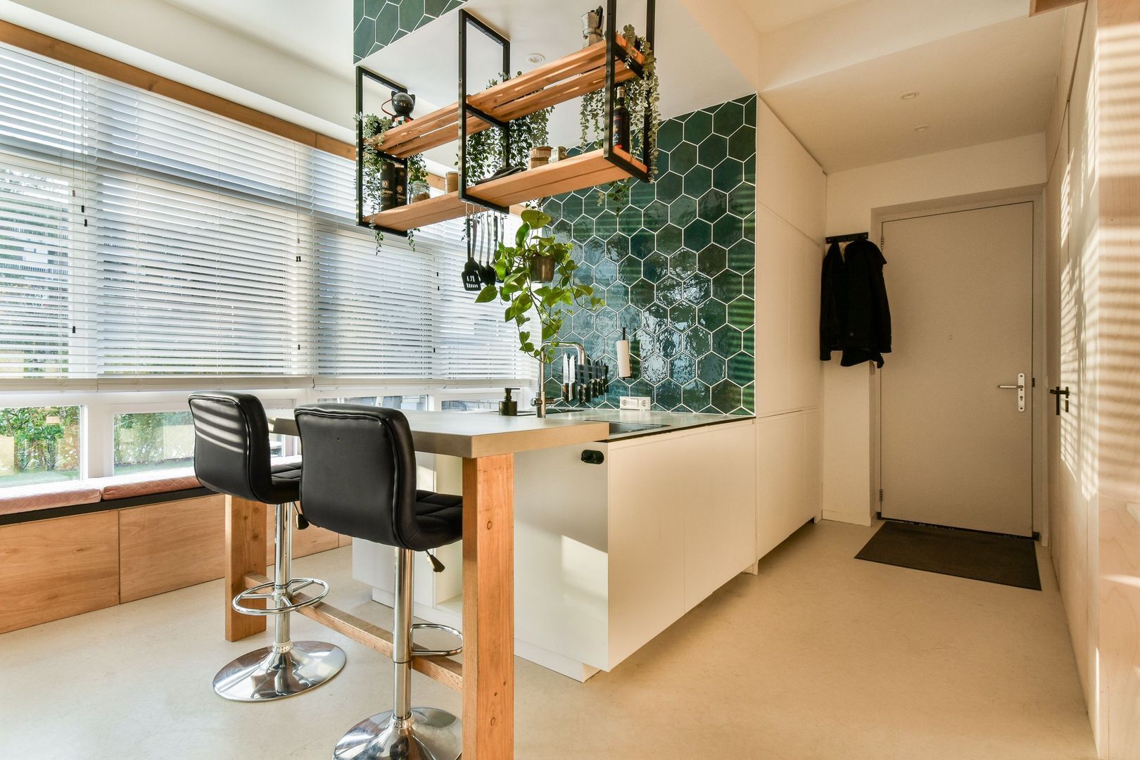 Entree woning met vaste kasten en meterkast. Woonkamer met open keuken van in totaal ca. 28 m2. De woonkamer heeft openslaande deuren naar de achtertuin en er is een werkhoek gecreëerd. Plafonds met ingebouwde verlichting (Philips Hue). De moderne en luxe keuken is voorzien van diverse bergruimten en inbouwapparatuur zoals koelkast, vriezer, kokend waterkraan, vaatwasser, combioven met magnetronfunctie en inductiekookplaat met geïntegreerde afzuiging. De kokend waterkraan is van Grohe, de overige inbouwapparatuur is van SMEG. Achter de keuken zijn de warmtepomp en WTW-installatie (balansventilatie) weggewerkt.