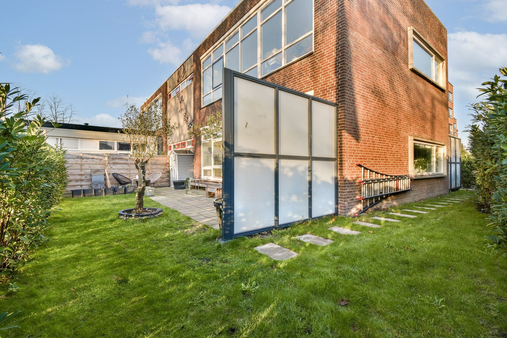 Deze woning heeft ontzettend veel tuin met een totaal oppervlakte van ruim 130 m2. Er is hierdoor altijd gelegenheid om in de zon of juist de schaduw te zitten. De voortuin is bijna 14 meter breed en ca. 4.50 meter diep. Deze tuin is voorzien van een groot terras en gras, met elektra en watervoorziening Ook een achterom is hier aanwezig. De voortuin is ook eveneens voorzien van een betegeld terras en gras. De achtertuin is ca. 8.40 meter breed en ca. 4.50 meter diep met grote aluminium berging van 9 m2, voorzien van elektra en aangebouwde 2e berging. De schuin weglopende zijtuin is voorzien van gras, met staptegels.