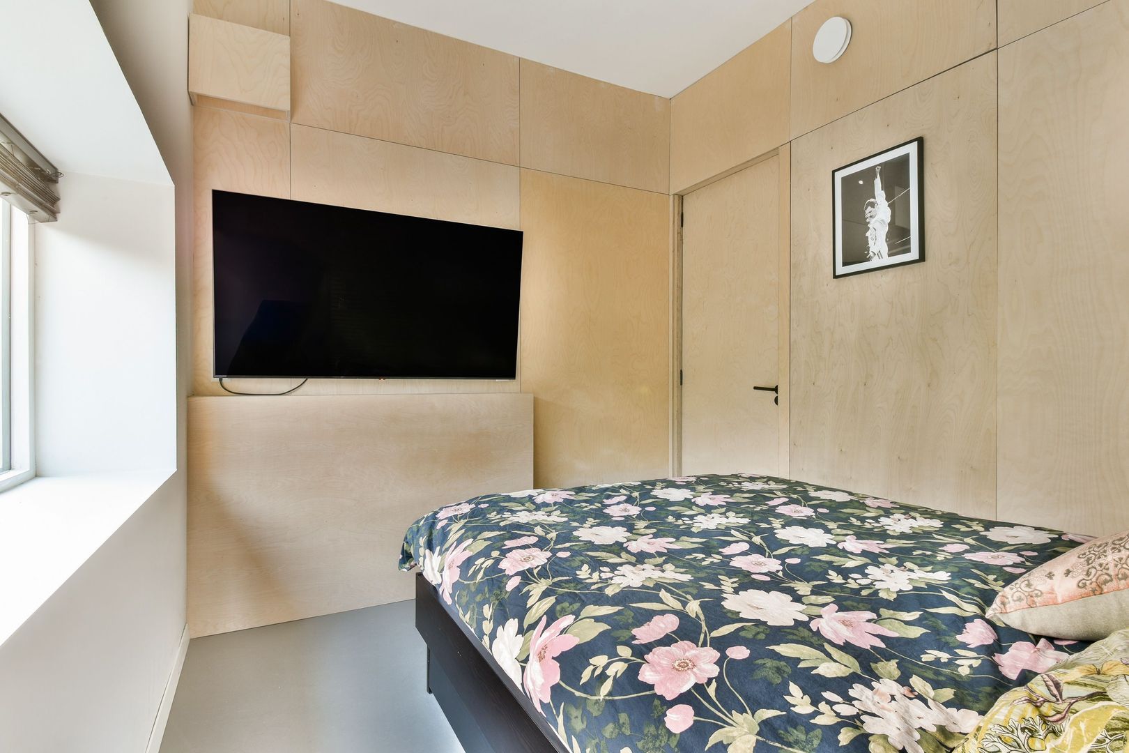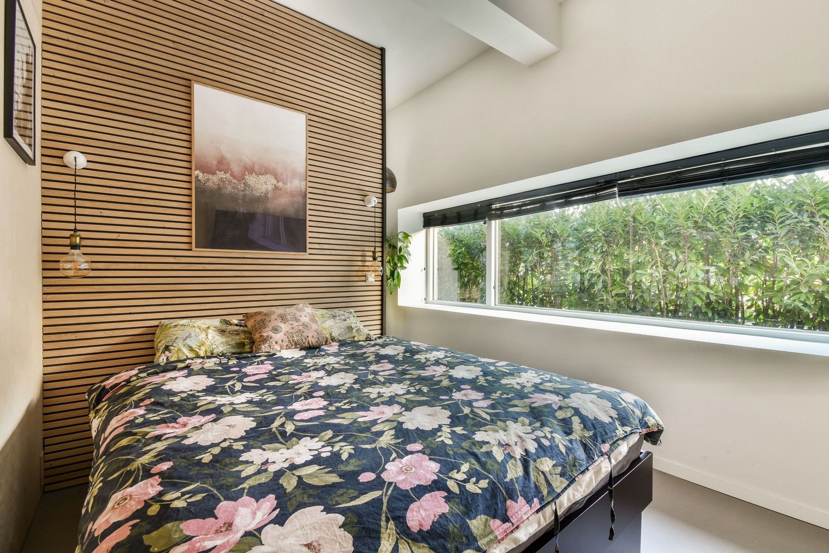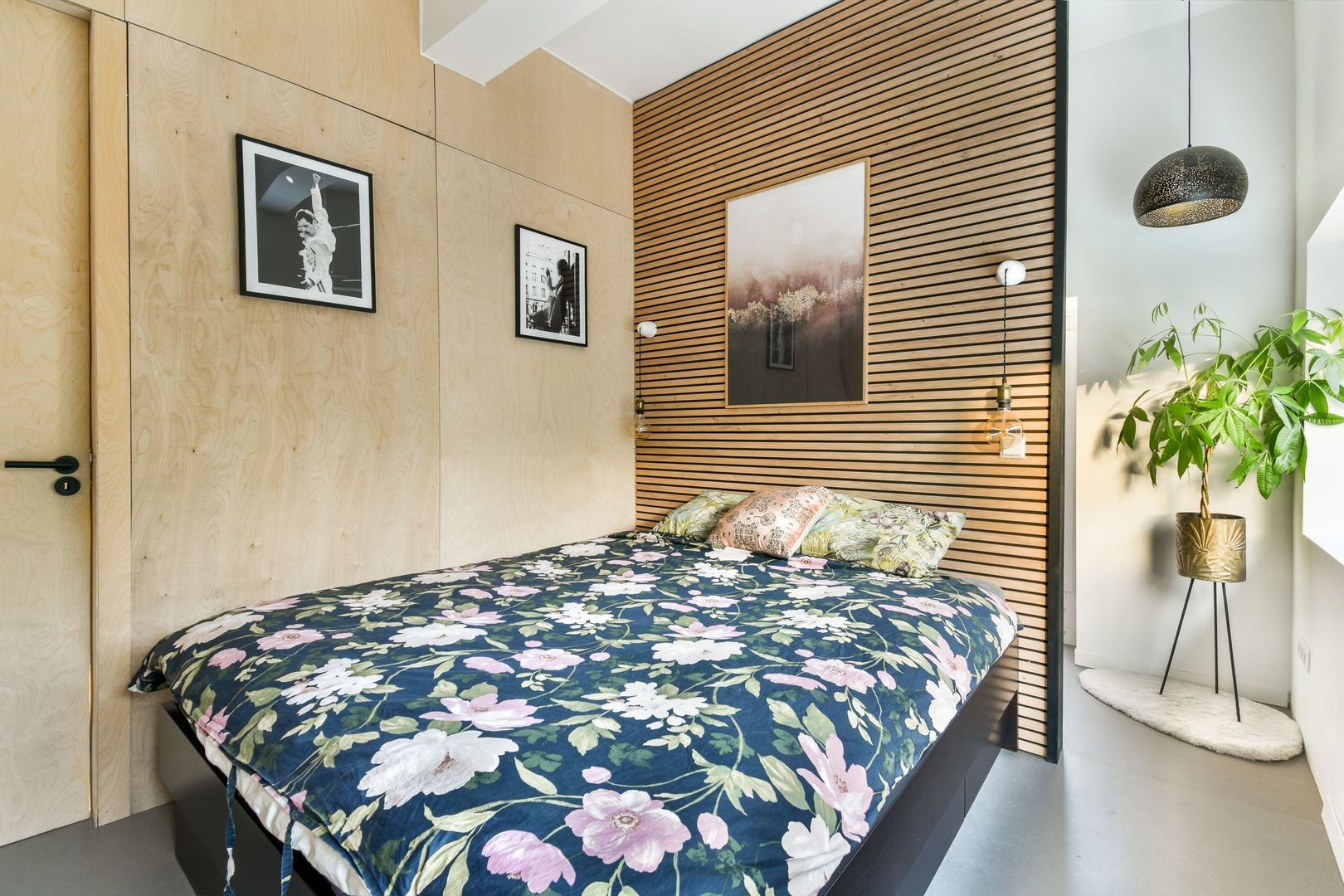 Slaapkamer van bijna 12 m2 met tussenwand met inloopkast en deur naar de tuin. In een vaste kast zit de wasmachineaansluiting, eventueel te combineren met een droger er bovenop.