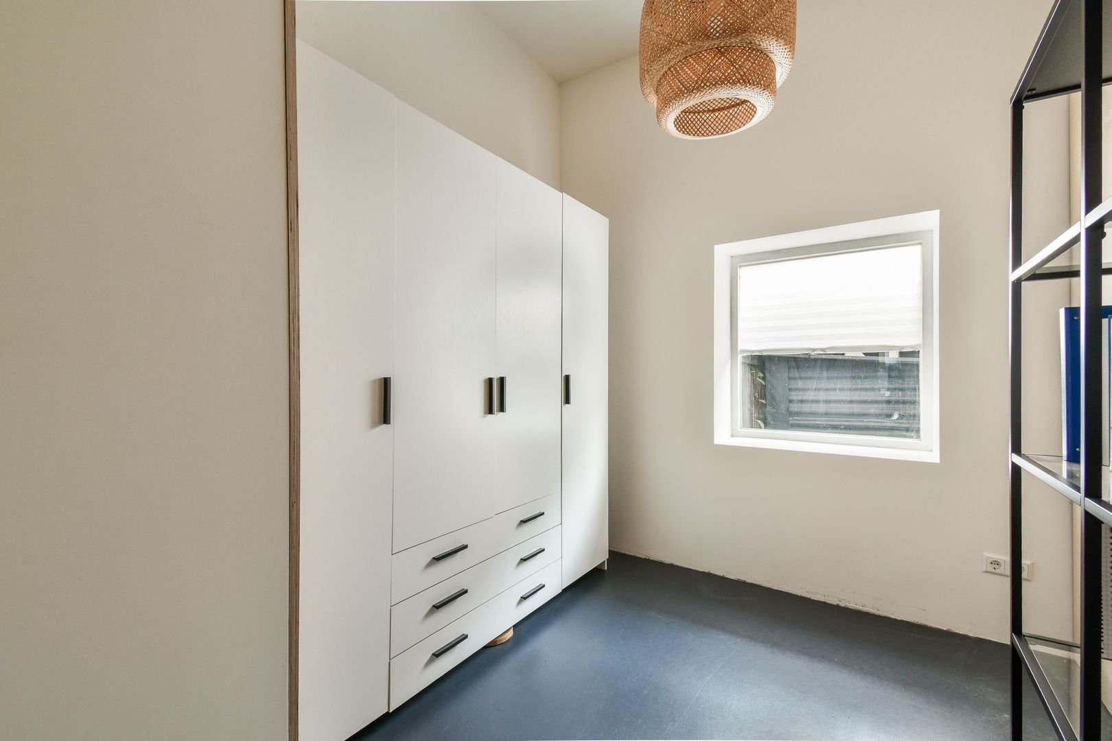 Tweede slaapkamer van ca. 7,5 m2 met hoge vaste kast. Badkamer met betegelde vloer en uitgevoerd in beton ciré. De badkamer is voorzien van een inloopdouche met onder andere een Grohe regendouche en er zijn twee wastafels. Ook een Villeroy & Boch hangend toilet is aanwezig in de badkamer.