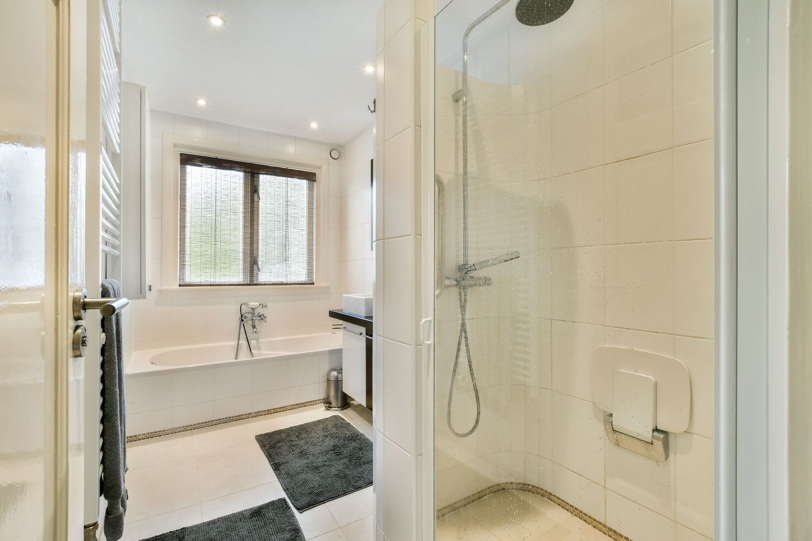 Overloop met lichtinval via het fraai glas-in-loodraam. Tweede toilet, gedeeltelijk betegeld en vrijhangend. Slaapkamer aan achterzijde van ruim 11 m2 met openslaande deuren naar het balkon (ruim 4 m2 m2), kastenwand over de gehele breedte van de slaapkamer, inbouwspots en praktisch berg/tvmeubel. Slaapkamer aan voorzijde van eveneens ruim 11 m2 met glas-in-lood bovenlichten. Kleine kamer aan voorzijde met glas-in-lood bovenlicht. Deze kamer is goed als werk-/bergkamer te gebruiken. Uitgebouwde badkamer van ruim 6 m2. De badkamer is geheel betegeld en voorzien van plafond met inbouwspots, inloopdouche, whirlpool ligbad, dubbel wastafelmeubel en designradiator.