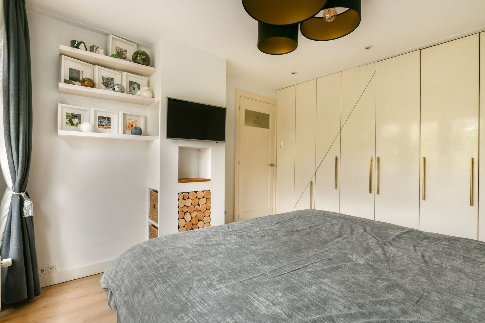 Binnenkomst in de kamer aan achterzijde van bijna 8 m2 met dakkapel en veel praktische bergruimte in de vorm van vaste kasten en knieschotten. Ook de bergvliering is van hieruit toegankelijk. De CV-combiketel en aansluitingen voor de wasmachine en droger zijn in de kasten weggewerkt.