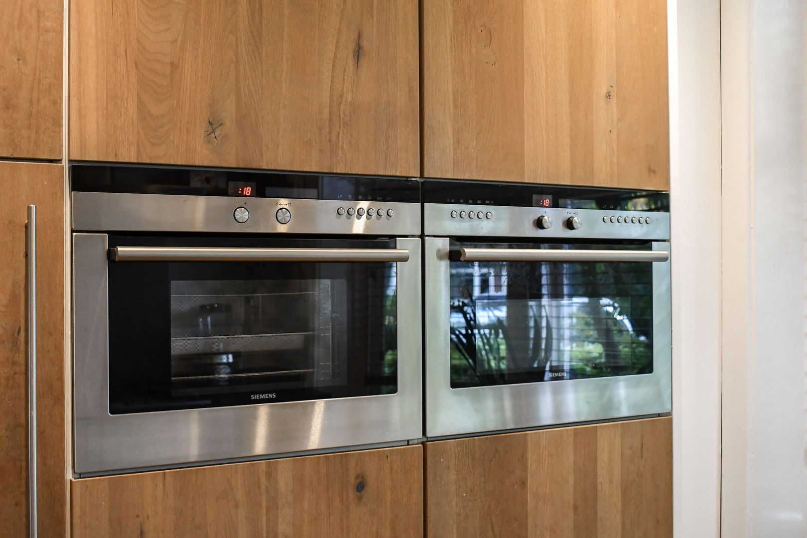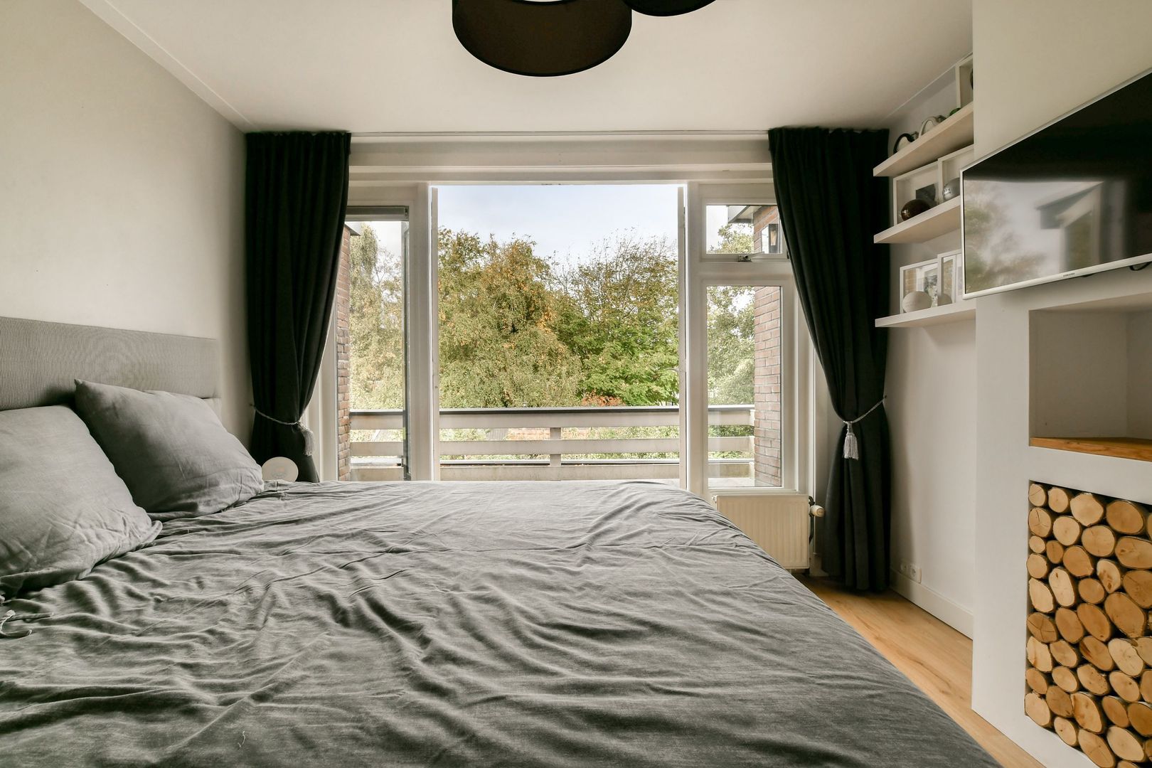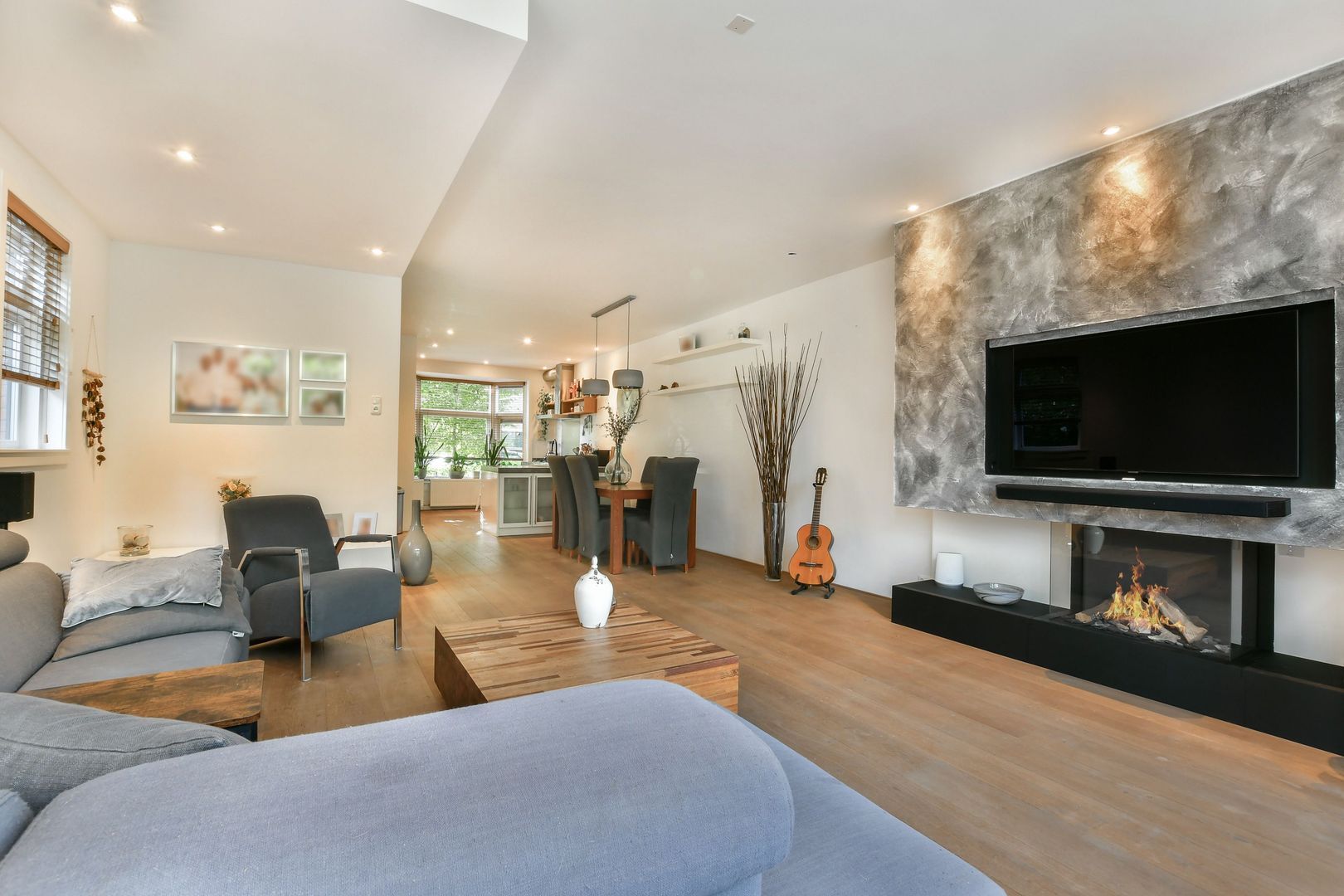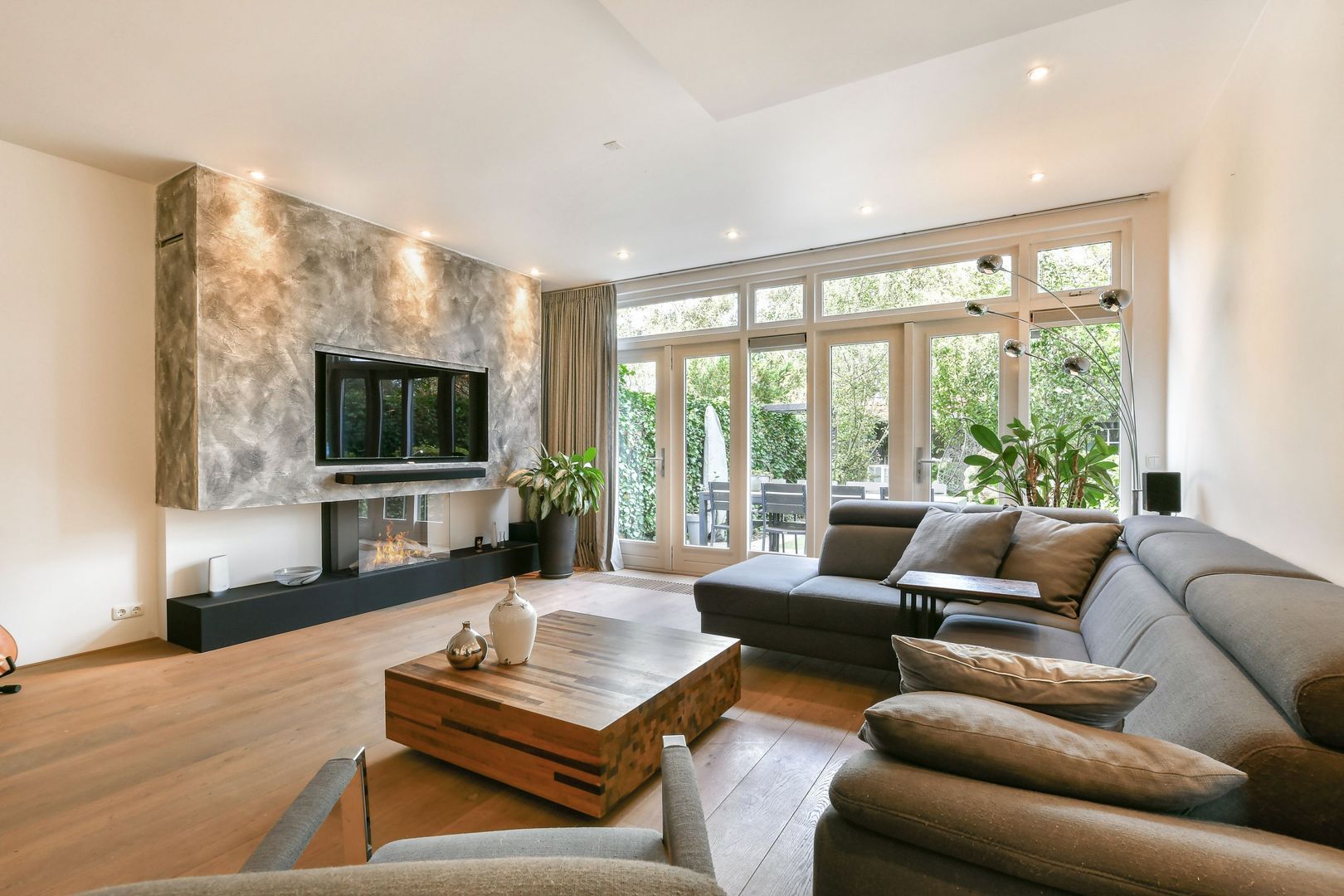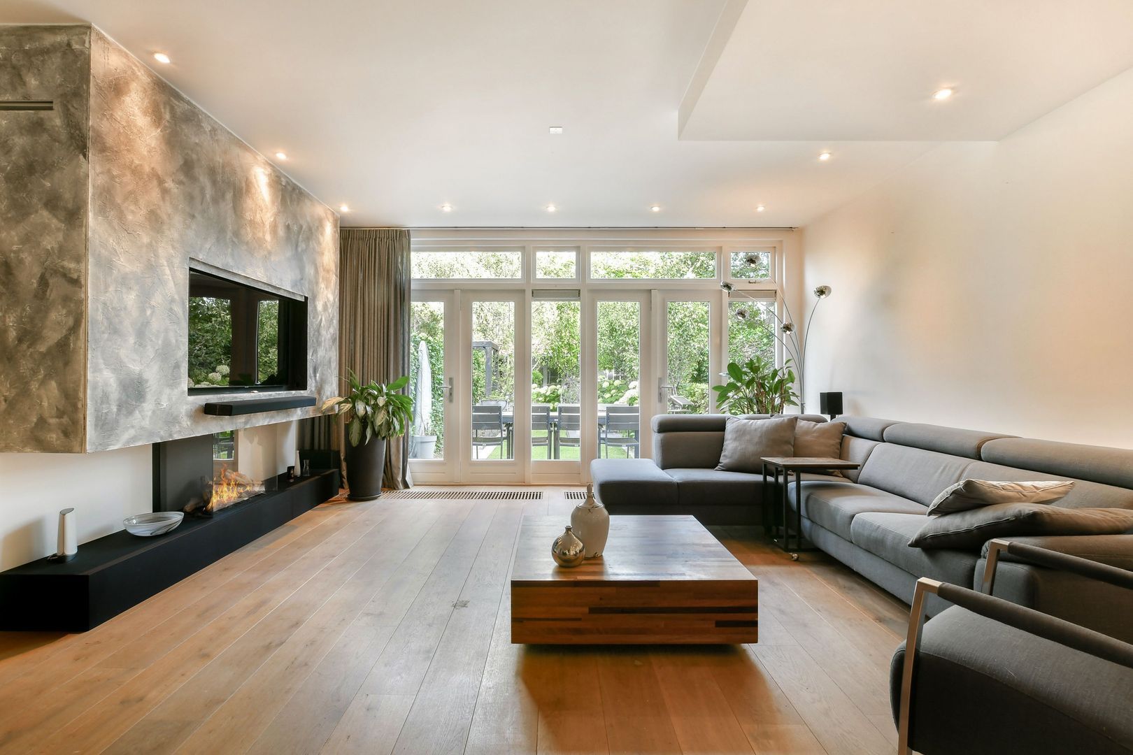 De strak uitgevoerde en tuingerichte woonkamer heeft dubbele openslaande deuren naar de achtertuin met twee convectorputten. De moderne gashaard is geïntegreerd in één meubel samen met de tv en twee kasten. Met één druk op de knop komt de tv tevoorschijn!