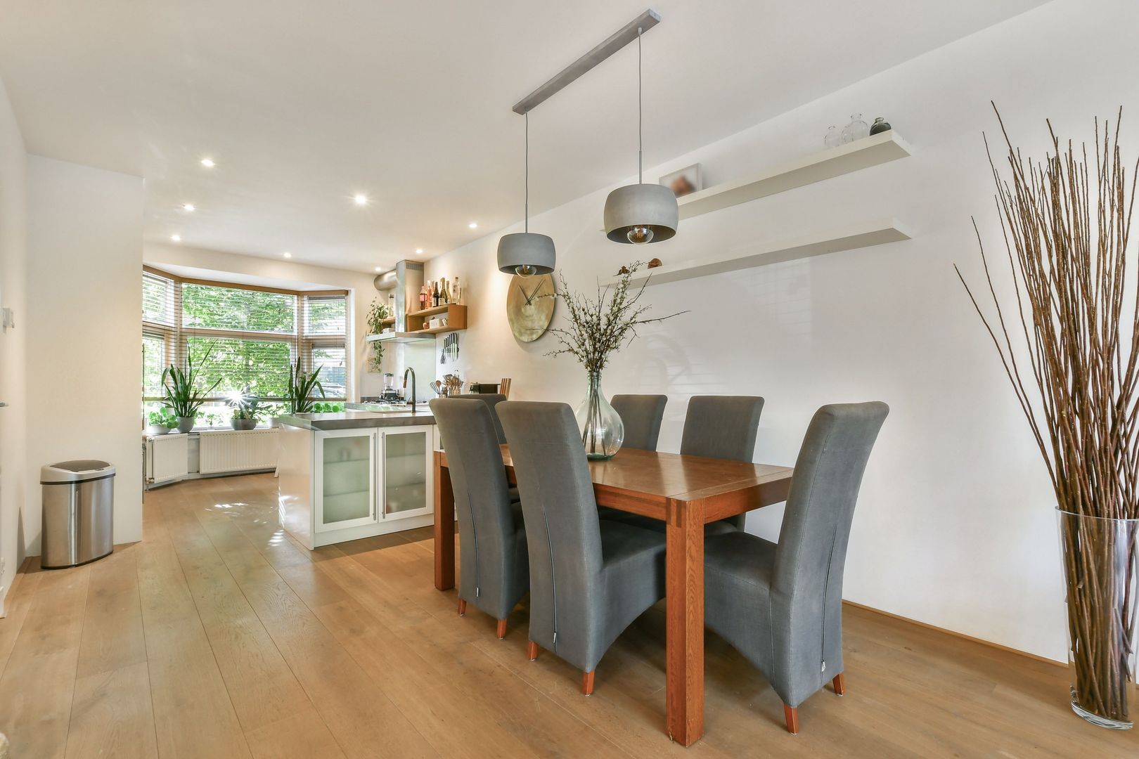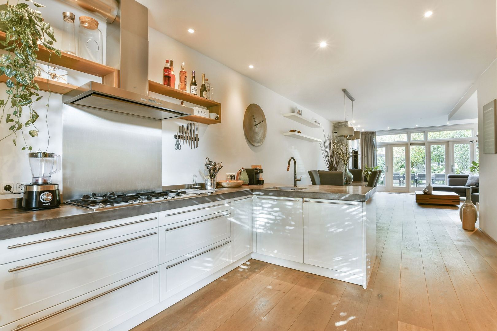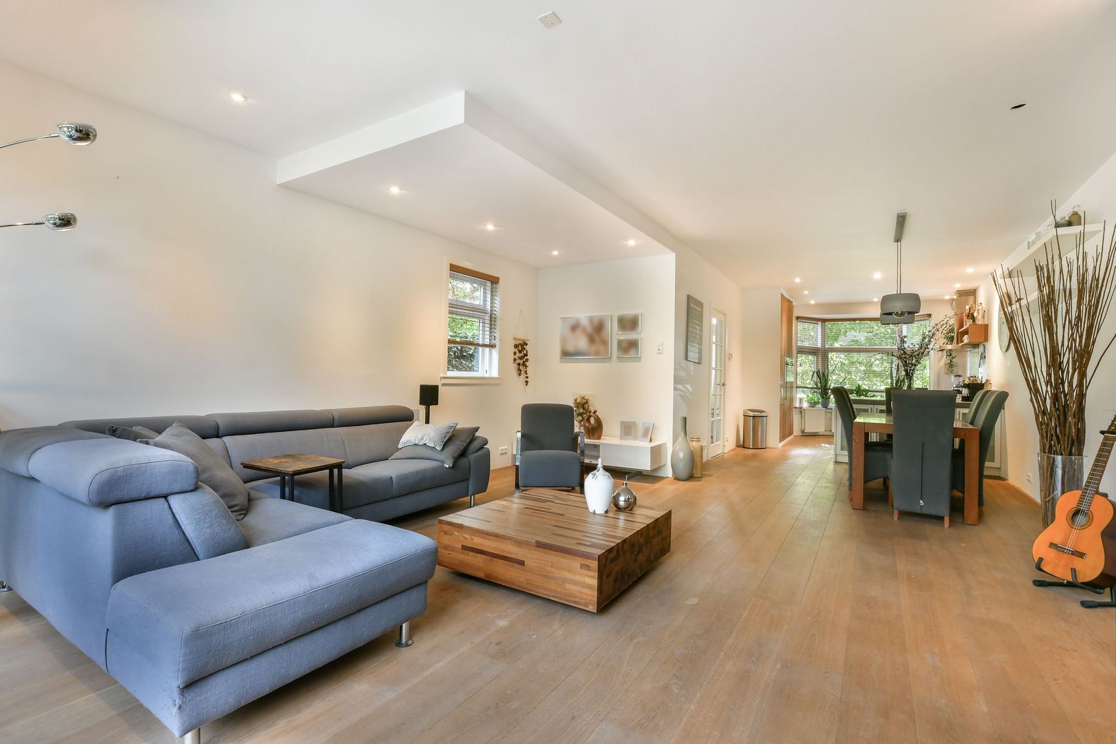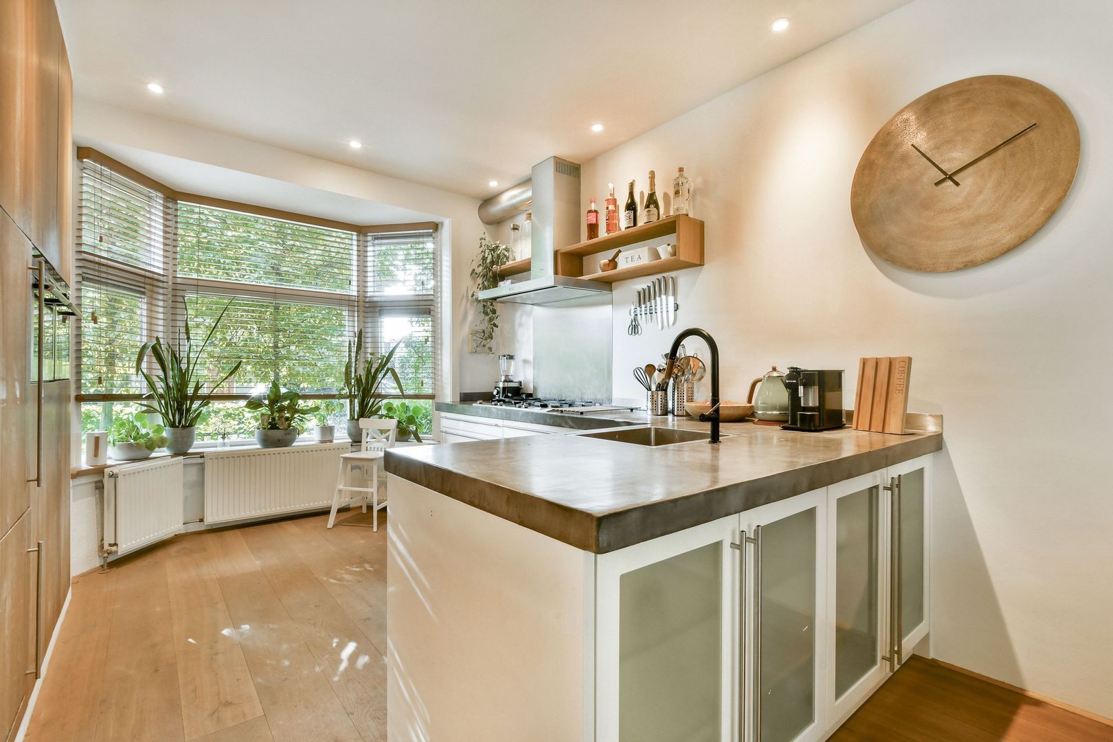 Uitgebouwde woonkamer met open keuken en een totaal oppervlakte van ca. 52 m2, voorzien van houten vloerdelen en inbouwverlichting. De keuken met erker ligt aan de voorzijde. Het keukenblok bestaat uit een L-vormig blok en separaat hoog wandblok en is naast diverse bergruimte uitgevoerd met Beton Ciré aanrechtblad, spoelbak, 5-pits gaskookplaat, RSV spatscherm en afzuigkap, vaatwasser, koelkast, combi magnetron en stoomoven.