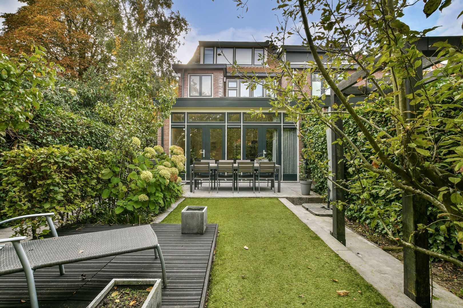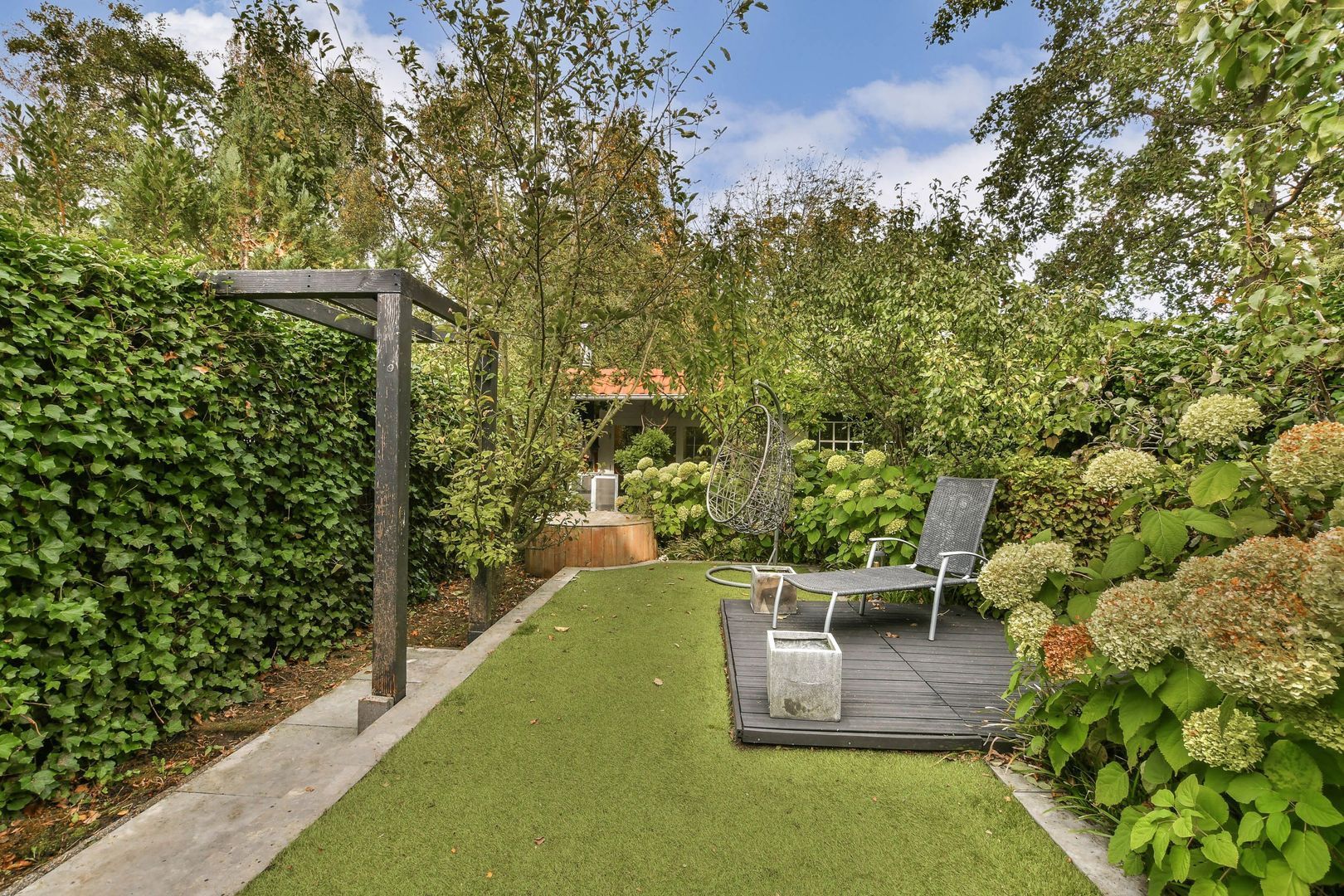 Fraai aangelegde achtertuin op het noordwesten van bijna 15 meter diep en ca. 7,5 meter breed met groot terras, bestrating, kunstgras en groenborders. Achterin de tuin ligt de enorme berging/werkplaats van bijna 25 m2. Deze berging met betonvloer is geïsoleerd en voorzien van elektra en wateraansluiting. Achterin de tuin liggen ook de sfeervolle veranda en de hottub. Ontsluiting van de achtertuin kan via de poort in de zijtuin naast de woning, maar ook via de openslaande deuren in de berging.