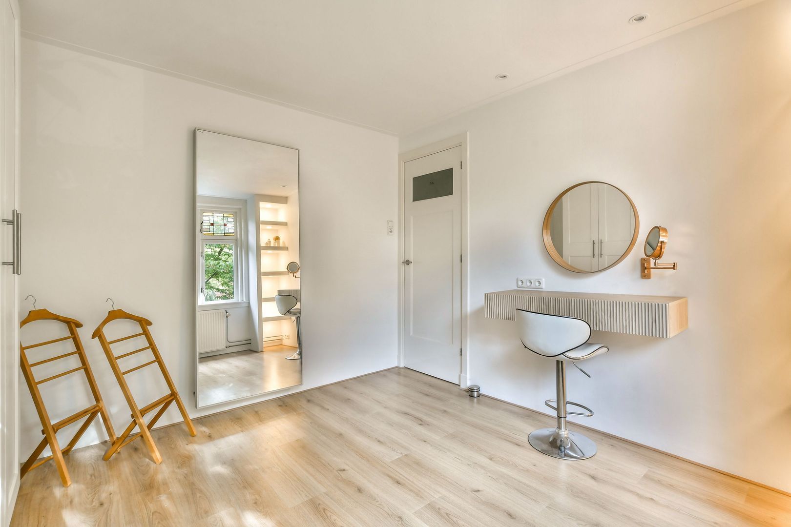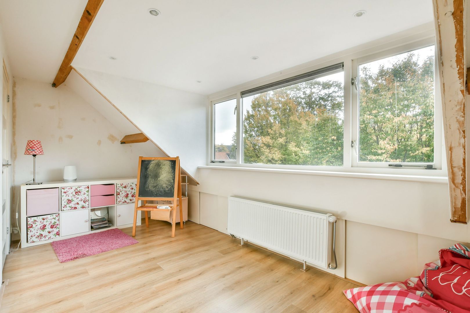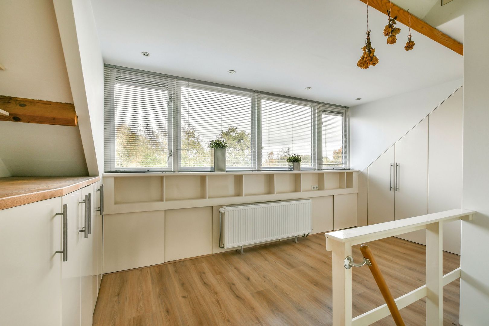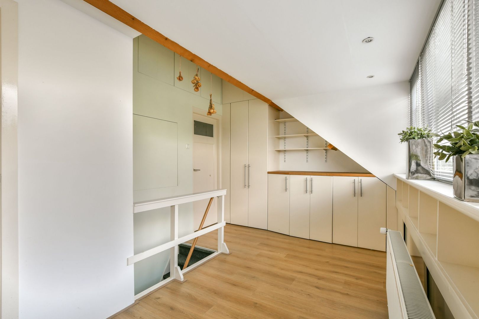 Binnenkomst in de kamer aan achterzijde van bijna 8 m2 met dakkapel en veel praktische bergruimte in de vorm van vaste kasten en knieschotten. Ook de bergvliering is van hieruit toegankelijk. De CV-combiketel en aansluitingen voor de wasmachine en droger zijn in de kasten weggewerkt.