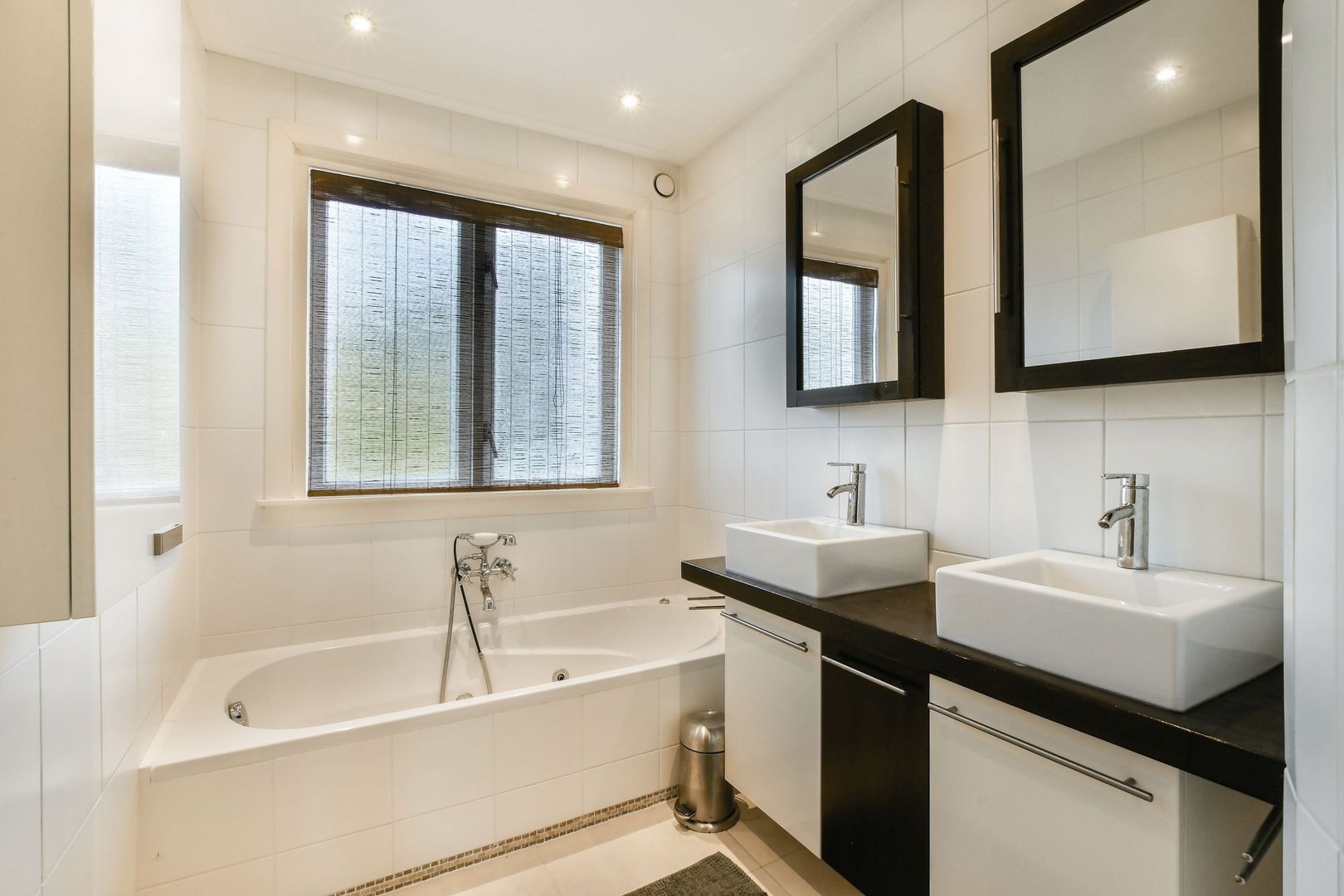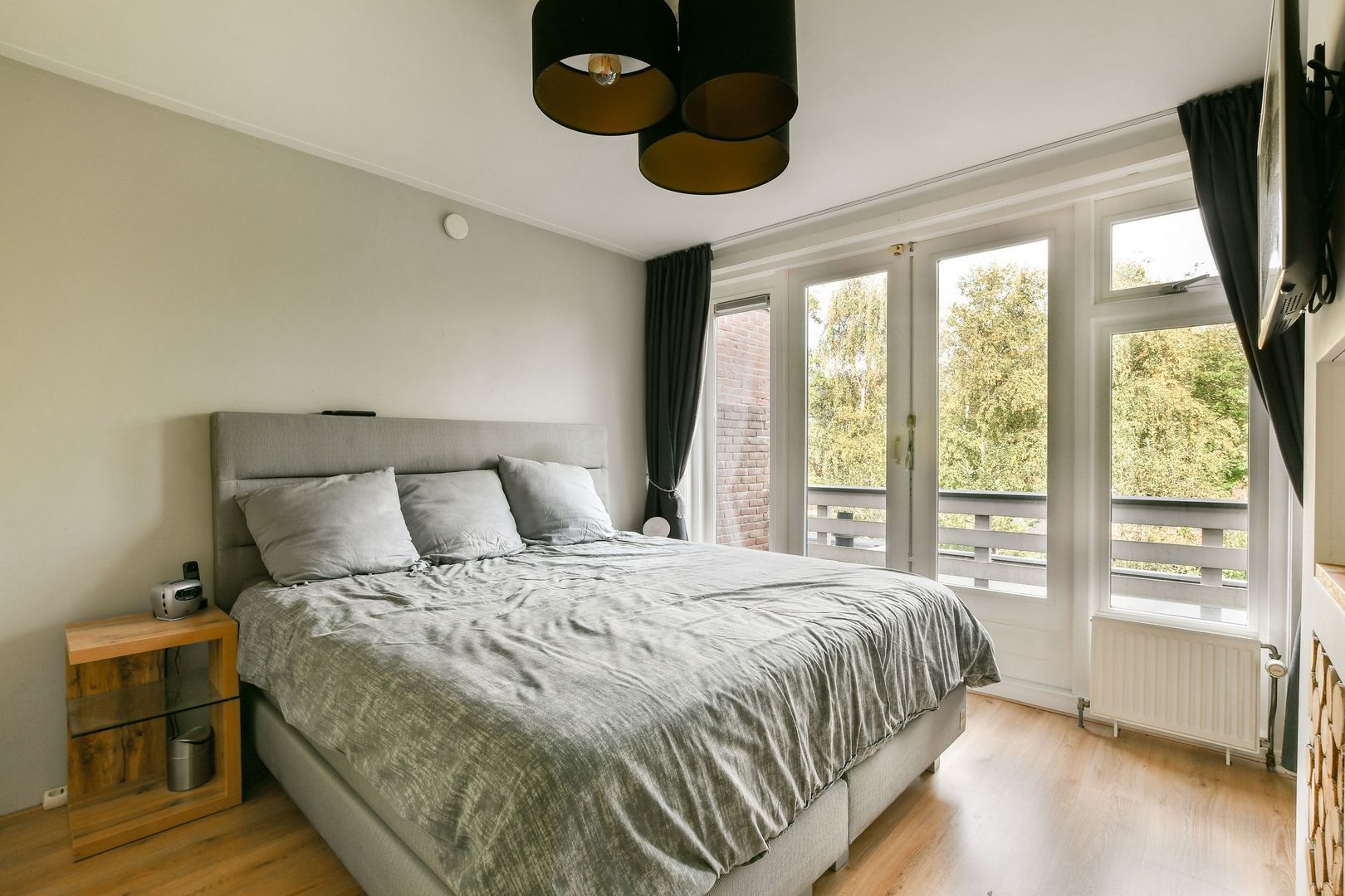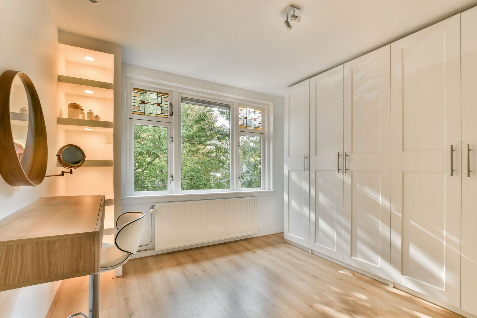 Overloop met lichtinval via het fraai glas-in-loodraam. Tweede toilet, gedeeltelijk betegeld en vrijhangend. Slaapkamer aan achterzijde van ruim 11 m2 met openslaande deuren naar het balkon (ruim 4 m2 m2), kastenwand over de gehele breedte van de slaapkamer, inbouwspots en praktisch berg/tvmeubel. Slaapkamer aan voorzijde van eveneens ruim 11 m2 met glas-in-lood bovenlichten. Kleine kamer aan voorzijde met glas-in-lood bovenlicht. Deze kamer is goed als werk-/bergkamer te gebruiken. Uitgebouwde badkamer van ruim 6 m2. De badkamer is geheel betegeld en voorzien van plafond met inbouwspots, inloopdouche, whirlpool ligbad, dubbel wastafelmeubel en designradiator.
