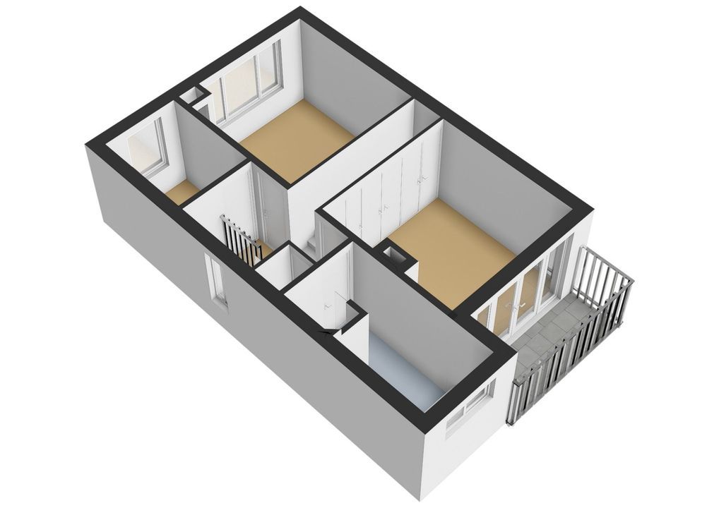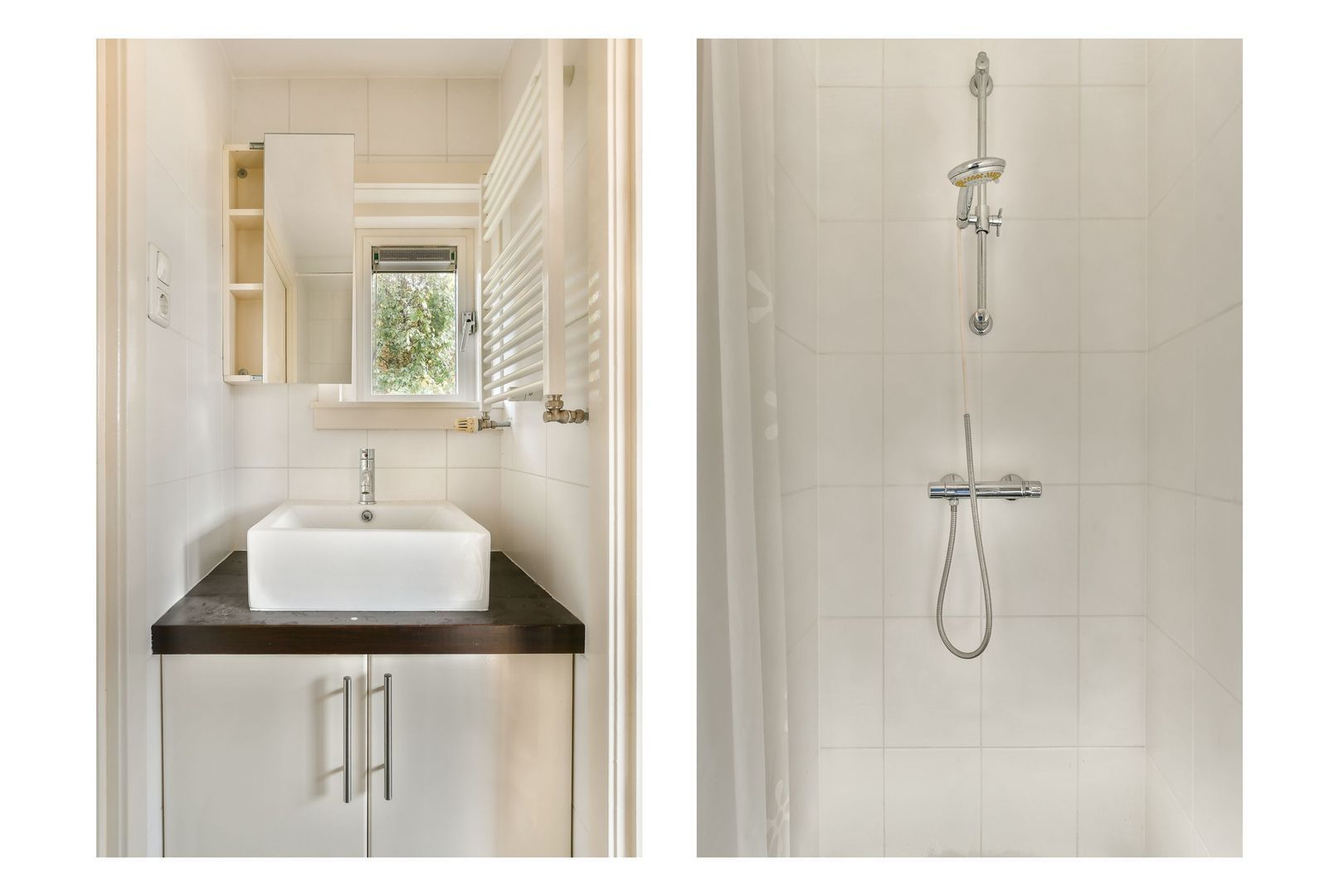 Slaapkamer aan voorzijde met een vloeroppervlakte van bijna 11 m2, dakkapel en vaste kasten. Tussen de twee kamers ligt de geheel betegelde doucheruimte met douche, wastafelmeubel en inbouwspots. De doucheruimte is vanuit beide kamers toegankelijk.