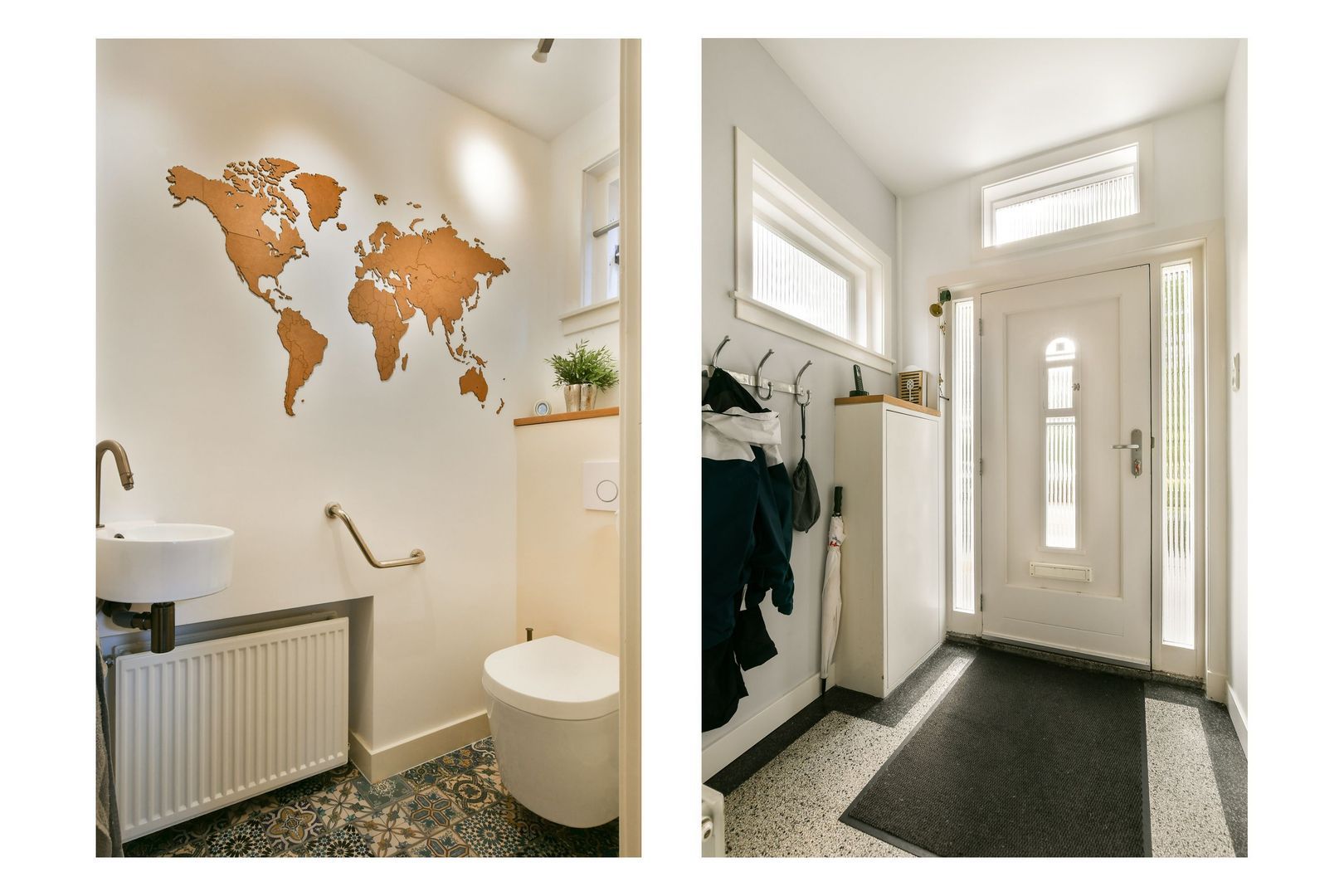 Entree via de bijna 5 meter diepe voortuin. Tochtportaal met granieten vloer, meterkast. Hal eveneens met granieten vloer, trapopgang, trap/kelderkast. Ruim toilet met hangende closet en hoekfontein.