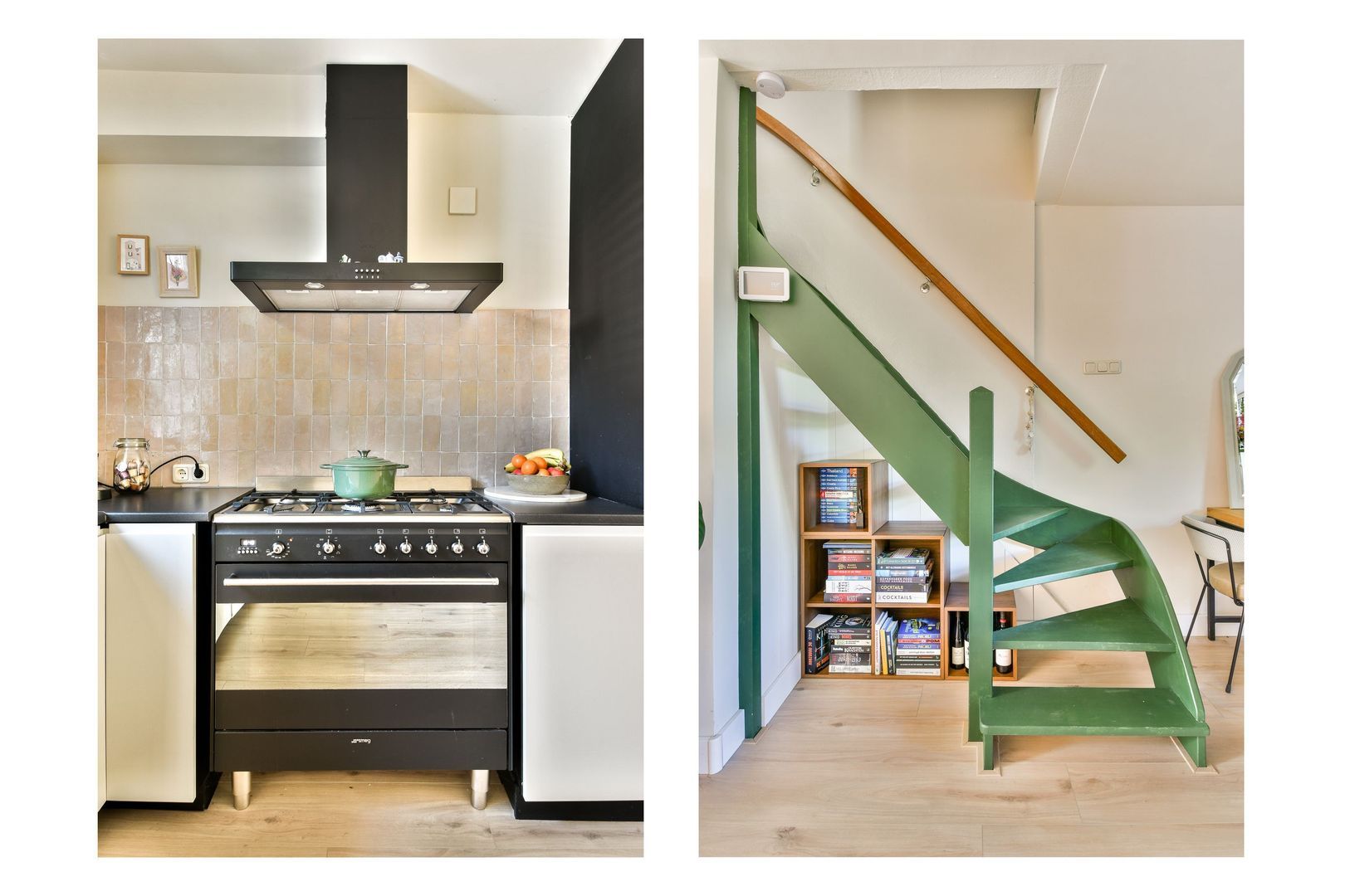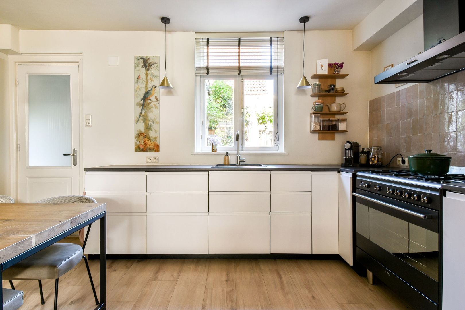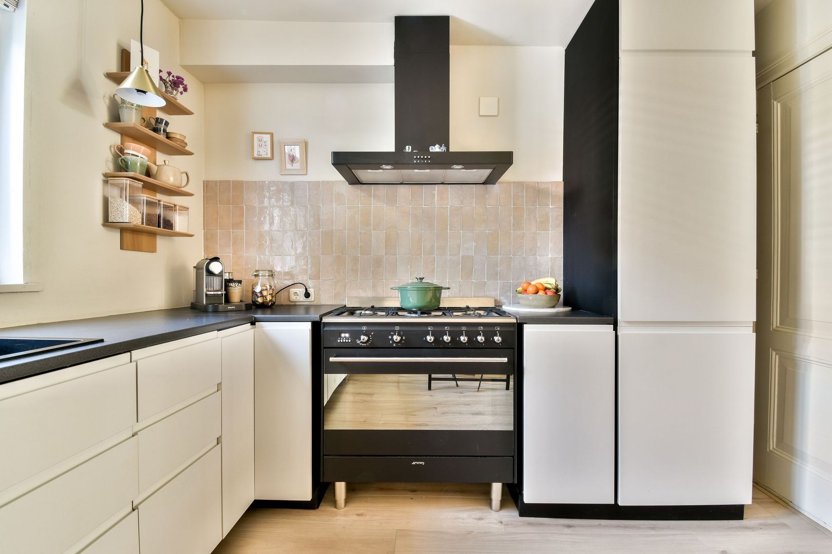 Aan de achterzijde is een open keuken gerealiseerd in L-opstelling met de navolgende inbouwapparatuur; koel-/vriescombi, vaatwasser, Smeg fornuis met oven en 5 gaspitten.