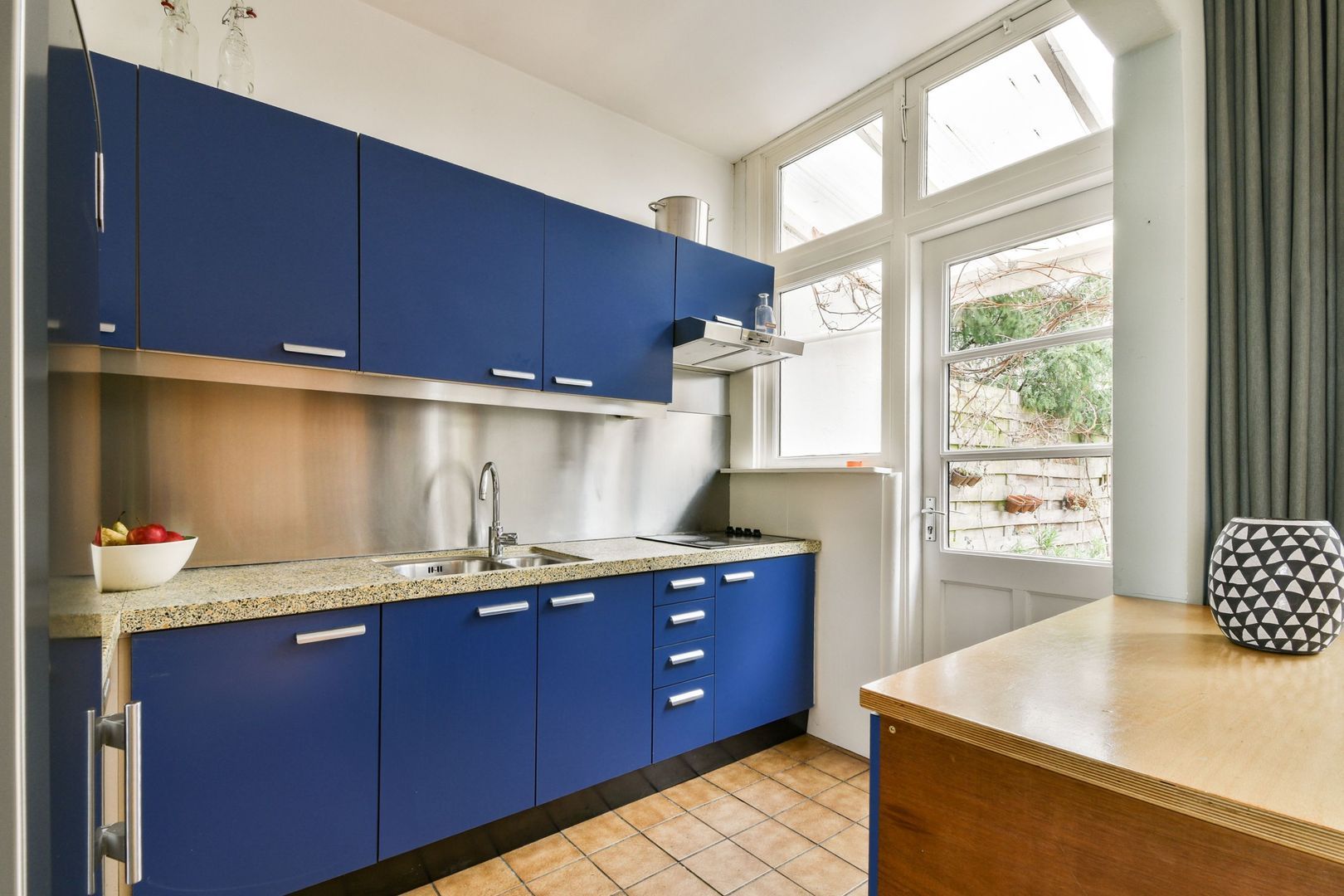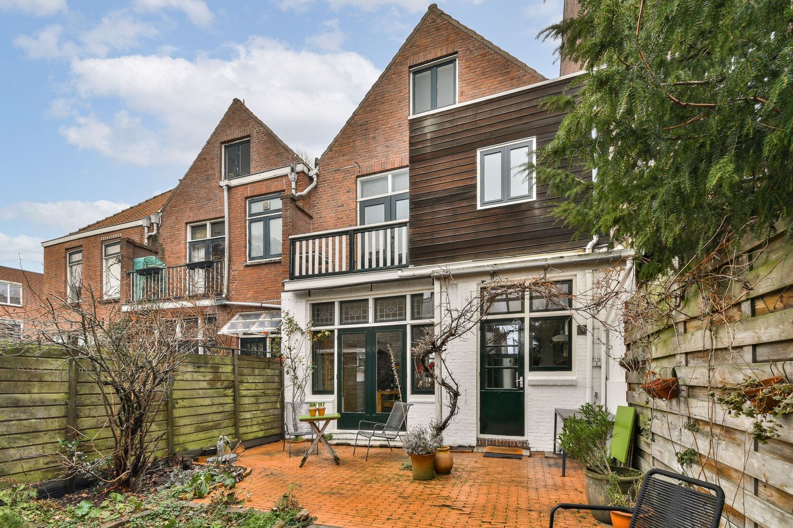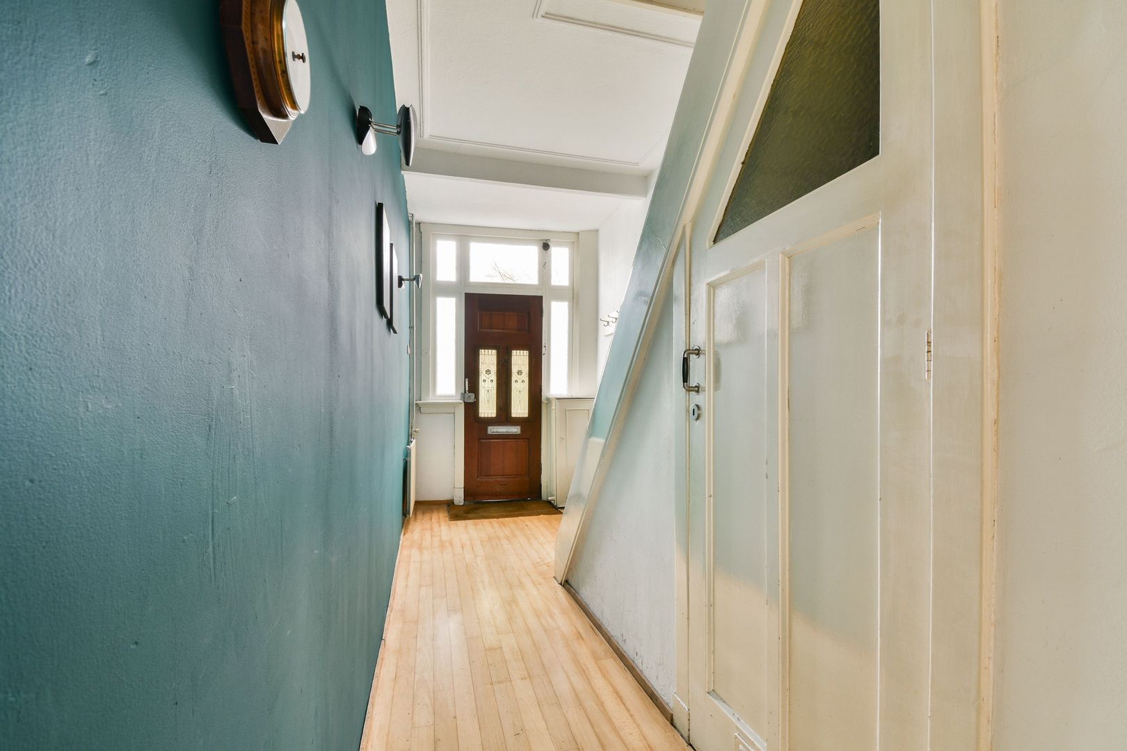 Entreehal met meterkast, trapopgang naar 1e verdieping en trap-/kelderkast. Betegeld toilet met fontein. Doorzon woonkamer met een oppervlakte van ca. 36 m2. De woonkamer is gemiddeld 9.20 lang, de voorgevel loopt schuin weg. Er is een houten vloer, ornamenten plafond en vanuit de woonkamer zijn openslaande deuren naar de tuin. Hier zijn ook glas-in-loodramen (met voorzetramen). Open keuken van ca. 4 m2 met eveneens deur naar de tuin en functioneel keukenblok in hoekopstelling met keramische kookplaat, afzuigkap en overig losse apparatuur.