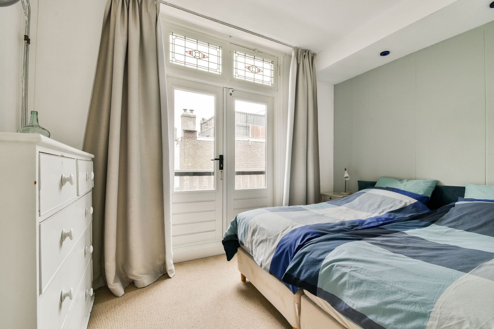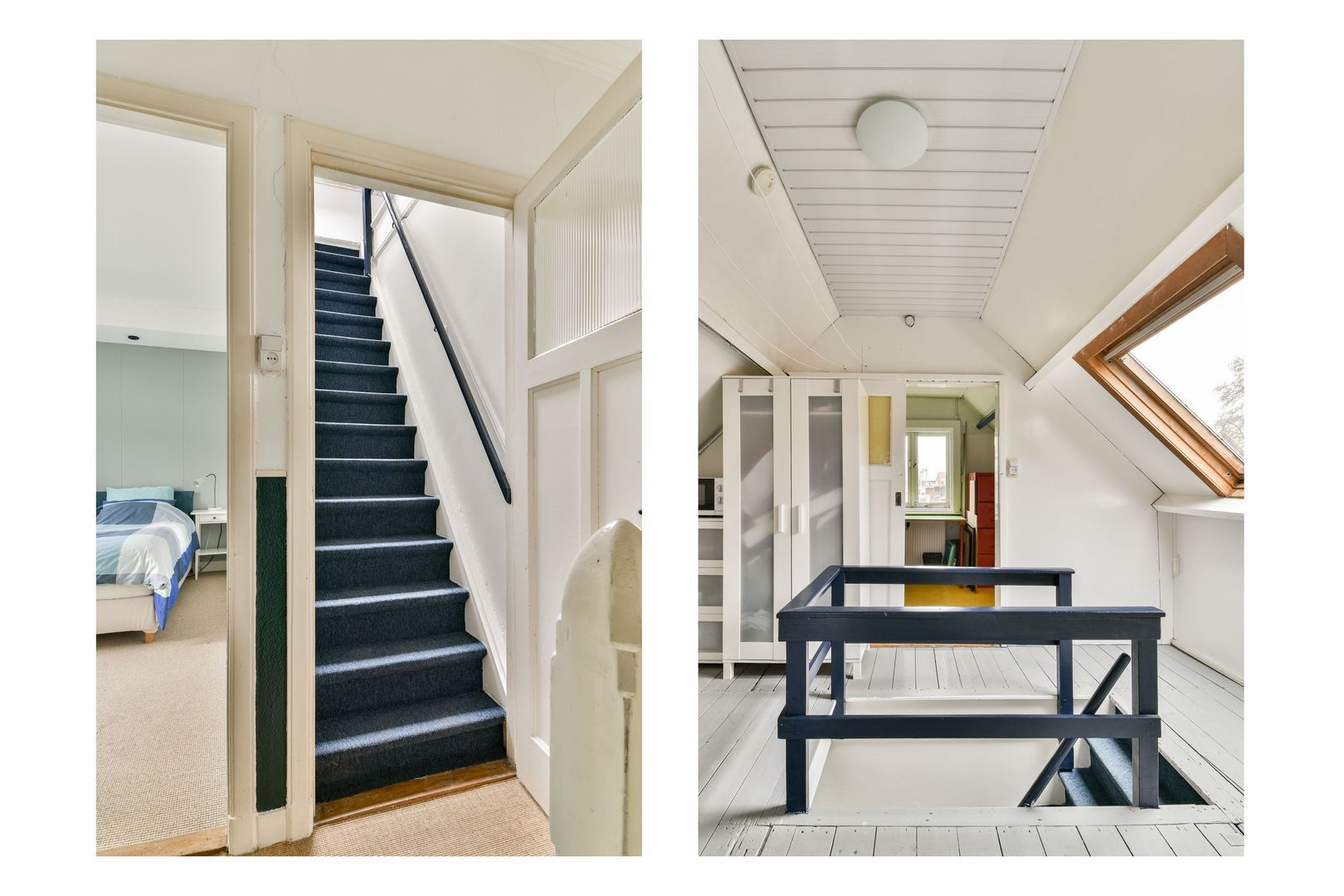 Overloop met toegang tot alle vertrekken van deze verdieping. Slaapkamer aan de voorzijde van ca. 16 m2. De tweede (slaap)kamer aan de voorzijde is bijna 6 m2 groot. Aan de achterzijde ligt een slaapkamer van ruim 11 m2 met openslaande deuren naar het balkon. Ook hier weer glas-in-loodramen met voorzetramen. Vanuit deze slaapkamer is de ruimte trapkast toegankelijk.