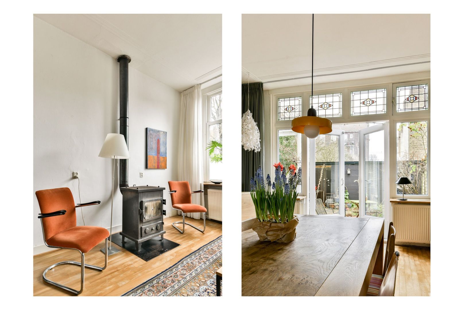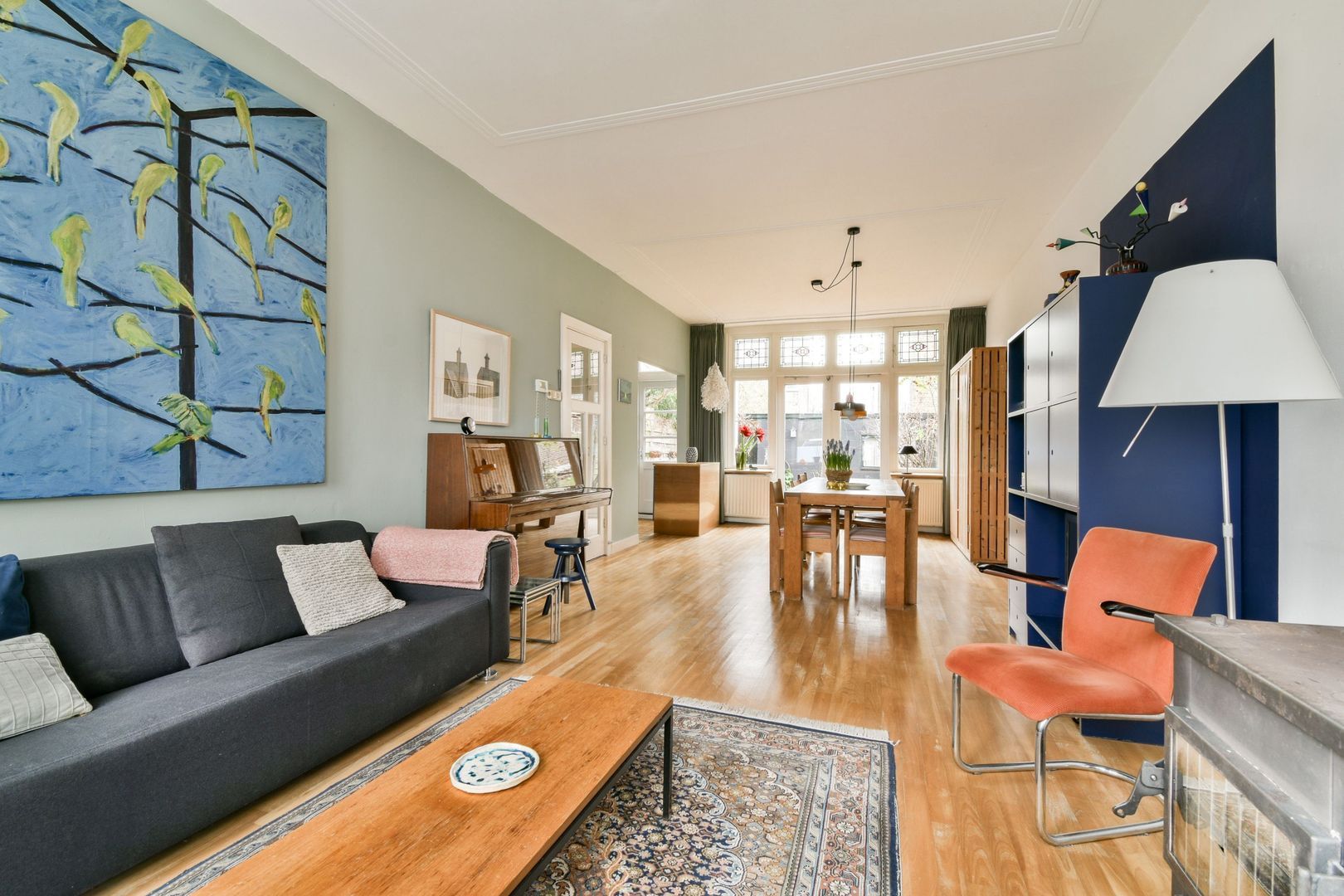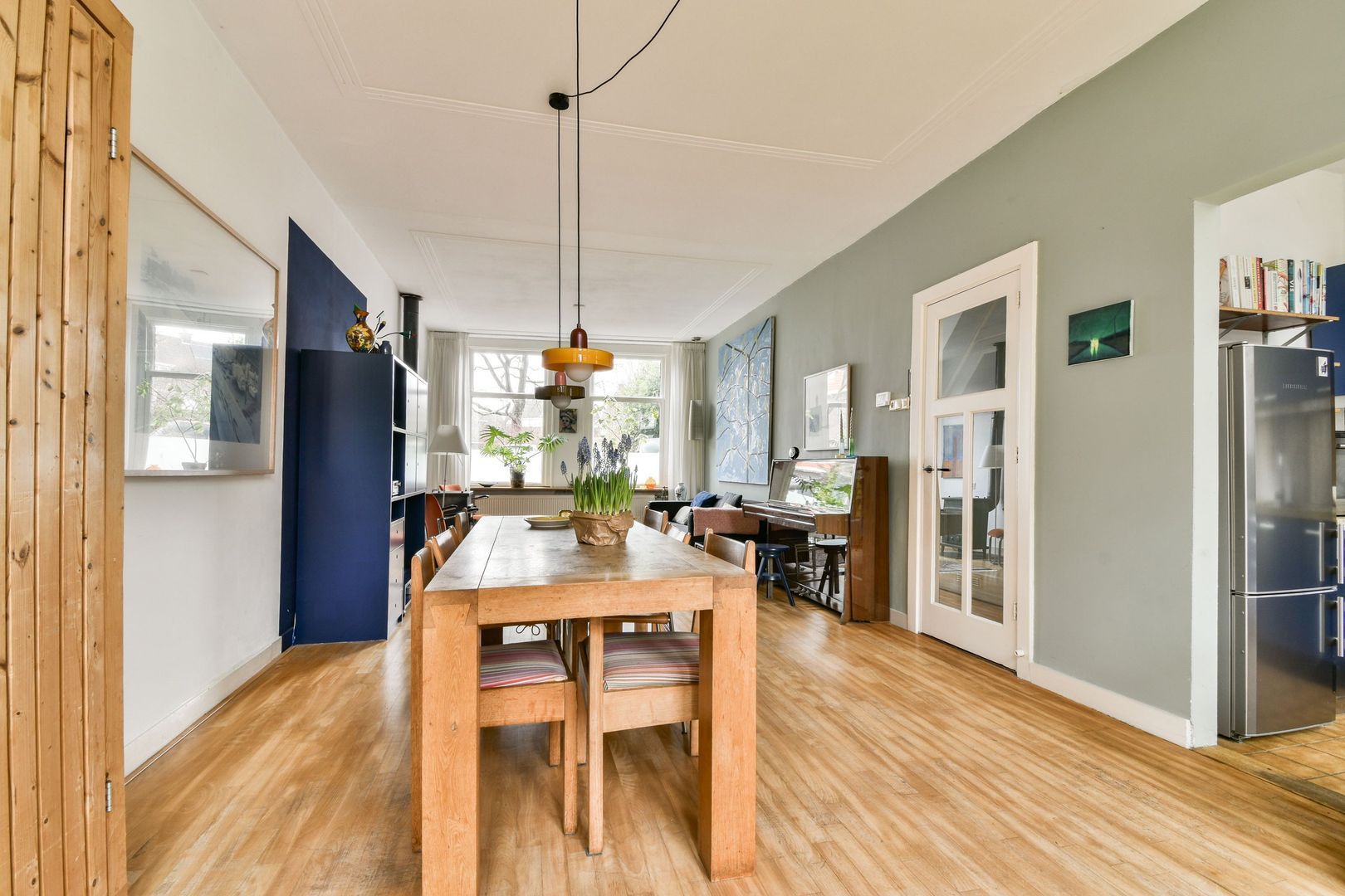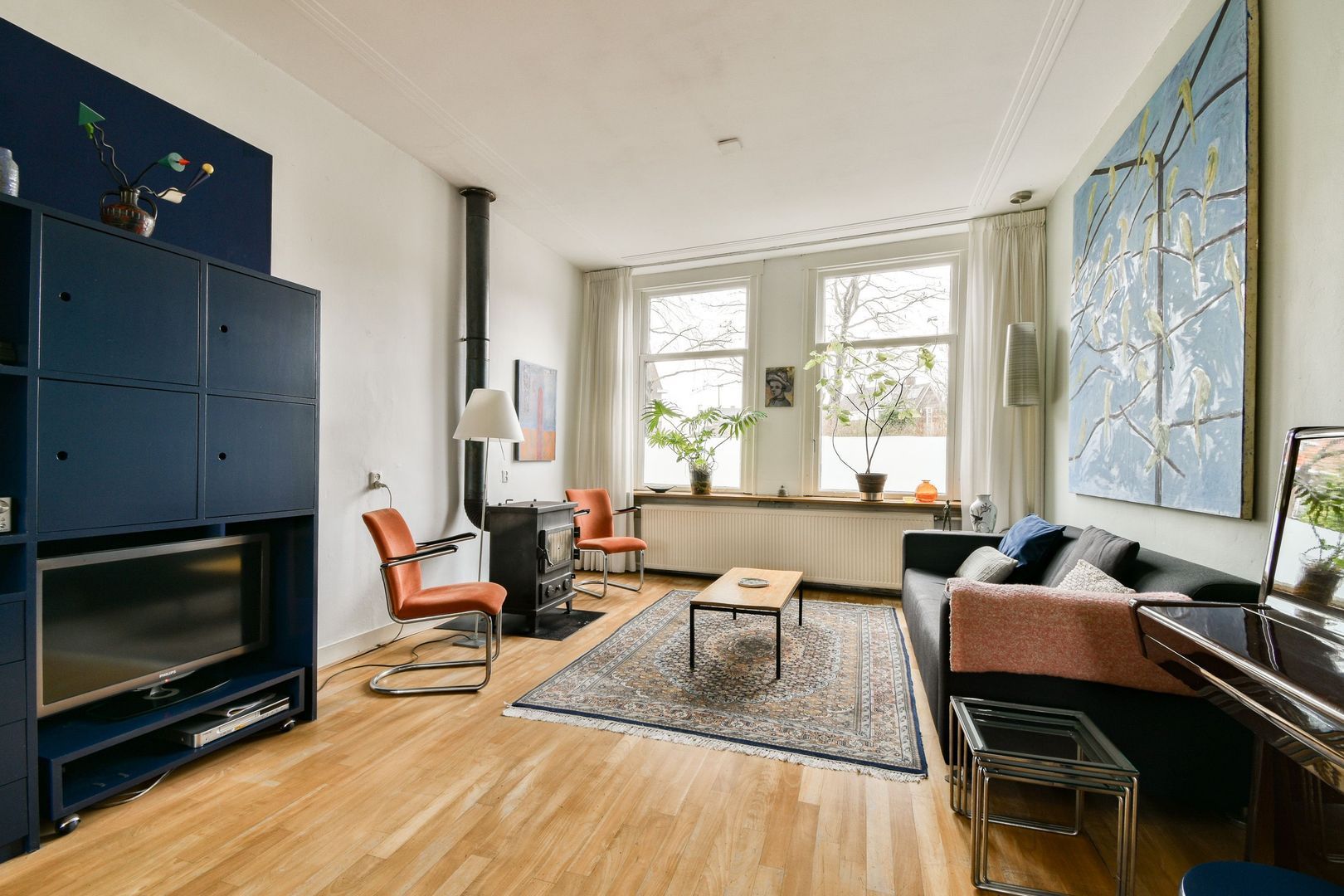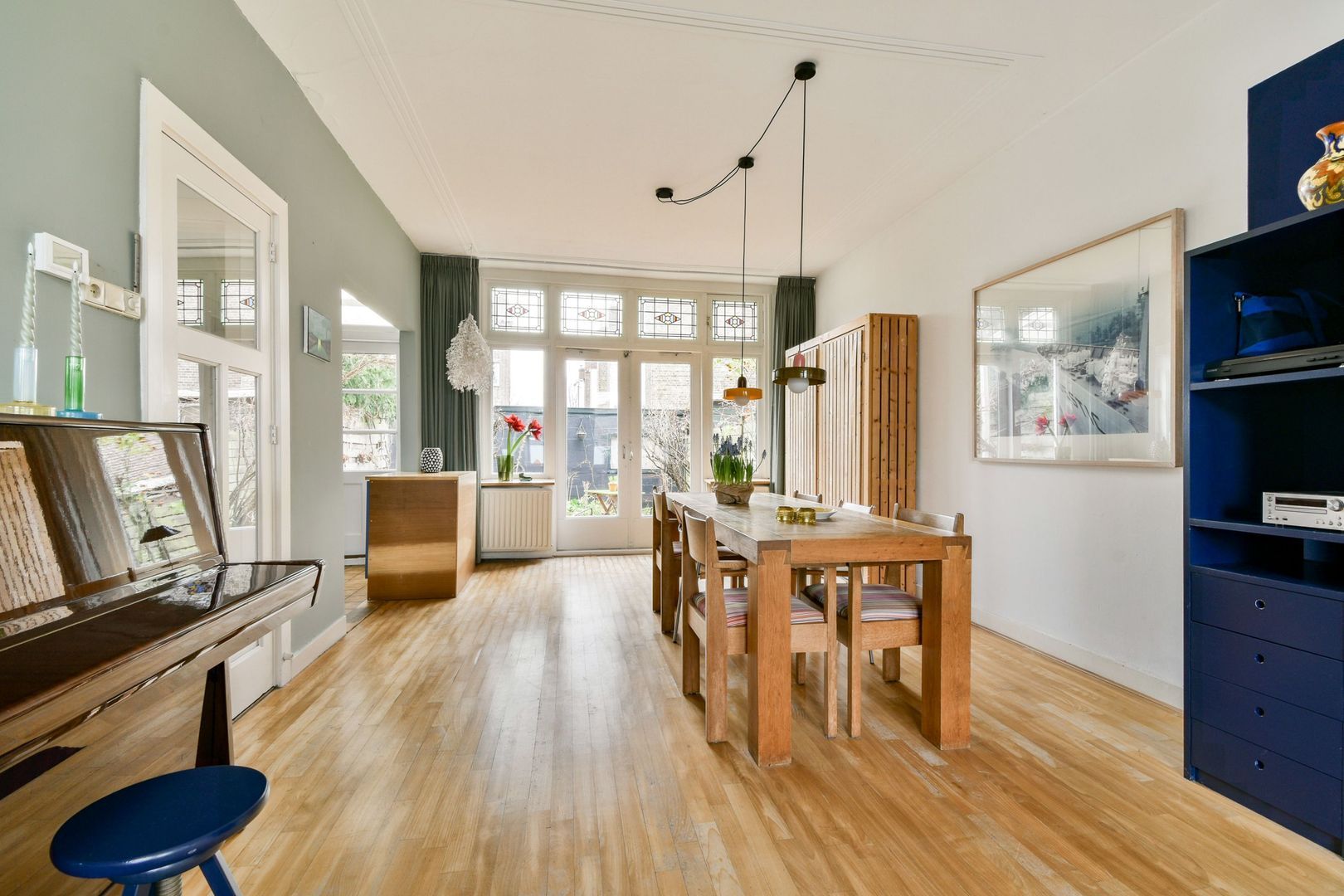 Entreehal met meterkast, trapopgang naar 1e verdieping en trap-/kelderkast. Betegeld toilet met fontein. Doorzon woonkamer met een oppervlakte van ca. 36 m2. De woonkamer is gemiddeld 9.20 lang, de voorgevel loopt schuin weg. Er is een houten vloer, ornamenten plafond en vanuit de woonkamer zijn openslaande deuren naar de tuin. Hier zijn ook glas-in-loodramen (met voorzetramen). Open keuken van ca. 4 m2 met eveneens deur naar de tuin en functioneel keukenblok in hoekopstelling met keramische kookplaat, afzuigkap en overig losse apparatuur.