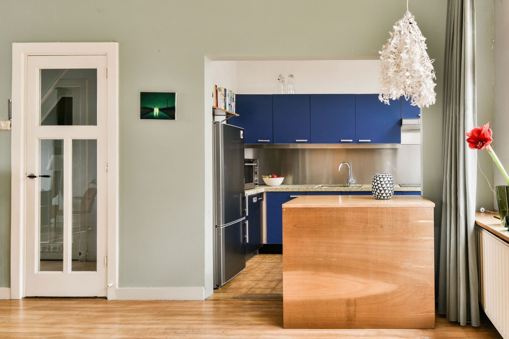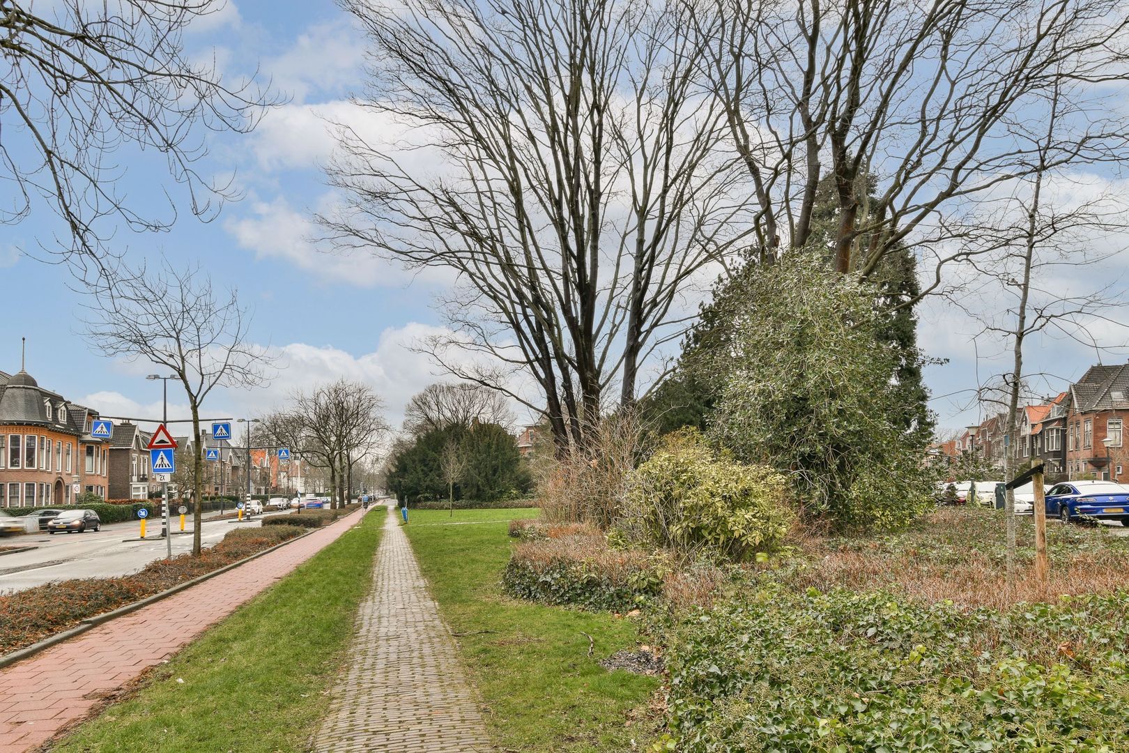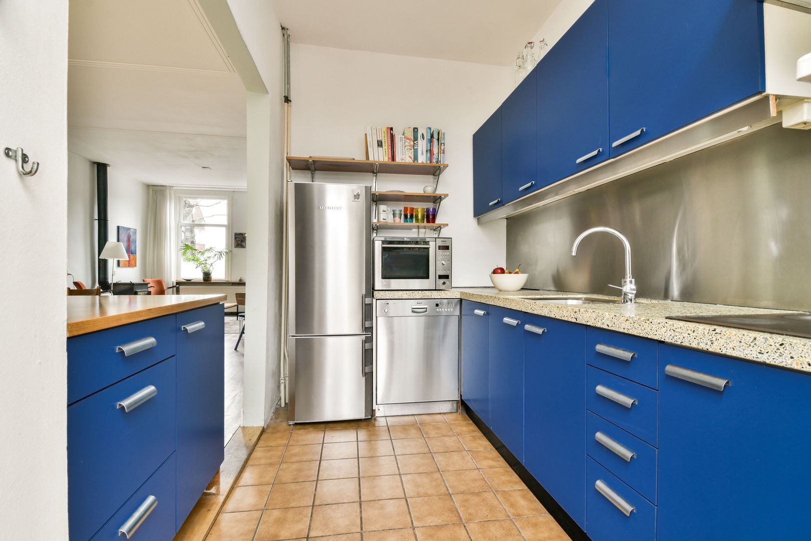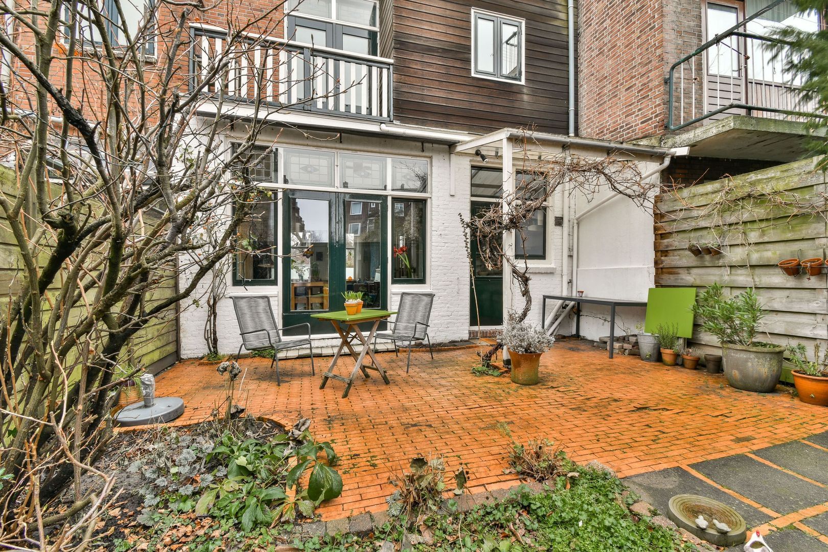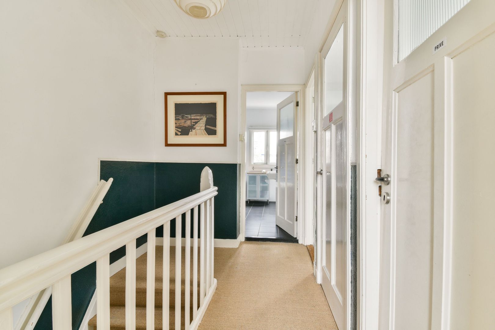 Entreehal met meterkast, trapopgang naar 1e verdieping en trap-/kelderkast. Betegeld toilet met fontein. Doorzon woonkamer met een oppervlakte van ca. 36 m2. De woonkamer is gemiddeld 9.20 lang, de voorgevel loopt schuin weg. Er is een houten vloer, ornamenten plafond en vanuit de woonkamer zijn openslaande deuren naar de tuin. Hier zijn ook glas-in-loodramen (met voorzetramen). Open keuken van ca. 4 m2 met eveneens deur naar de tuin en functioneel keukenblok in hoekopstelling met keramische kookplaat, afzuigkap en overig losse apparatuur.