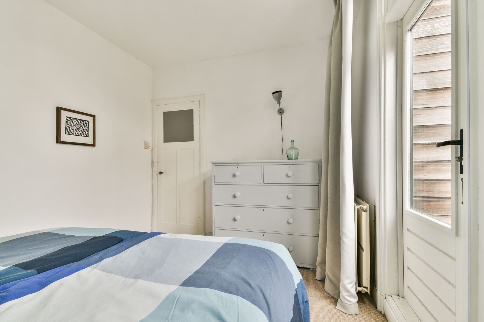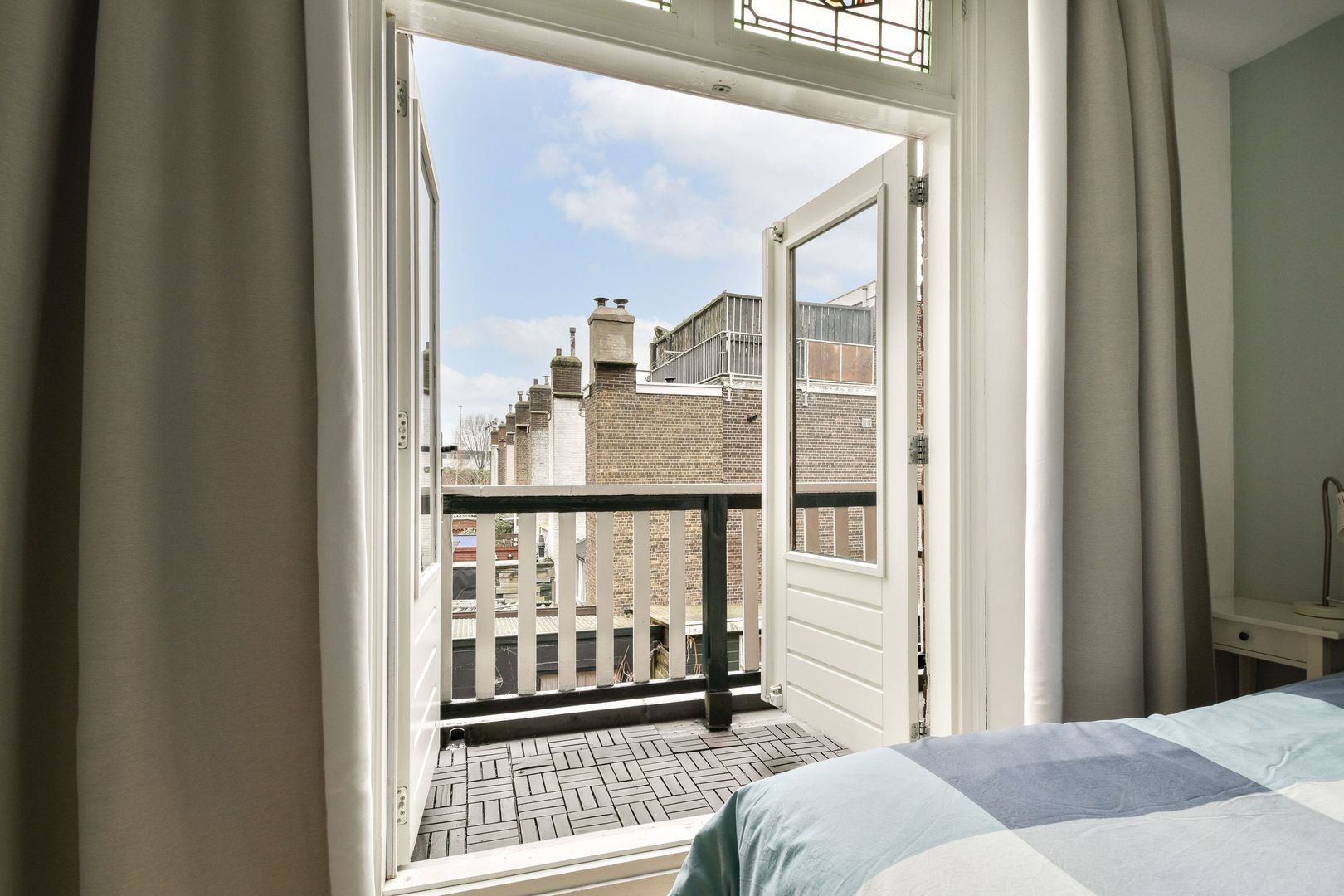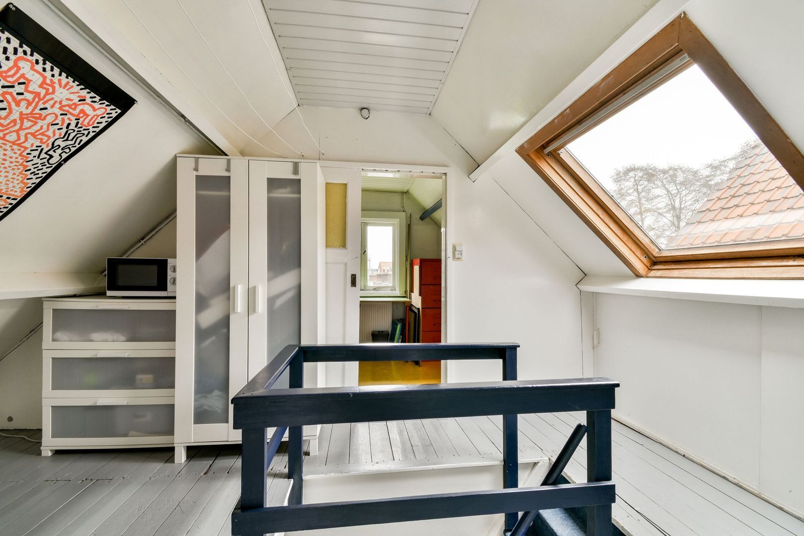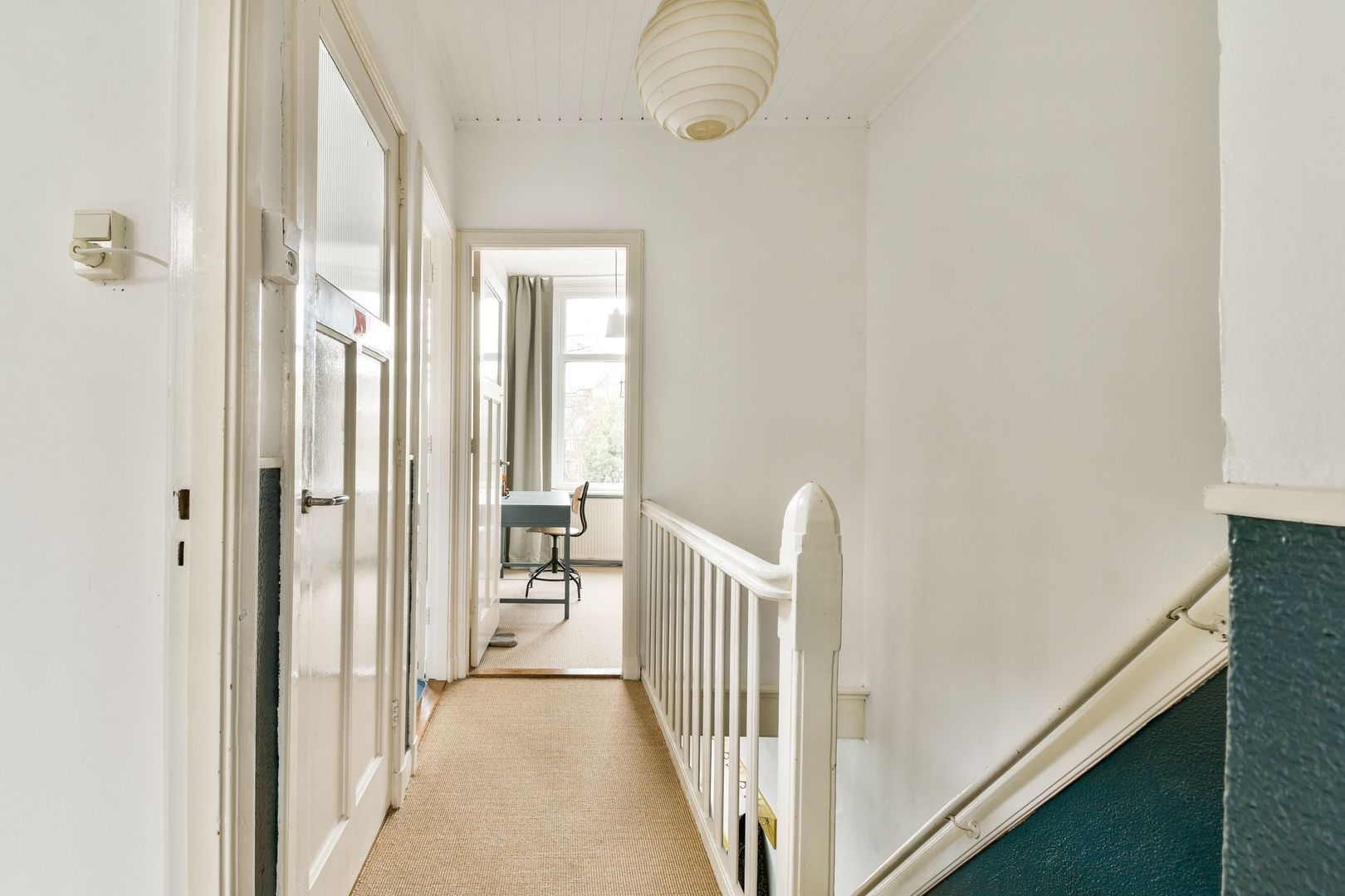 Overloop met toegang tot alle vertrekken van deze verdieping. Slaapkamer aan de voorzijde van ca. 16 m2. De tweede (slaap)kamer aan de voorzijde is bijna 6 m2 groot. Aan de achterzijde ligt een slaapkamer van ruim 11 m2 met openslaande deuren naar het balkon. Ook hier weer glas-in-loodramen met voorzetramen. Vanuit deze slaapkamer is de ruimte trapkast toegankelijk.