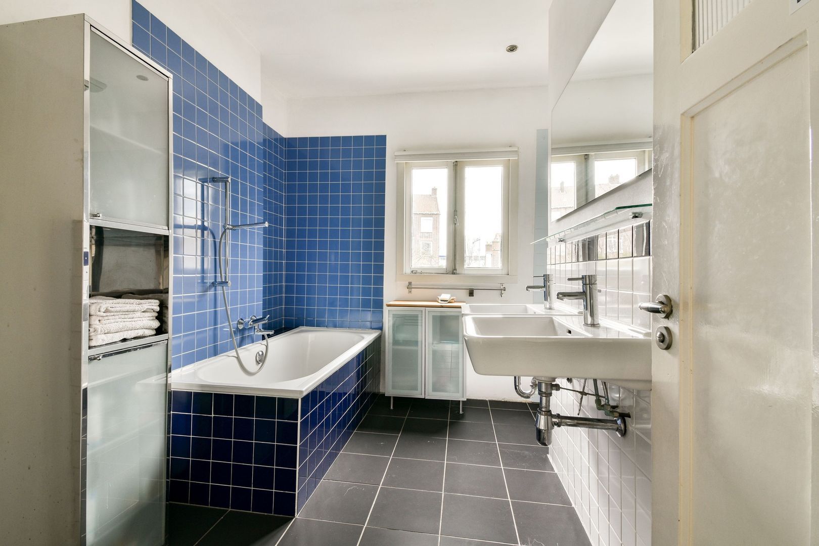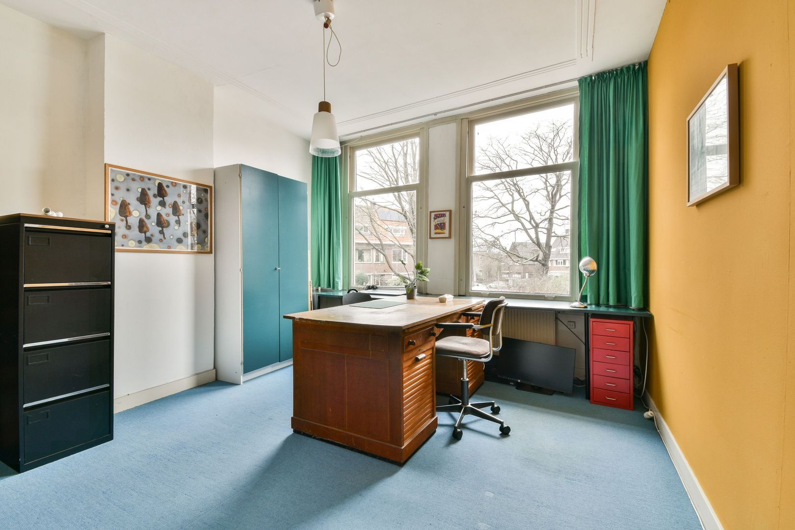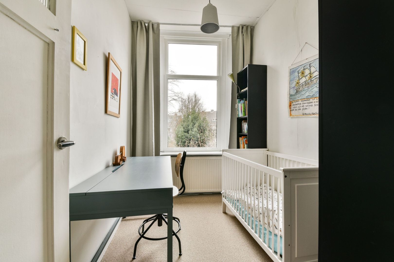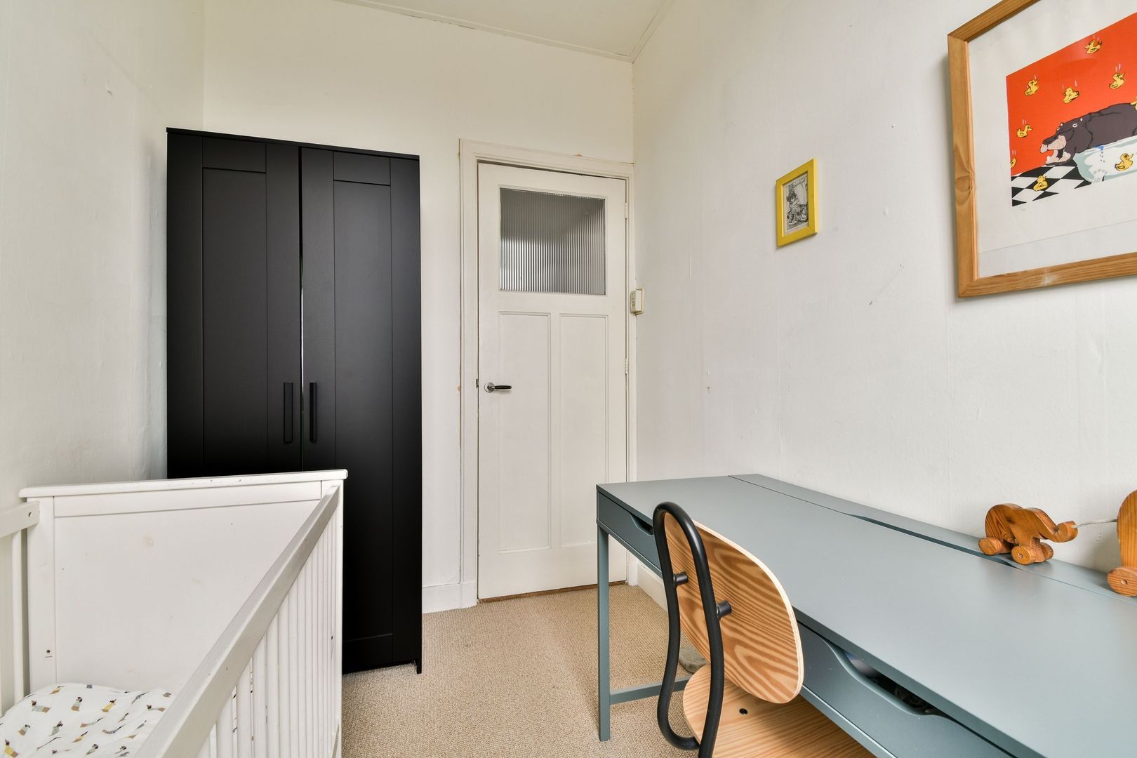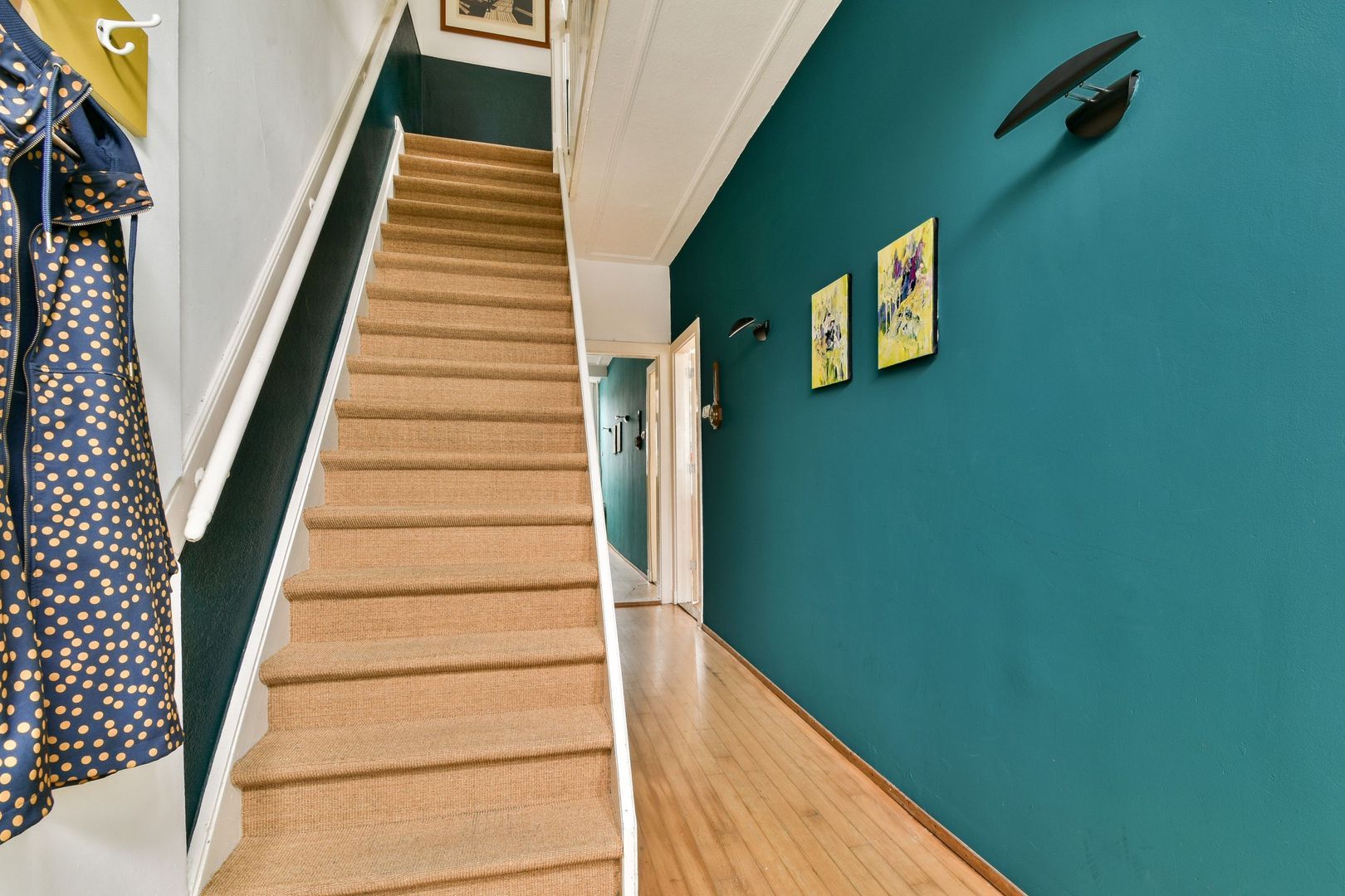 Overloop met toegang tot alle vertrekken van deze verdieping. Slaapkamer aan de voorzijde van ca. 16 m2. De tweede (slaap)kamer aan de voorzijde is bijna 6 m2 groot. Aan de achterzijde ligt een slaapkamer van ruim 11 m2 met openslaande deuren naar het balkon. Ook hier weer glas-in-loodramen met voorzetramen. Vanuit deze slaapkamer is de ruimte trapkast toegankelijk.