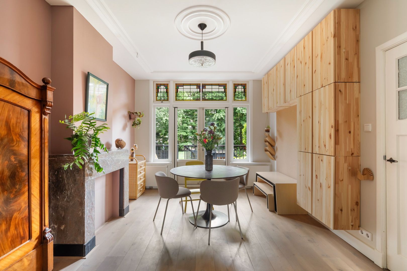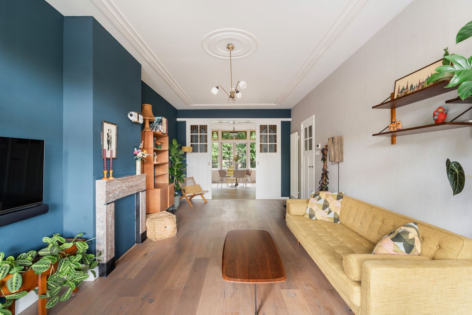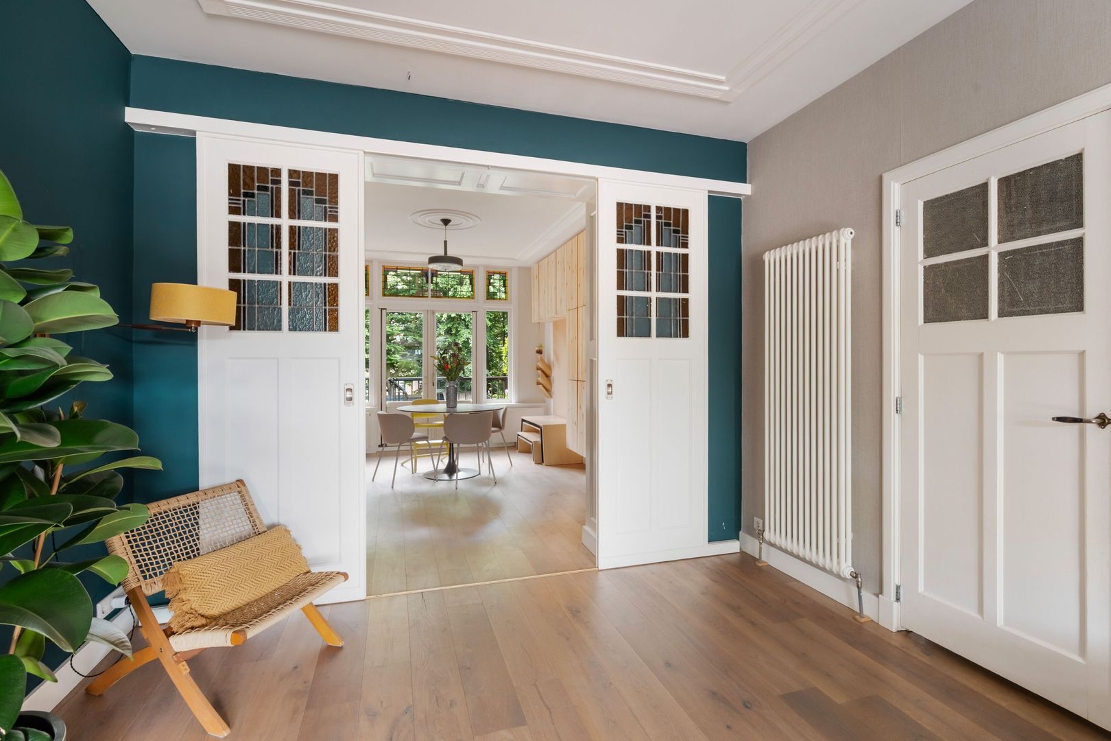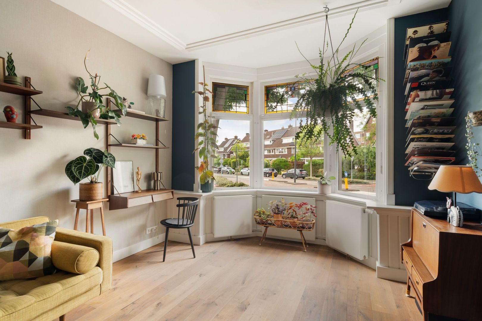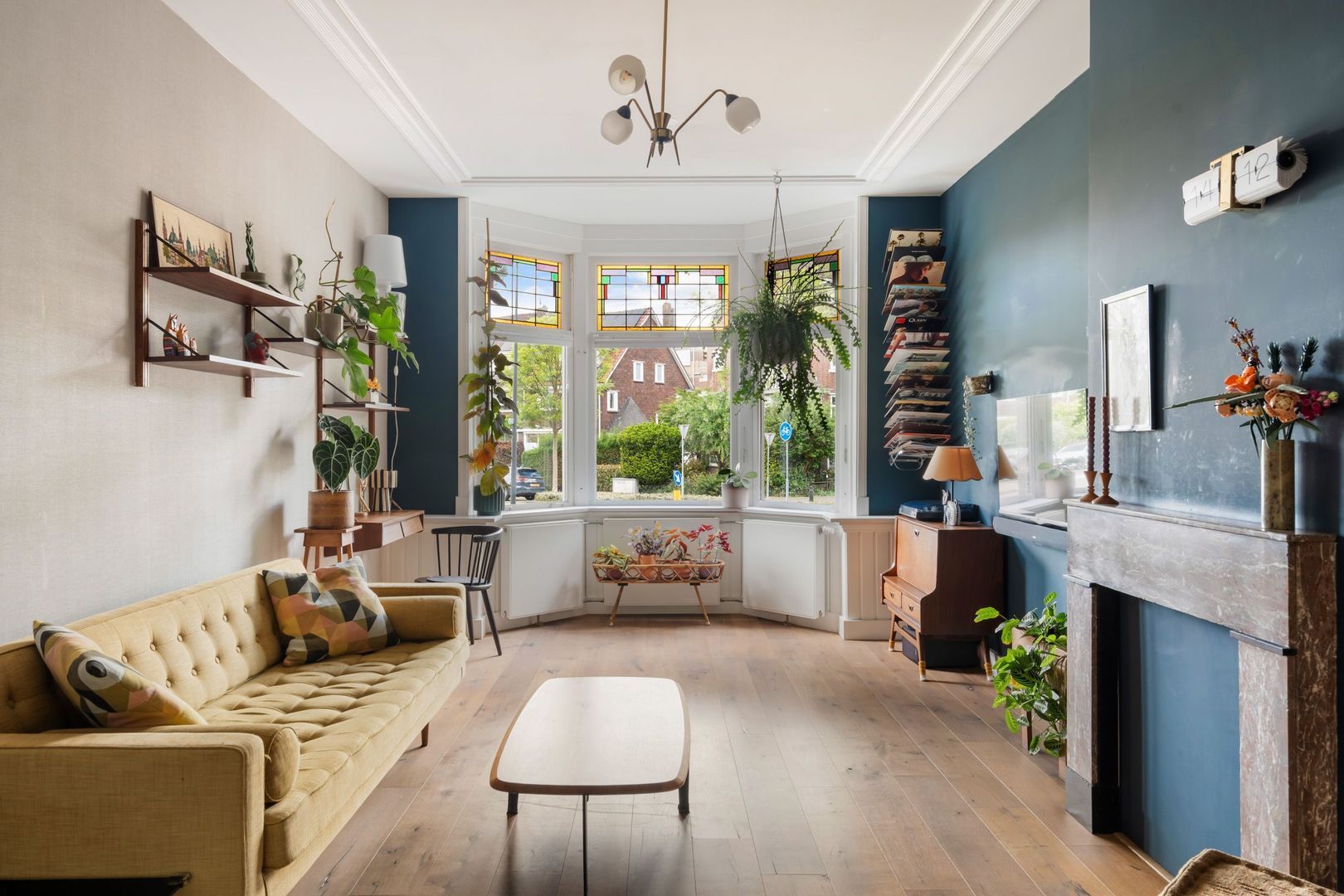 De royale woonkamer van 42 m2 heeft een mooie gerookt-eiken parketvloer, gestucte wanden en plafond, die ook voorzien zijn van ornamenten. De erker met vrij uitzicht in de straat is voorzien van glas in lood-ramen, geplaatst in HR++ dubbel glas.