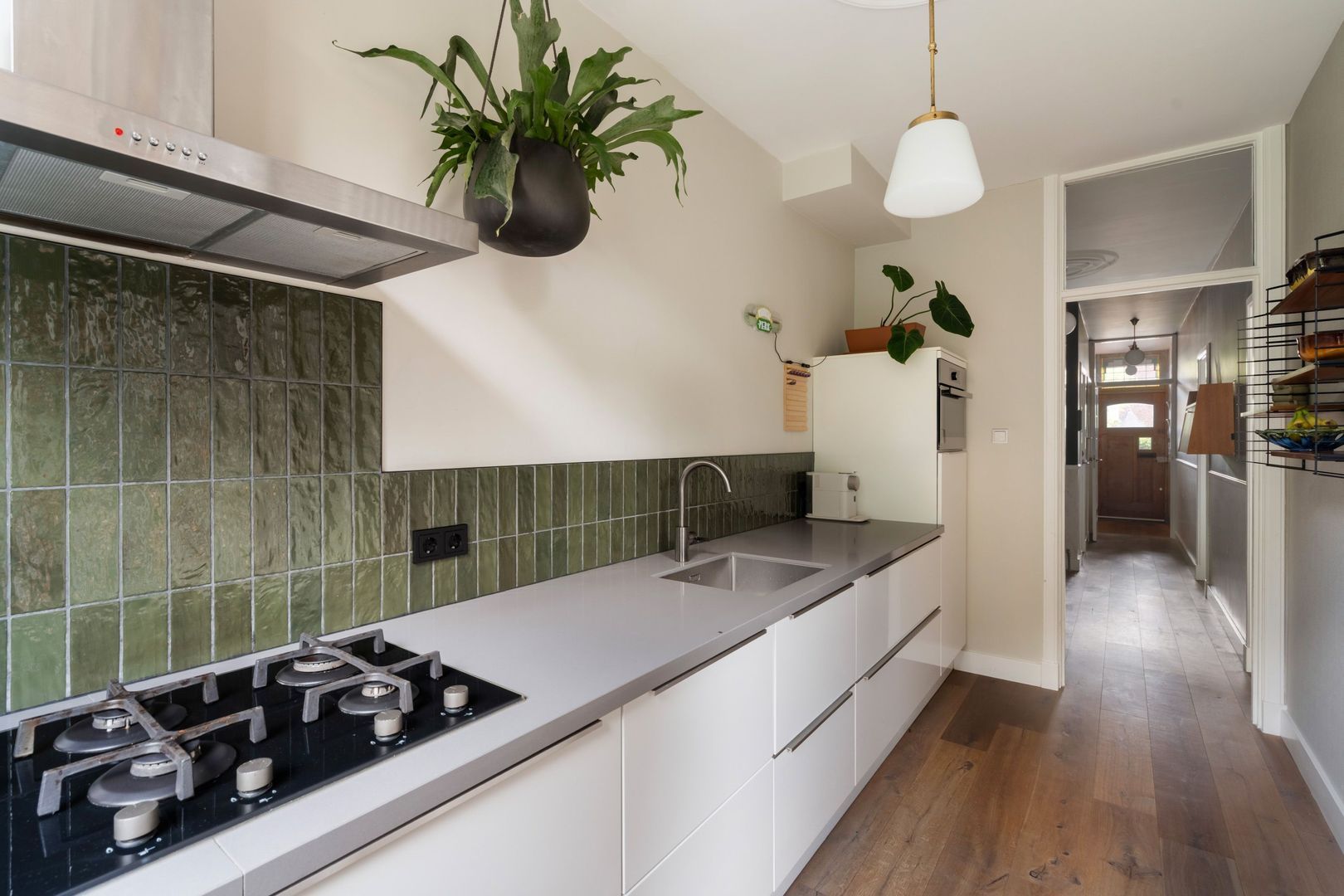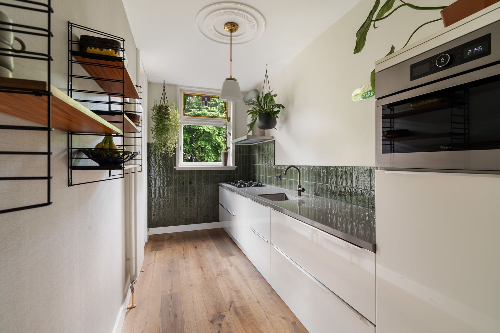 De ruim opgezette moderne keuken heeft een composiet aanrechtblad, witte hoogglans fronts, een leuk betegelde achterwand en de volgende inbouwapparatuur: 5 pits-gaskookplaat, koelkast, combi-oven en vaatwasser. Verder zijn er brede lades (120cm), een designradiator en een elektrische screen. Vanuit de keuken is er ook een deur naar het balkon. Het balkon meet 5 m2 en heeft een stalen buitentrap naar de lager gelegen tuin.