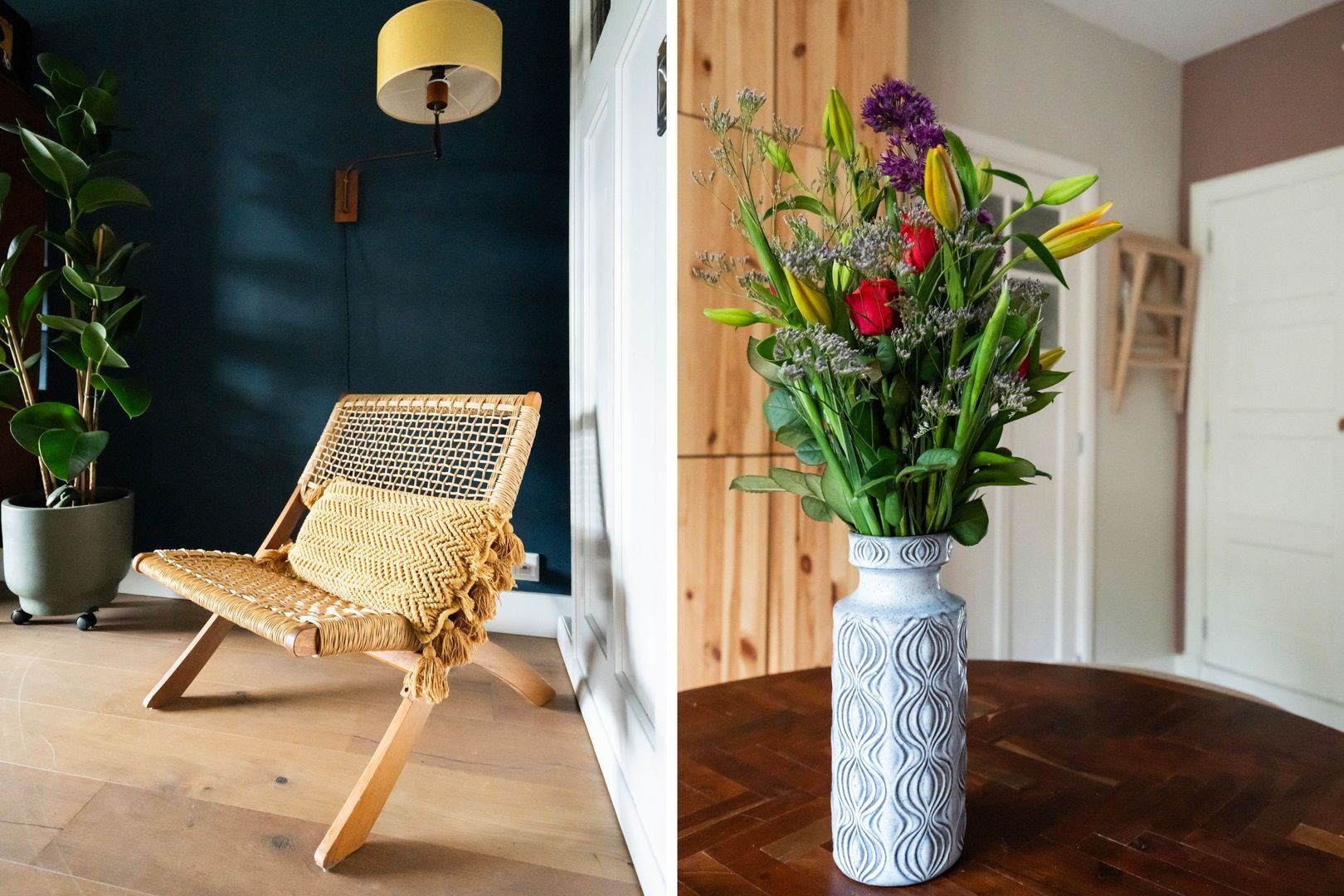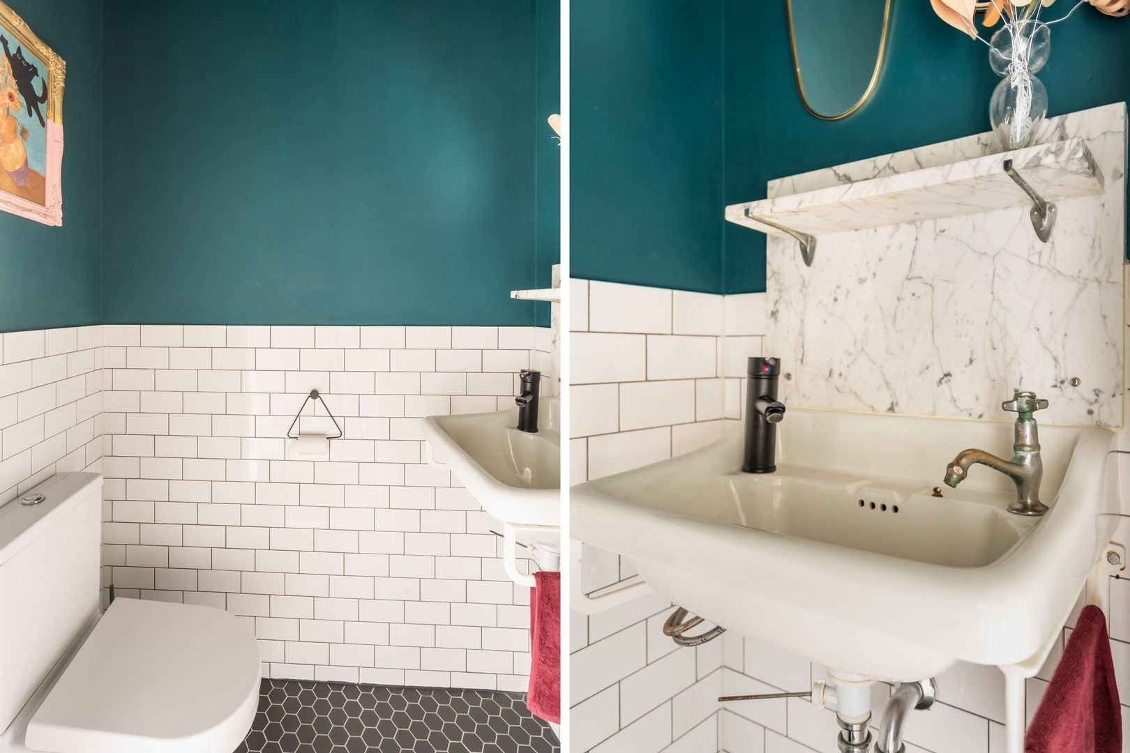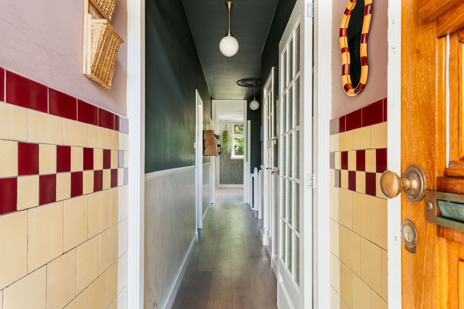 Entree, tochtportaal met authentieke wandtegels, gang met garderobe, kastruimte, lambrisering met marmerlook, moderne toiletruimte met wasbakje en metrotegel.