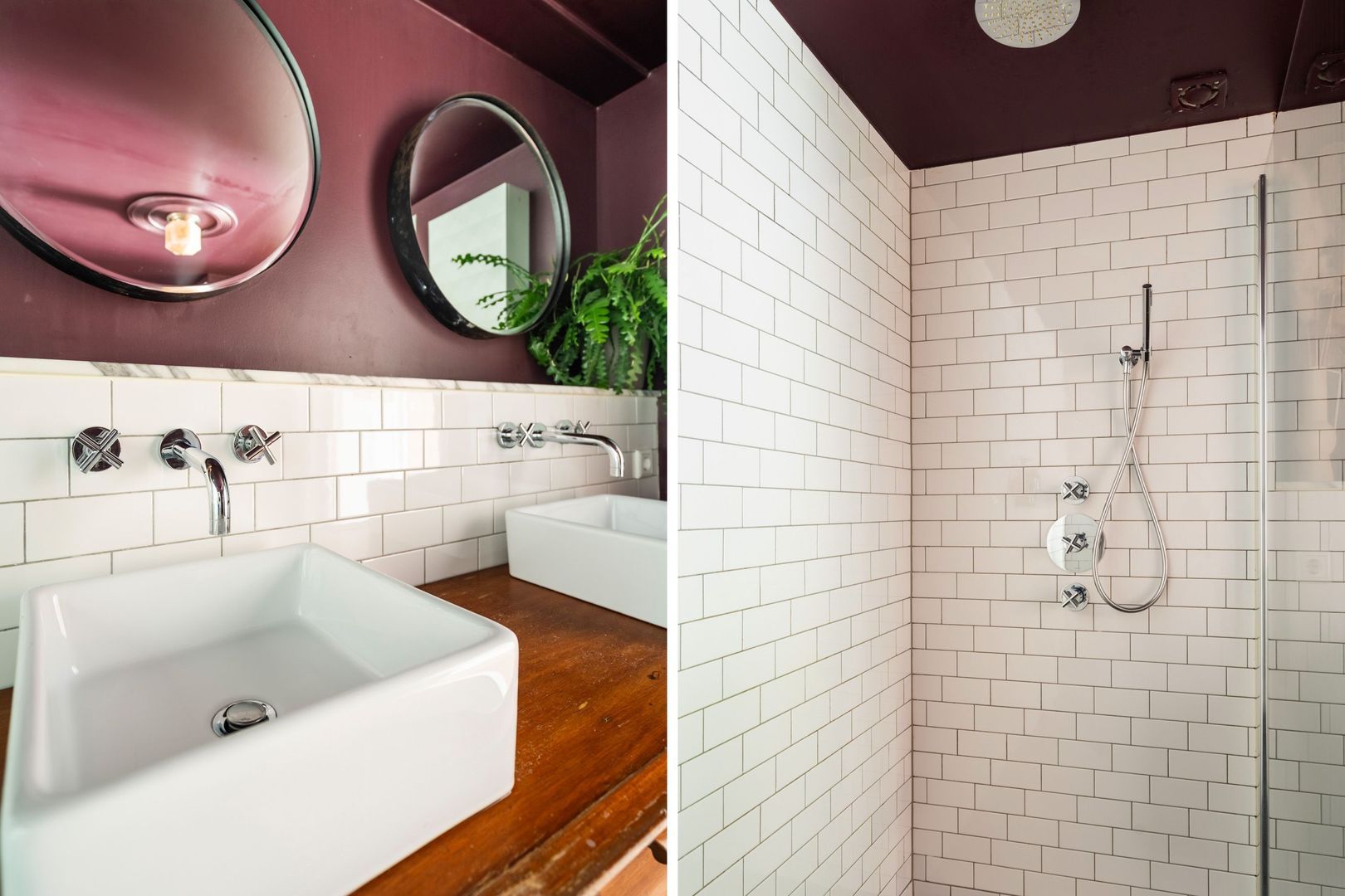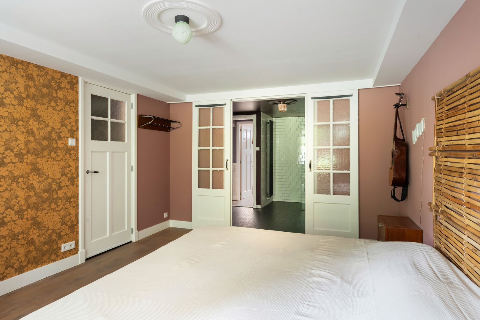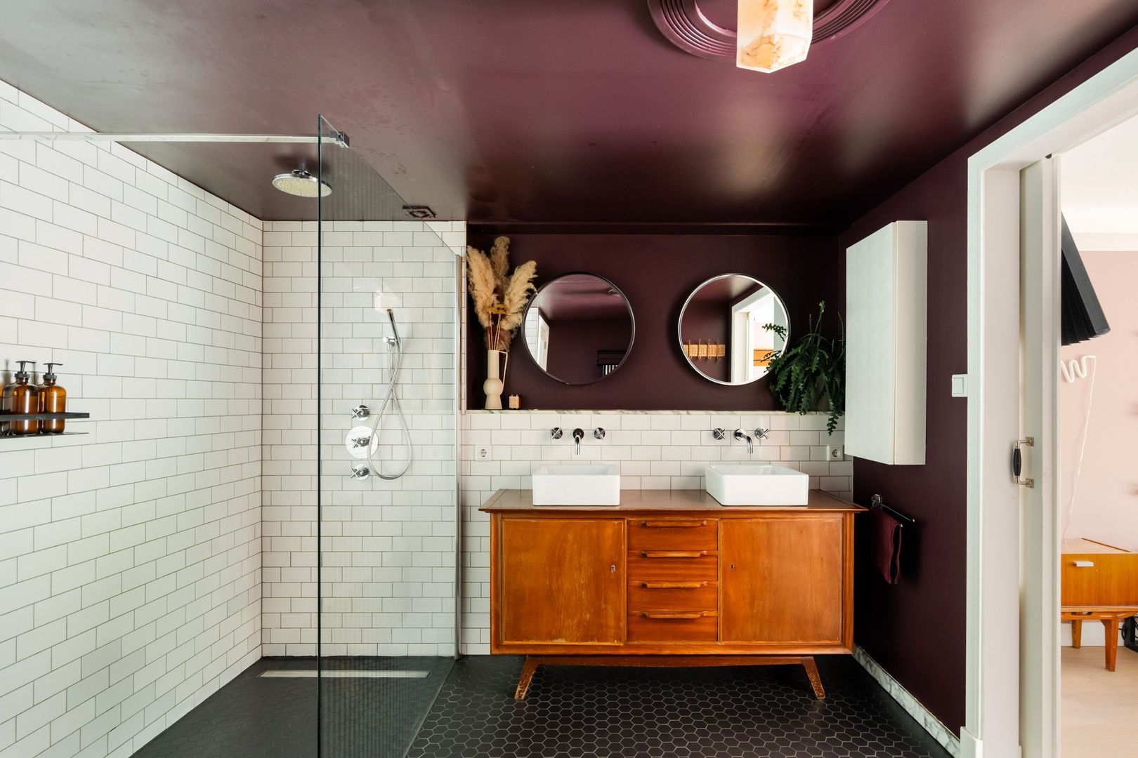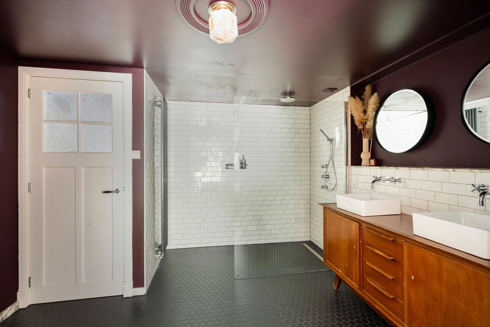In het midden zit de zeer ruim opgezette badkamer met grote inloop-regendouche met watergoot, breed jaren zestig badkamermeubel met dubbele kom en mozaïek vloertegel met elektrische vloerverwarming. De badkamer is bereikbaar via de gang, maar ook via de en suite met de slaapkamer aan de achterkant.