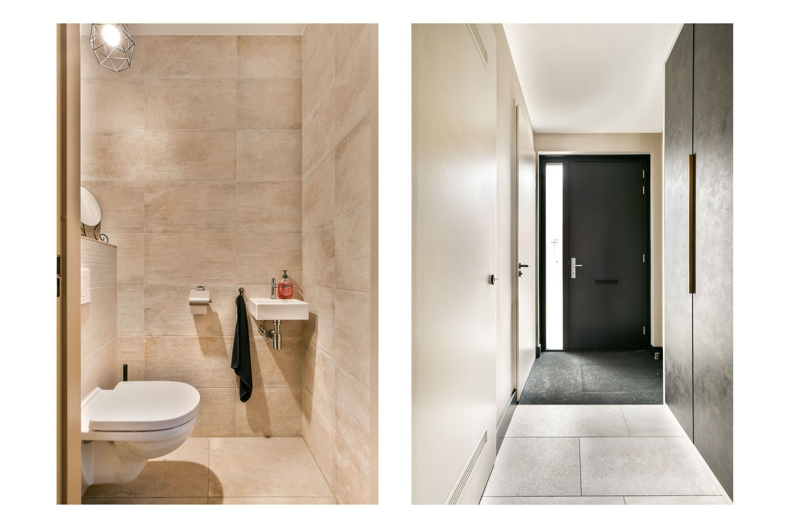 De exclusieve badkamer is ca. 6,6 m2 groot en is voorzien van luxe betegeling, een breed wastafelmeubel met dubbele kom, spiegelkast met inbouwverlichting, zwevend toilet en grote inloopdouche met watergoot, comfortabel ligbad, handdoekradiator en een groot raam met natuurlijk daglicht.